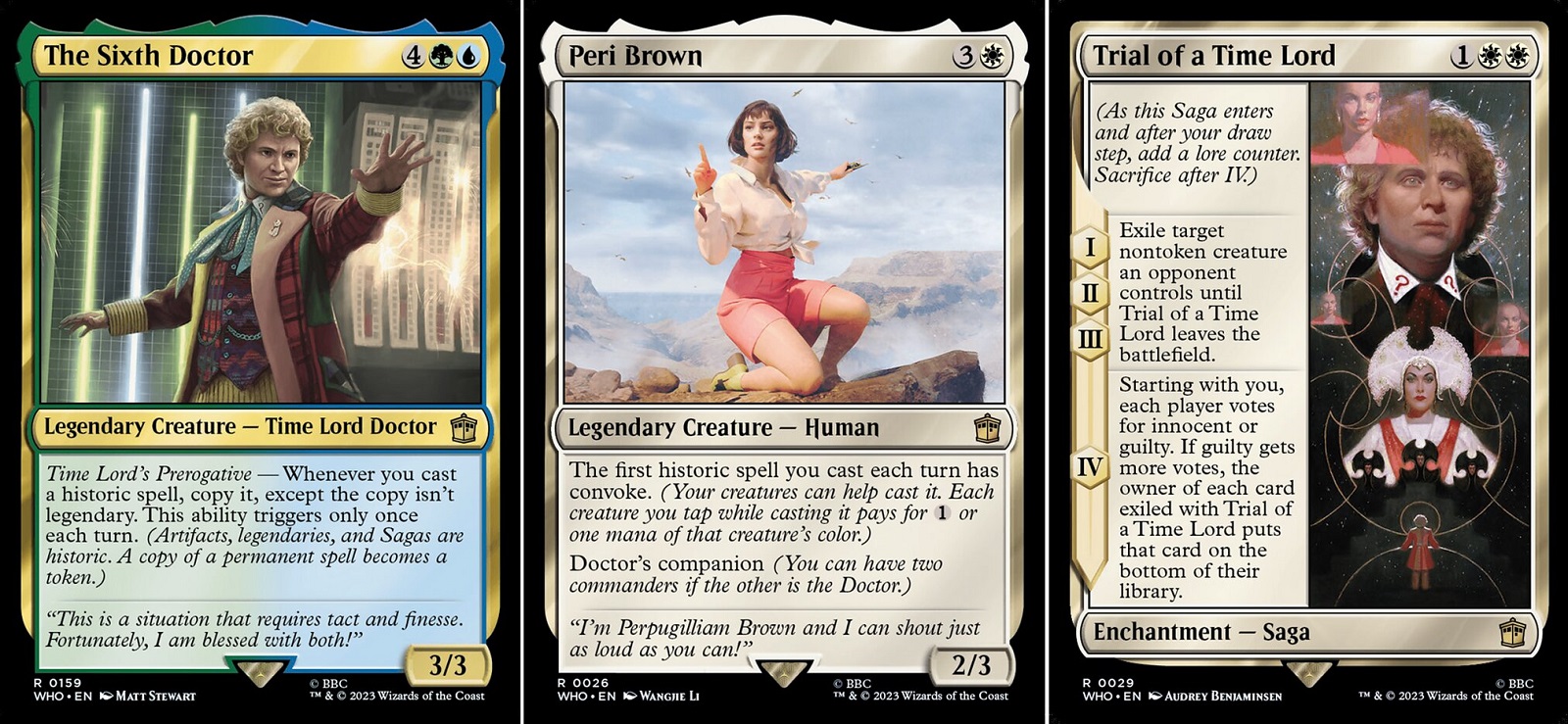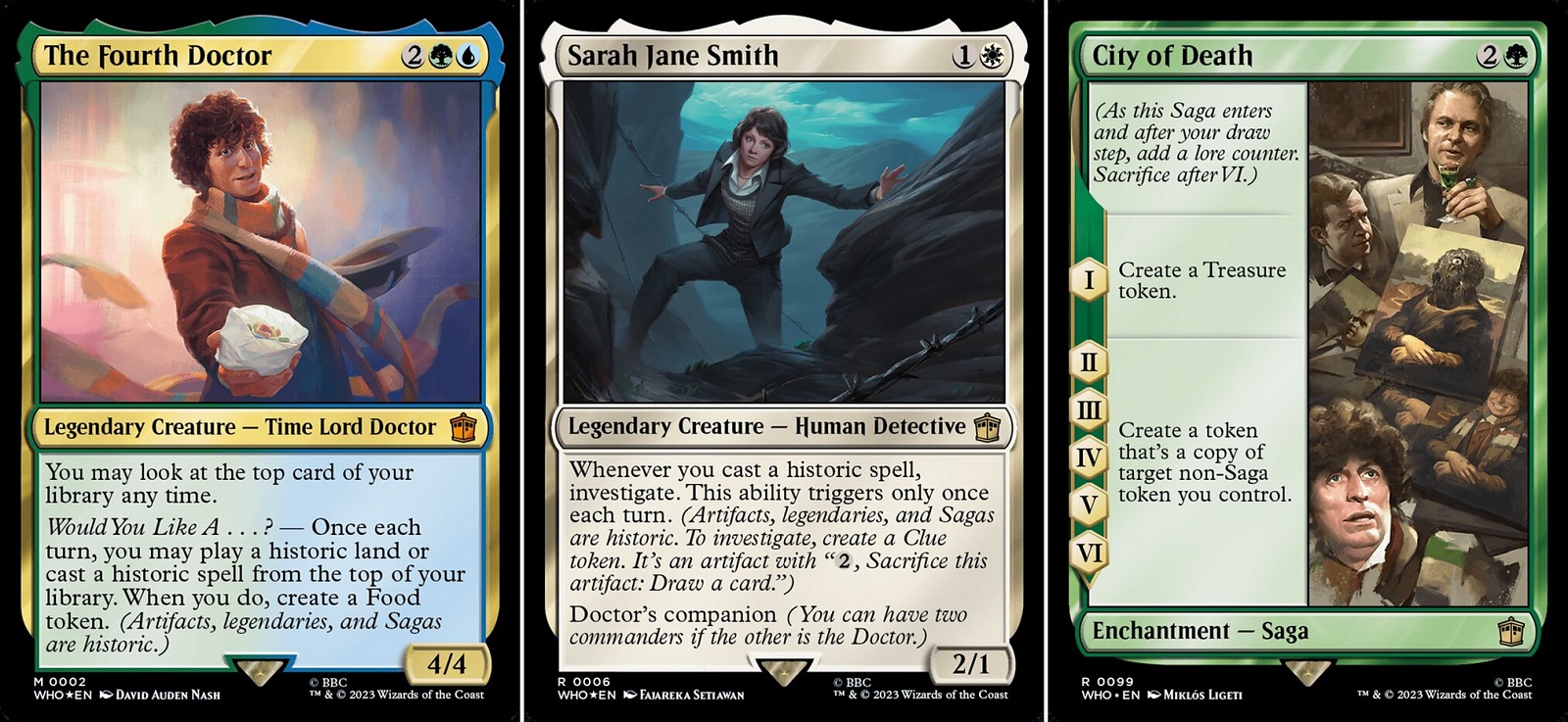 Starting with Blast from the Past, this deck represents the original run of the show containing Doctors 1-8. This deck contains the highest density of Doctors and companions. Across all of the decks there are numerous Sagas for hallmark episodes of the show and these Sagas are most important for Blast from the Past. This deck also has a historic theme where the player will generate additional value from artifacts, legendaries, and Sagas. Thus it comes as no surprise that this deck is crammed full of historic cards. Blast from the Past focuses around playing out your many historic permanents until you’ve overwhelmed your opponents through creatures. If you like playing creatures and synergizing them, this is a great deck for you. Creature strategies tend to be more straightforward, but with so many historic triggers even this deck can be a lot to remember.
