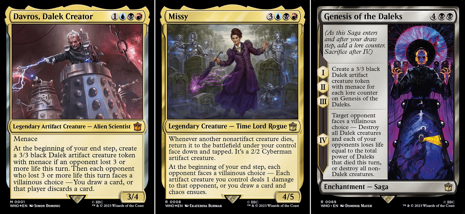 Masters of Evil is a deck that wants to attack every other player at the table. Thematically this deck contains all of the major villains from Doctor Who. This is an aggressive deck that rewards itself for dealing damage to other players. Masters of Evil has a lot of ways to push damage through its evasive creatures and its Villainous Choice mechanic. With Villainous Choice, the other players either have to lose something or let you gain something. This is a fun design space as everyone reacts differently to a bad choice. For me, Villainous Choice is the type of design where Universes Beyond excels as this mechanic is flavorful and fun. If you like being the villain at the table, this deck is for you. Since this is an aggressive deck, Masters of Evil keeps the game going and forces the other players into the game rather than sit back until they can win outright. If the other players don’t do something, the masters of evil will win.