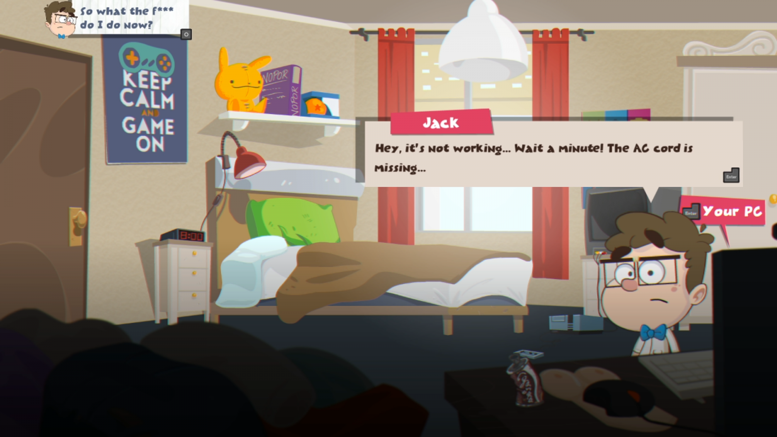Since we have our three characters who essentially represent the main three aspects of the game, I’d like to do something different and assign evaluations to them. For starters, Jack, you had some neat ideas and ambition, but you didn’t execute them that well. The game runs fine and I enjoyed playing it for the most part, but the minigames are where my frustrations set in. Add in some clearer instructions and control schemes next time and you’ll be way better off. Ethan, the music and sound design was fine, especially when trying to imitate other games. Some voice acting could be good, but I won’t knock you for it. Violet, you are the clear star here to me. The entire art style of the game is a wonderful walk into a deceivingly cute yet truthfully crude world that I loved partaking in. It was easily my favorite aspect of the game. Adding onto that, Indiecalypse takes around three hours to beat if you can get past some of the frustrating minigames. If you want to give it a go, be my guest, but I’d probably wait until either the price goes down or some clearer instructions get added into the game.