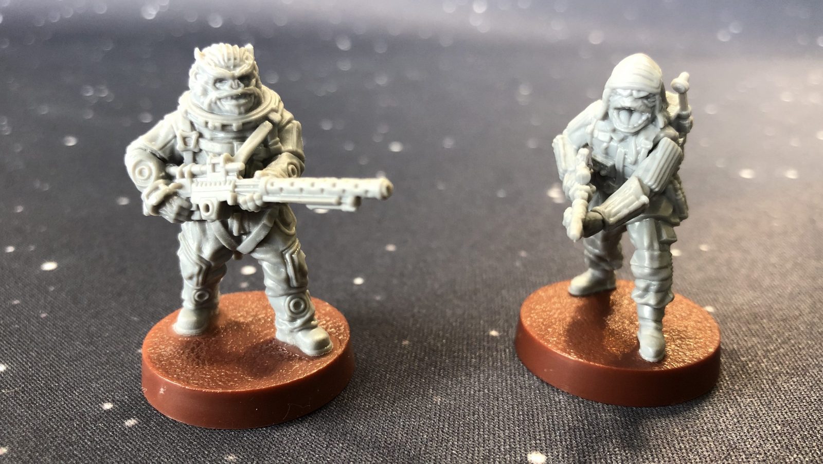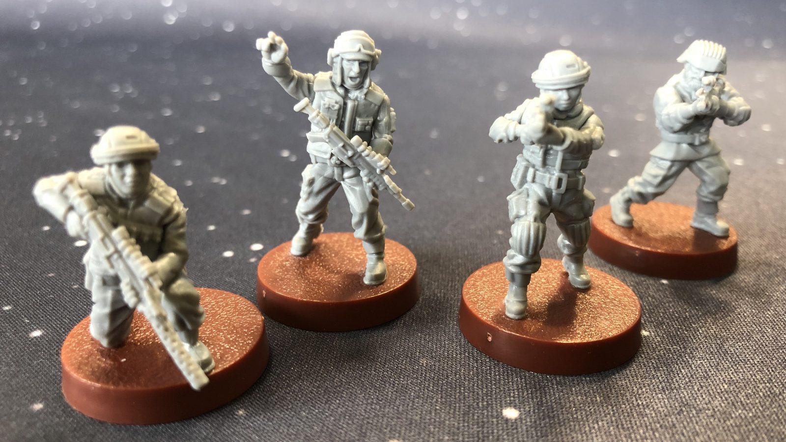 Both expansions come with Fantasy Flight’s excellently produced minis. The four basic Pathfinders look good, with dynamic poses and uniforms that are similar to the core set Rebels in appearance (read our review here). The Pathfinders also come with two optional heavy weapons minis, both aliens that you will recognize from the movie and who, it turns out, are named Pao and Bistan. Bistan’s alien features are a nice plus, but the mini’s pose feels a little static. Pao’s mini is the highlight; he looks menacing with his mouth agape showing rows of pointy, alien teeth and an aggressive firing stance. Jyn Erso’s mini is outstanding, but is also one of the more challenging Legion models to put together. Her scarf and the tonfa make her instantly recognizable across a crowded battlefield, but I found the scarf parts did not really set well against the mini and have some weird gaps that took green stuff to clean up. Overall, the minis are great with little work to assemble and drop into the battlefield, and a pile of cards come with them to give you all the options you need to augment your army.