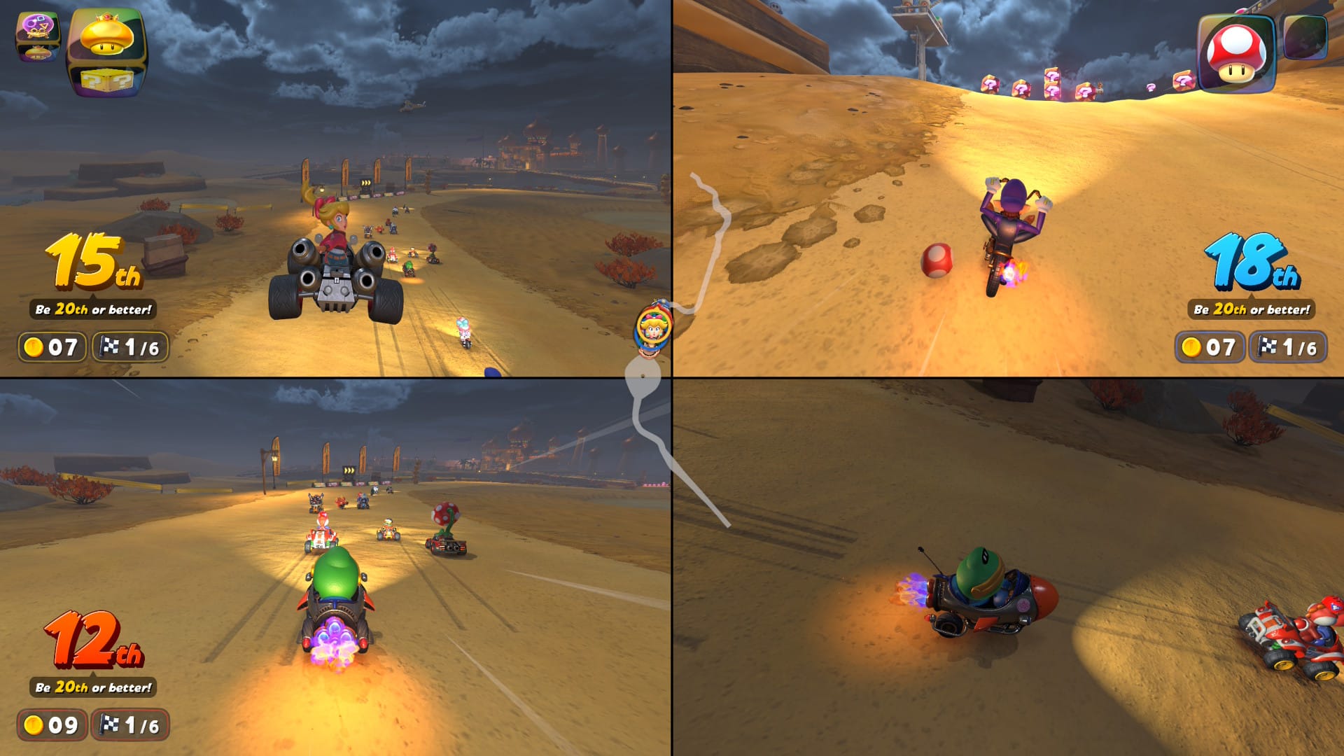 Whatever mode you're playing, there is a lot of jockeying for first and especially second place. With the jump from 12 racers to 24 comes double the items, so there’s tons of shells, bananas, lightning bolts, feathers, coins, and mushrooms in play at all times. There are plenty of returning items in addition to new ones like the feather which lets you instantly jump to access shortcuts or the golden shell which speeds forward leaving a trail of coins behind it. They all add a bit of moment-to-moment strategy to the game, like do you keep a shell to protect you from other racers items, or throw it to potentially slow down the person ahead of you?