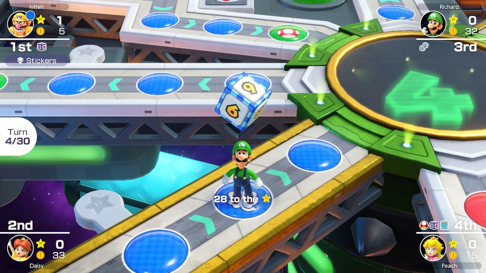 Completing a game earns you XP, with each star collected earning you additional bonus XP. This XP levels up your Mario Party level and unlocks new items at Toad’s shop, located in the hub world. The hub world also features a data house, Mt. Minigames, and your friend’s house. The data house allows you to view memories from past adventures or check your gameplay records. This is also where you design your online card, which can be customized to show your favorite character, game board, minigames, current level, playtime, and more. Toad’s shop sells encyclopedia pages, music tracks, stickers, which can be used to communicate during gameplay, and card backgrounds, which are used to customize your online card. Mt. Minigames allows you to tackle just the minigames without needing to run through a game board, while selecting your friends’ house allows you to compete against friends online.