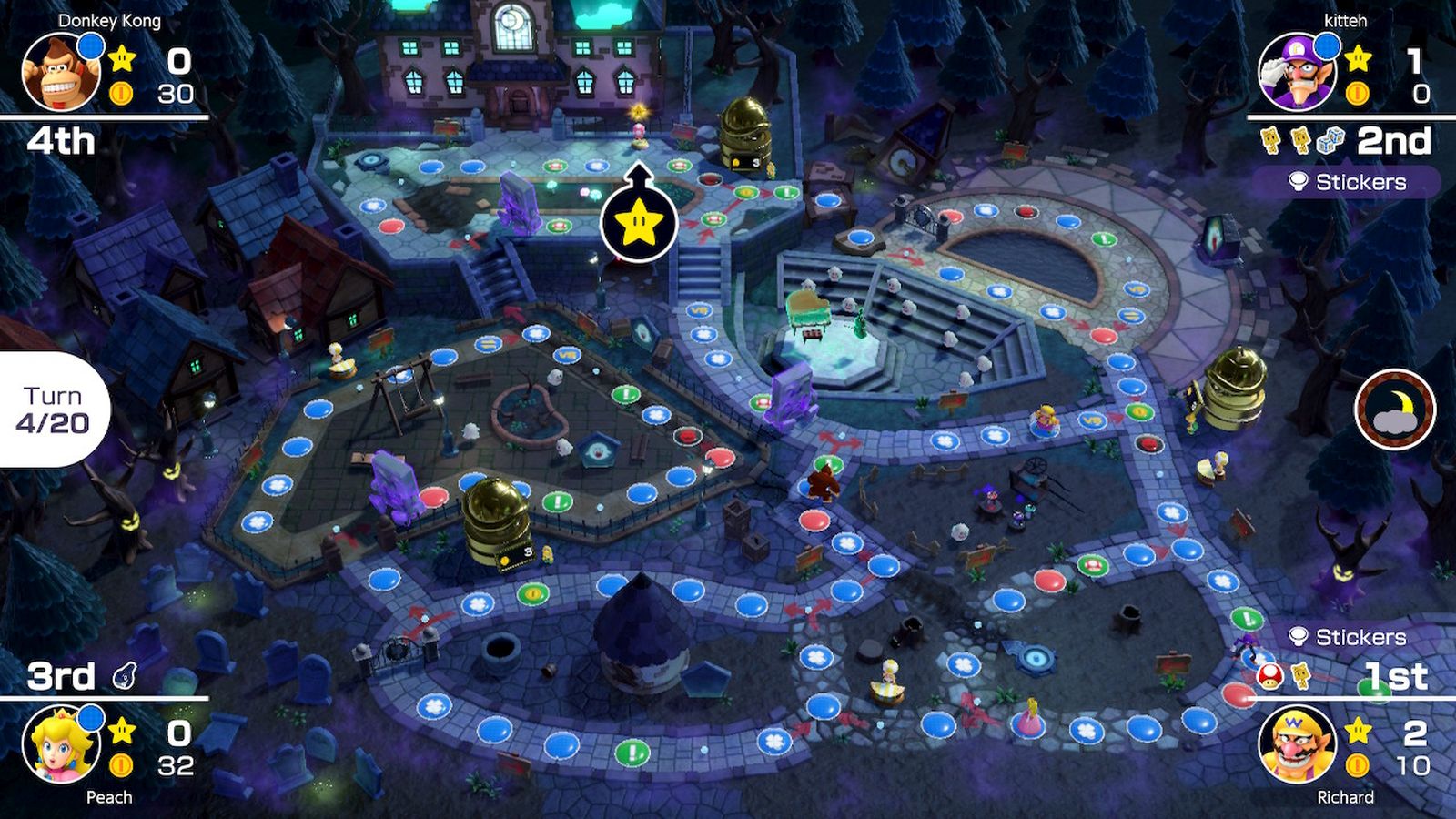 Mario Party Superstars improves on essentially every aspect of the previous Mario Party entry. Games are fast-paced, with characters moving quickly and options to turn on fast text and movement to further speed up the gameplay. The five boards differ greatly and offer unique experiences, allowing for longer playing sessions whereas the previous entry had an issue with each game playing out essentially the same despite the board you chose. Yoshi’s Island is the most straightforward board, featuring two areas connected via a bridge guarded by Whomps, which charge a fee to pass that gradually increases each time a player pays. Space Land features a giant timer in the middle of the game board which counts down each time a player passes it, eventually firing a massive laser from a floating Bowser head that steals all coins from any player in its path. Peach’s Birthday Cake features a Goomba which sells you a seed which is then planted to determine which path you will take. Most seeds just send you back into your original loop, although the Bowser seed takes you down another path filled with perilous spaces to land on, and Bowser himself who will steal your coins for various items. Woody Wood’s is a giant maze comprised of multiple paths which change direction after each minigame. Finally, Horror Land features a day and night cycle which switches up the paths you can take and events or characters you may encounter.