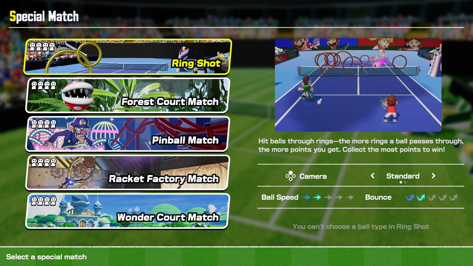 Mix It Up is a grab bag of Special Matches like Ring Shot (hitting the tennis ball through rings with your opponents to gain the most points), Racket Factory (goal to try and hit the lit up squares), as well as three others. You also have Score Matches, which include Co-Op versions of Ring Shot and some hitting the ball back challenges with Auto Tennis and Piranha Plant Challenge. While these are not super difficult, they're fun, and most can be played with two to four people.