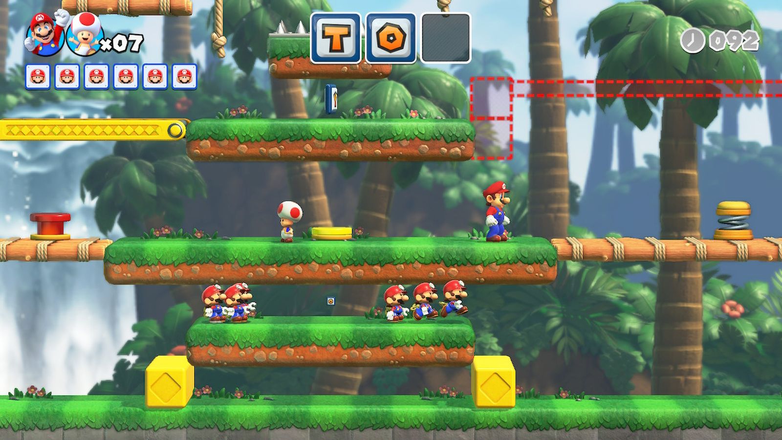 Once the six base levels of a world are complete, you unlock a Mini-Mario based level. In the Mini-Mario based levels you are followed by the six Mini-Marios you rescued during your jaunt through that world, and you must lead them through the level to obtain three letters, which spell out T-O-Y. To do so you must find ways to secure a safe route, as the Mini-Marios can be killed by the levels’ enemies and obstacles. Once you have obtained all three letters, you must then lead the Mini-Marios to a chest. I found these levels to be quite fun and a welcome change from the base world challenges. It’s a pity that they are relatively short. It was a nice surprise to find that the plus worlds, which are unlocked after completing the base game, do throw a Mini-Mario into each level to provide an extra challenge.