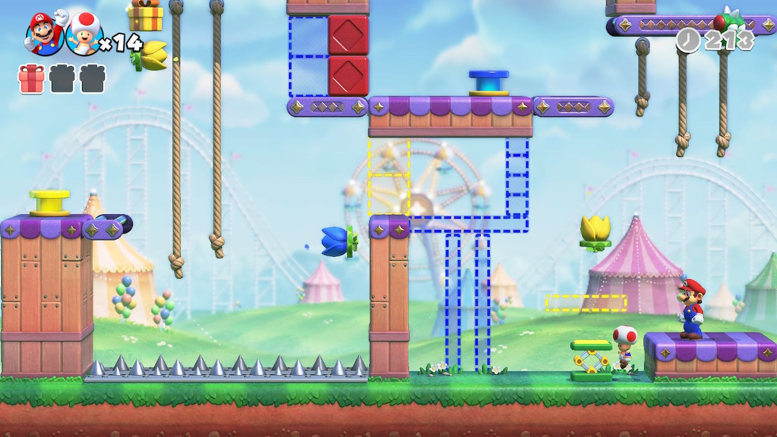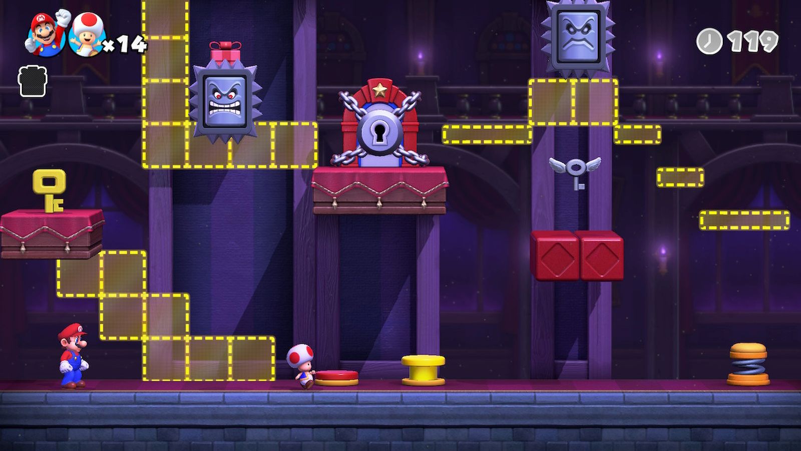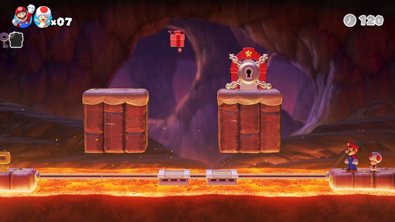 I mentioned completing a perfect run, so let me explain. Each level allows the player to obtain either a silver or gold rank, depending on if they completed all goals. For the base levels, those goals consist of finding the three presents, collecting the gold key (or both gold and silver keys if playing co-op), and saving the Mini-Mario. For the Mini-Mario level, that gold comes from getting all six Mini-Marios to safety without losing any. Finally for the boss fights, you must avoid being hit to obtain the gold reward. The number of gold rewards you obtain directly lead to the number of expert levels which unlock later. No worries if you don’t obtain a gold medal on your first run-through of a level, you can replay any level at any time.