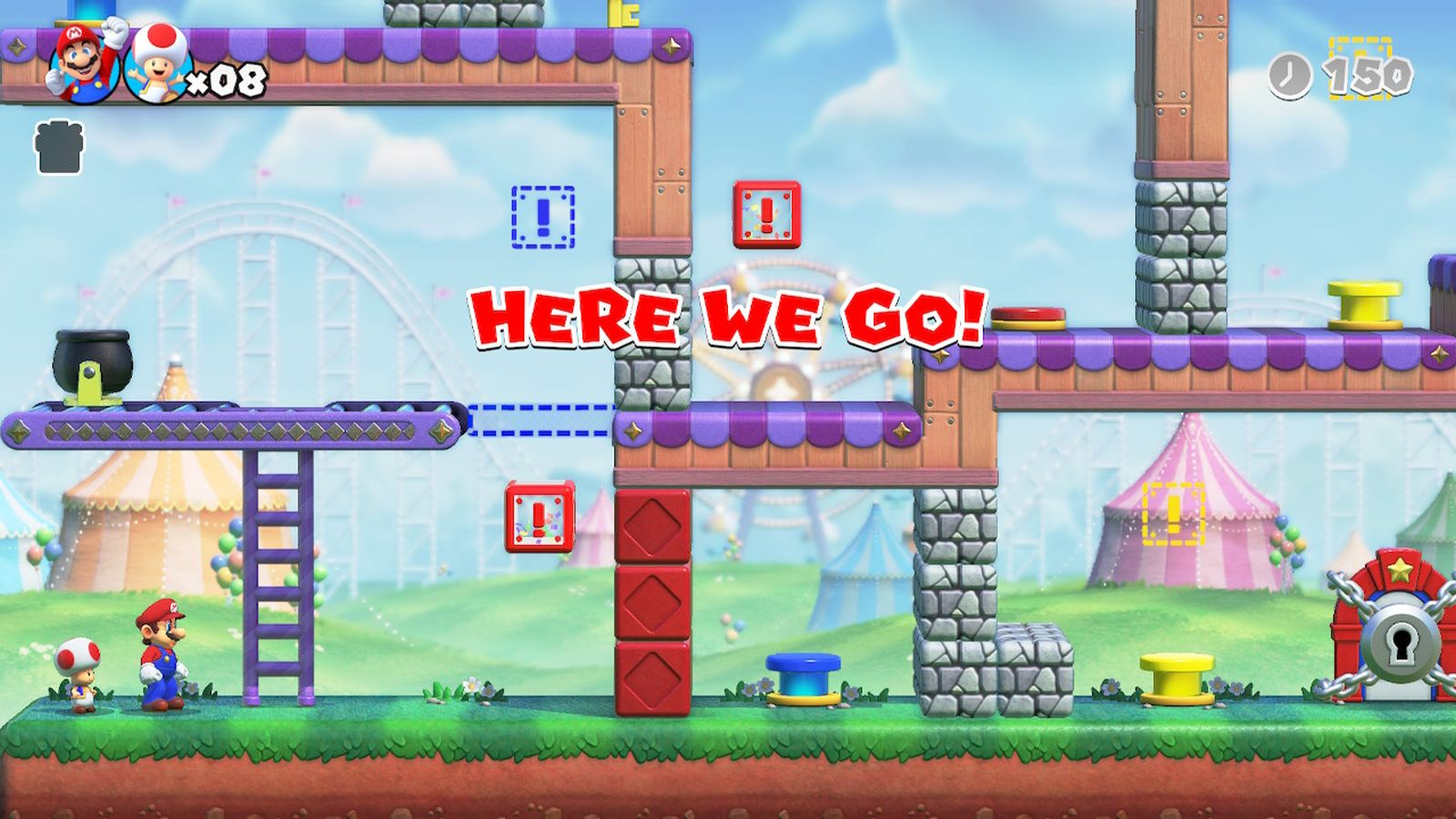 There are eight worlds to chase Donkey Kong through (not counting bonus worlds and expert levels), and each world consists of 9 levels: Six basic levels, a Mini-Mario based level, a boss fight, and a 1Up Room. The six base levels make up the bread and butter of the gameplay and are always divided into two sections. The first section involves Mario having to find a gold key (and an additional silver key if playing co-op), and one or two of the three hidden presents which are scattered throughout each level. When playing in co-op mode, the silver key, once obtained, follows your character around and unlocks a padlock blocking the exit door. The gold key is found in both solo and co-op modes and must be picked up and carried through the level to the exit door, and can then be used to unlock the exit. Once unlocked, you can exit the first section and head into the second section of the level. The second section contains the remaining presents which were not hidden in the first section, along with a Mini-Mario. The goal is to reach the Mini-Mario. You have completed the level once the Mini-Mario has been successfully rescued.