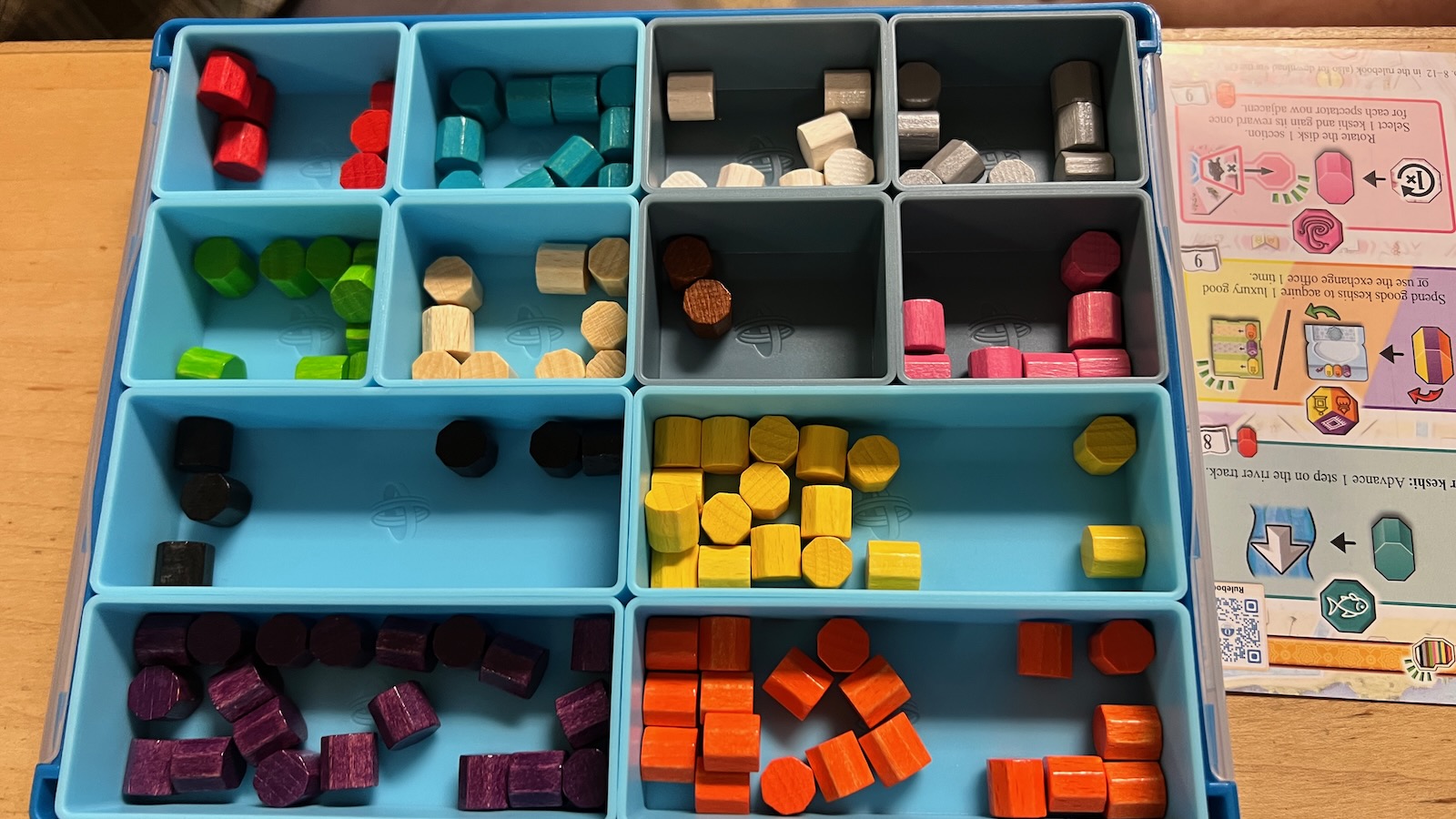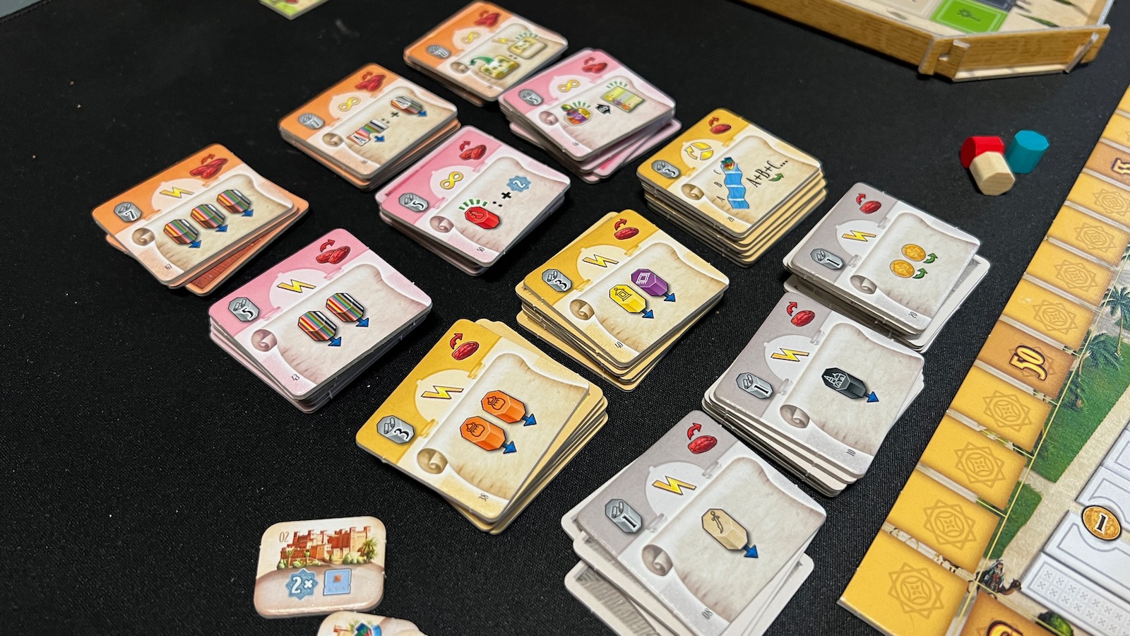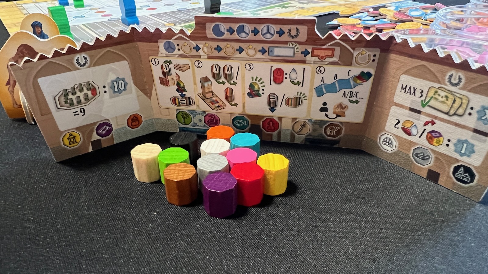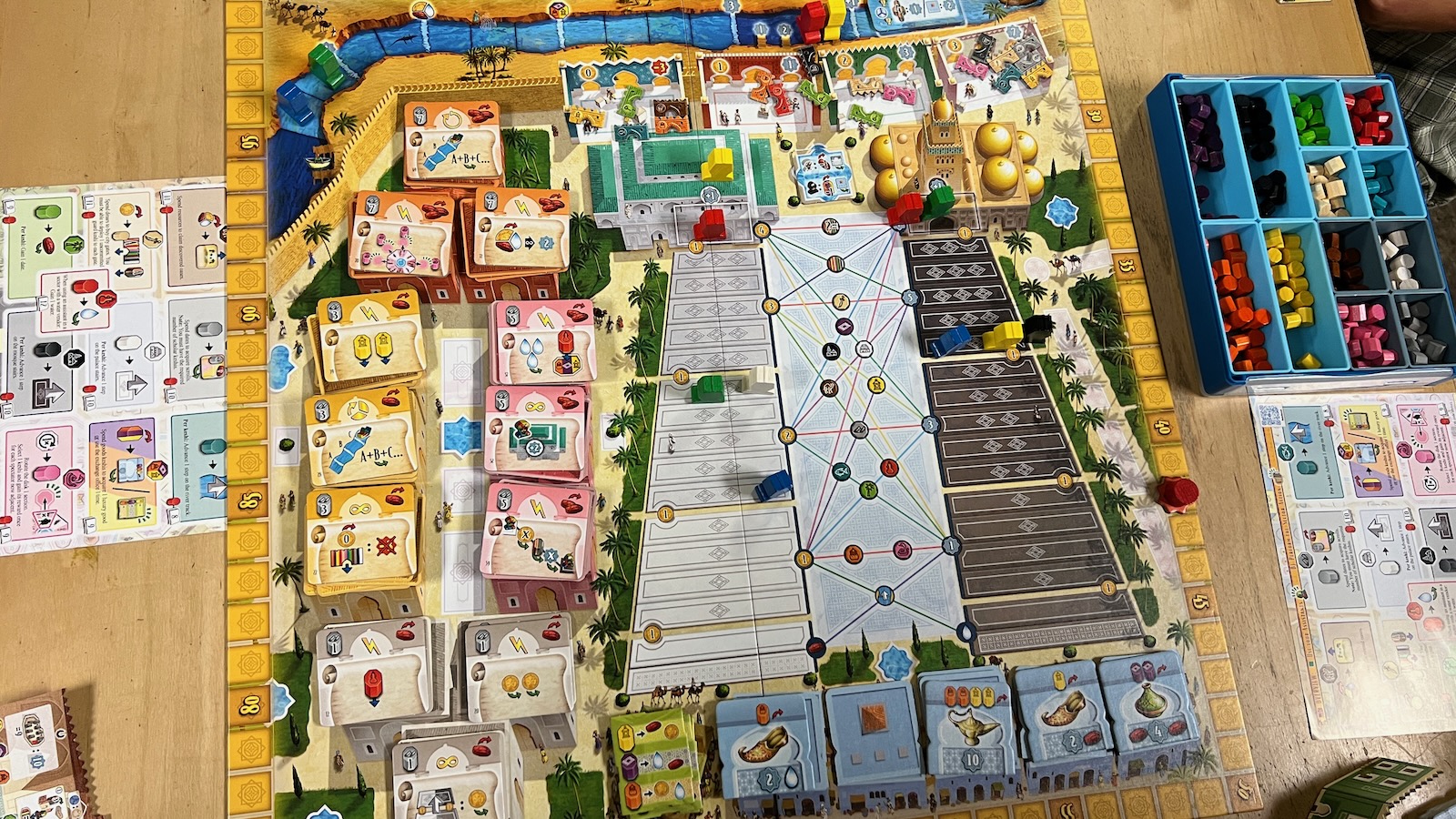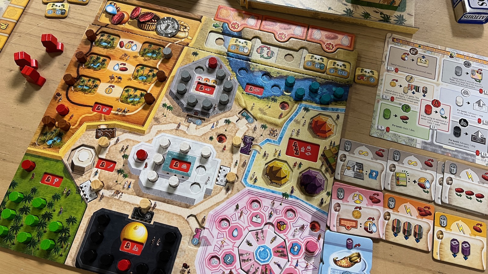 The most significant components of the game are colored tokens called keshis, which represent different areas of influence the family can use to improve their station within the city. At the beginning of each season, players are given 12 different colored keshis tied to different areas of their player board and the main board. Keshis are used to track upgrades, take actions, and even to buy goods depending on their color. Most of the game is played on the player boards where actions are tracked and different areas activated throughout the game. The main board houses the main scoring track, two tracks corresponding to the mosque and the palace, a river track, and various spots housing tiles that can be obtained through various actions.