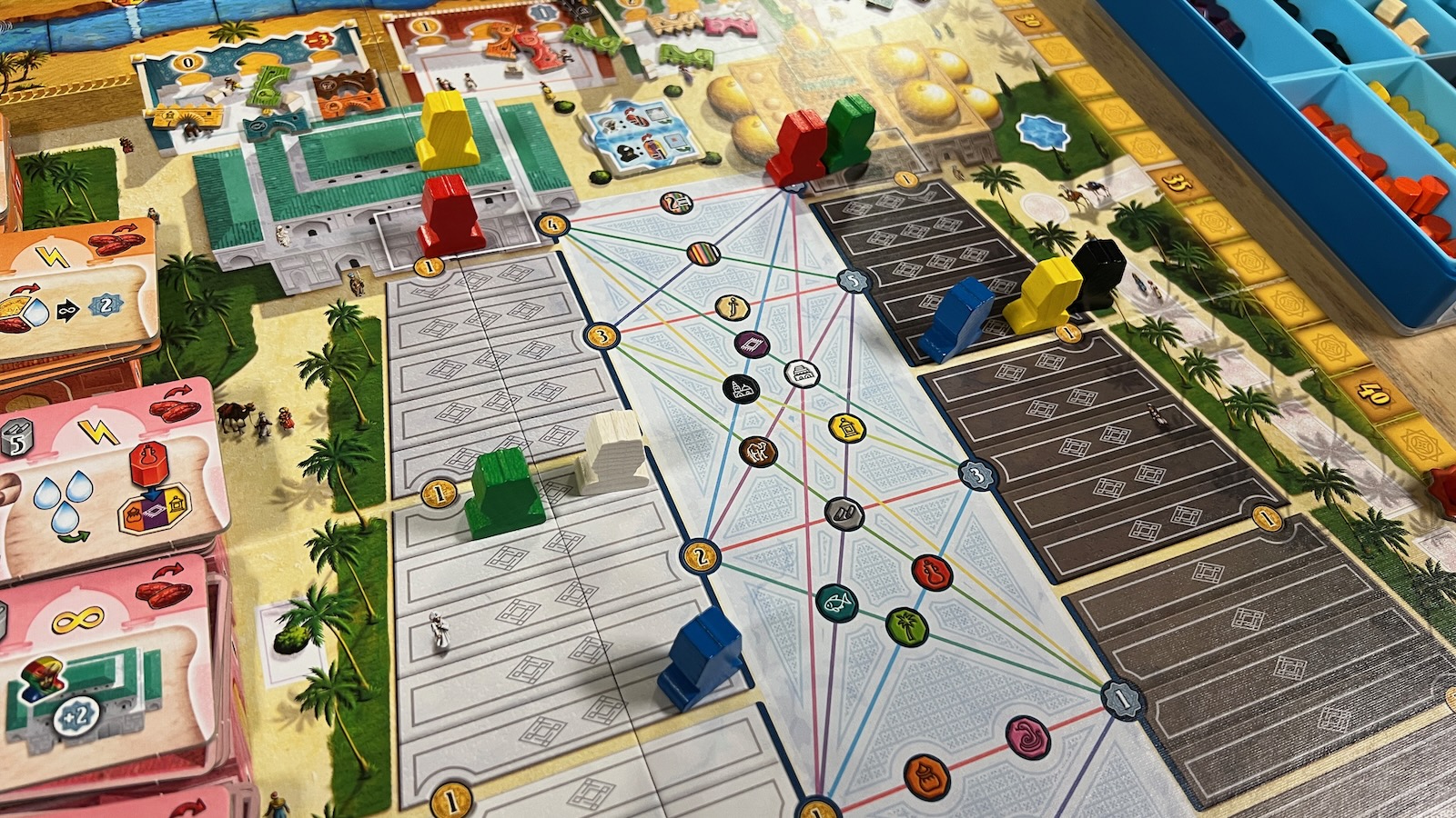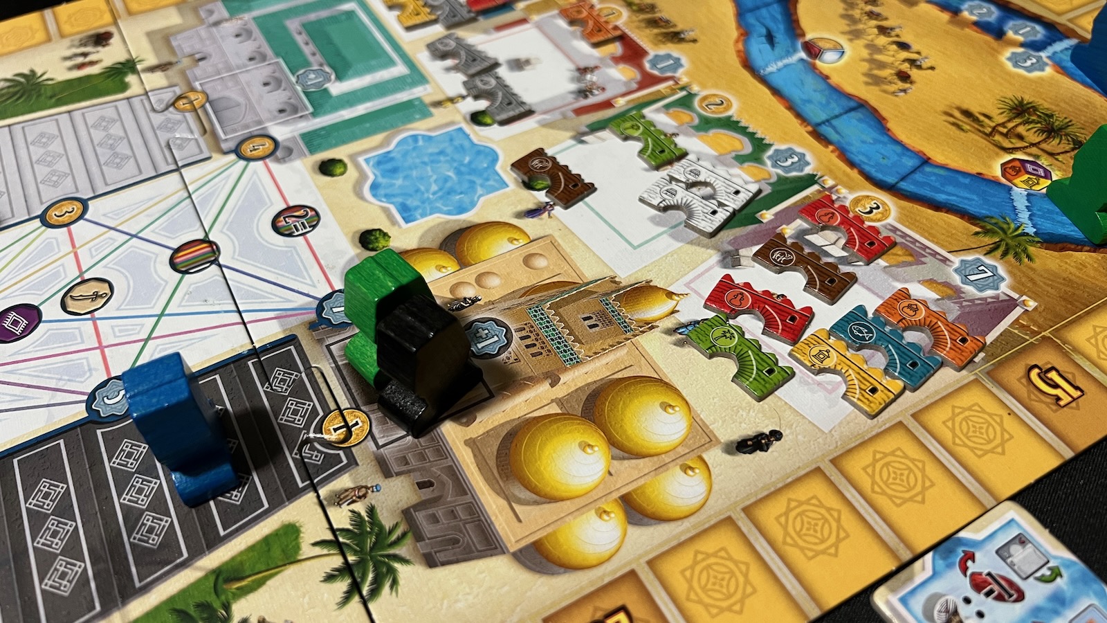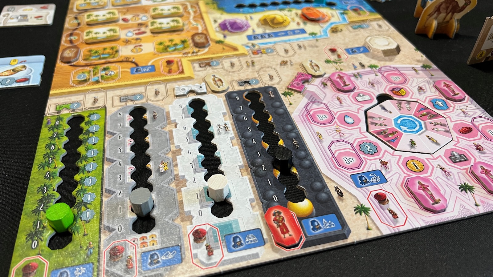 The real meat of the game comes in how you manipulate the keshis and the order of your actions. Many of the areas build up an engine to make actions more powerful given the number of keshis collected. For example, a green keshi gains you a point when collected and, when taking an action in the green date orchard section, you will collect a number of date resources equal to the amount of green keshis you have collected throughout the game. This also comes into play when activating the mosque, palace, and river areas by moving pawns up different tracks corresponding to the number of keshis collected in each section. Each section has its own unique aspects that help you gain points.