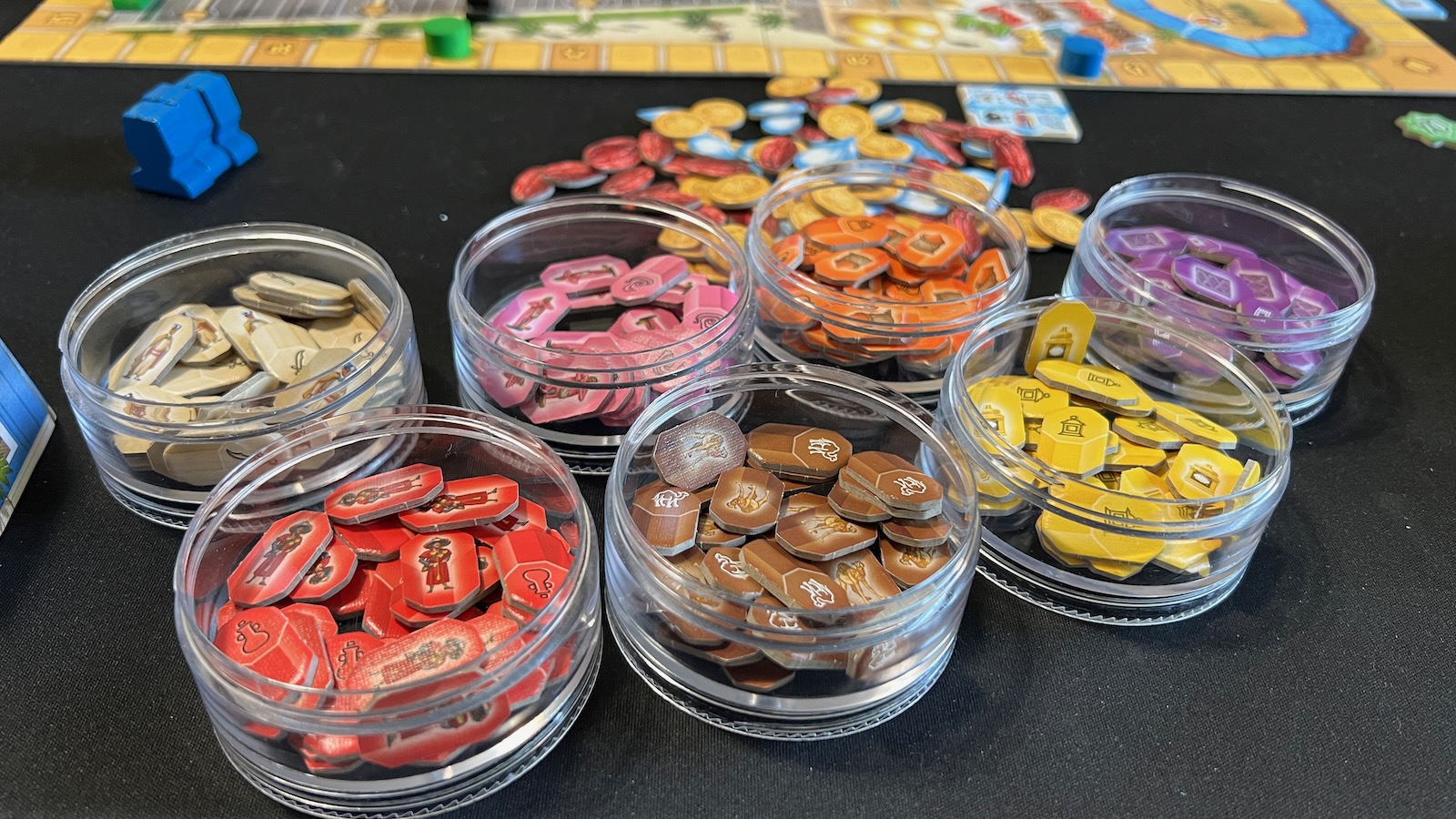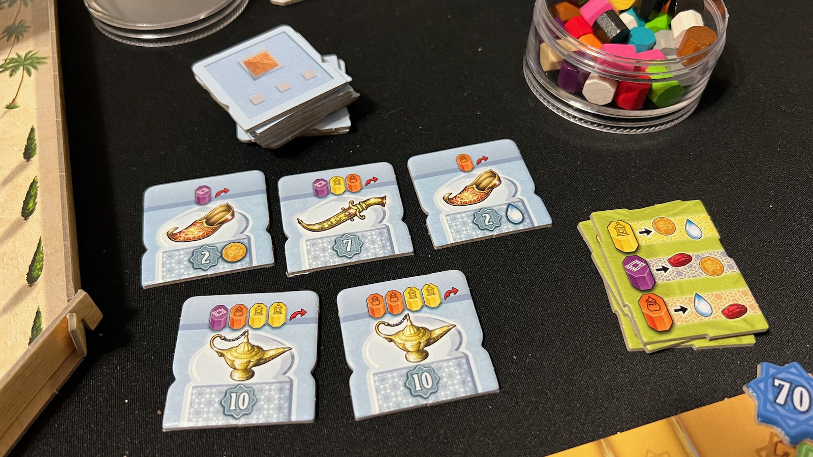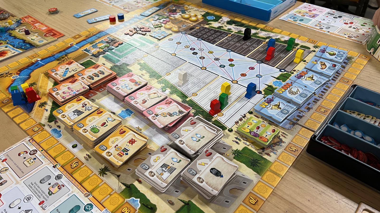 The real meat of the game comes in how you manipulate the keshis and the order of your actions. Many of the areas build up an engine to make actions more powerful given the number of keshis collected. For example, a green keshi gains you a point when collected and, when taking an action in the green date orchard section, you will collect a number of date resources equal to the amount of green keshis you have collected throughout the game. This also comes into play when activating the mosque, palace, and river areas by moving pawns up different tracks corresponding to the number of keshis collected in each section. Each section has its own unique aspects that help you gain points.
