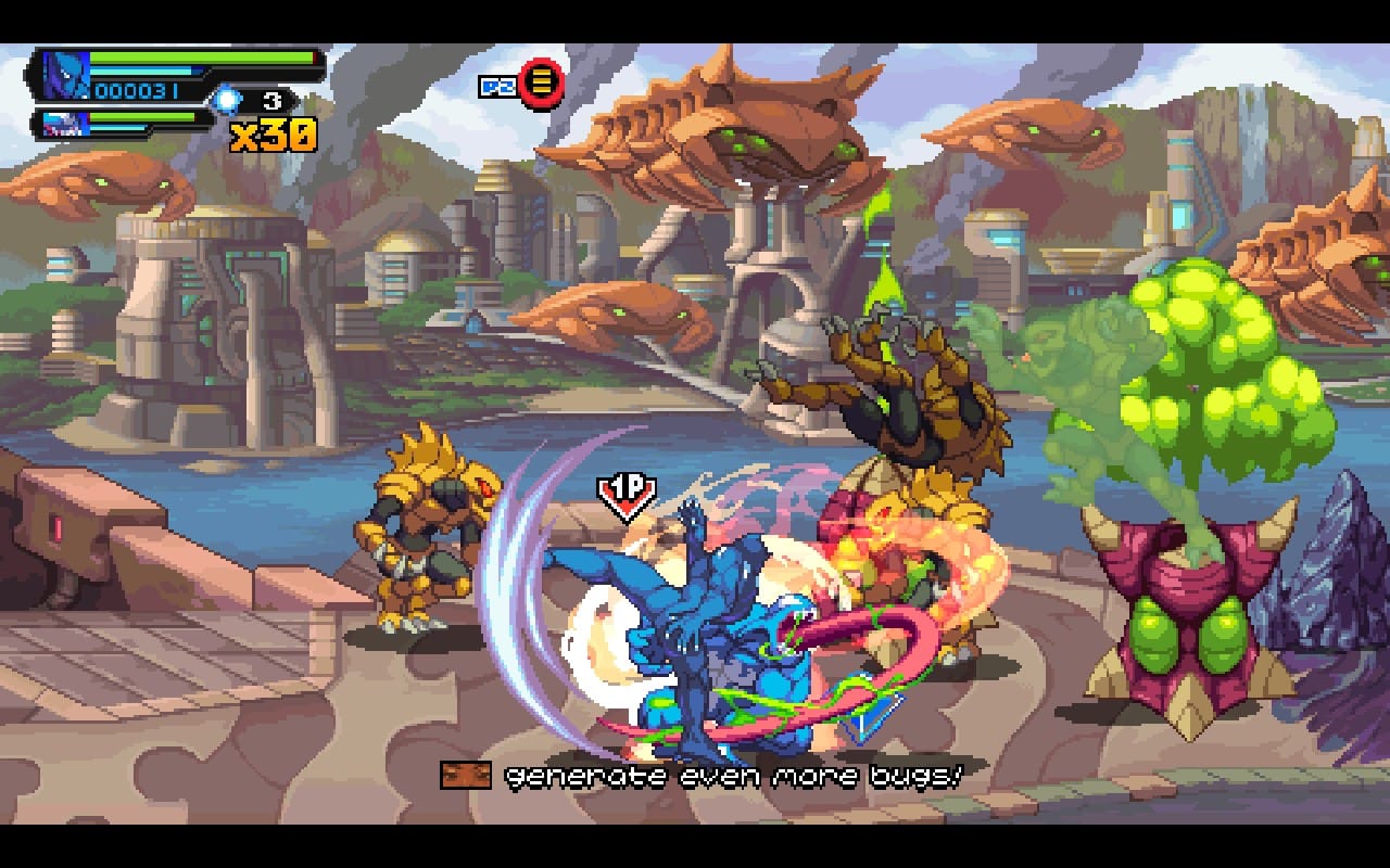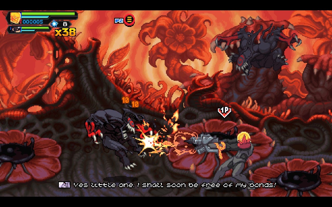 However, split paths aren’t the only reason to revisit the game through the Arcade mode. You can customize the game in a variety of ways, like selecting one of three difficulties, changing the amount of enemies that spawn, or activating unlockable modifiers. The highlights of the modifiers to me are making the super attacks cost health, faster enemies, and the vampire setting which drains your HP and only restores it if you defeat enemies. All of these options allow you to make the game as easy or hard as you want. I tried a buffet of these customizations in co-op and it was total chaos.