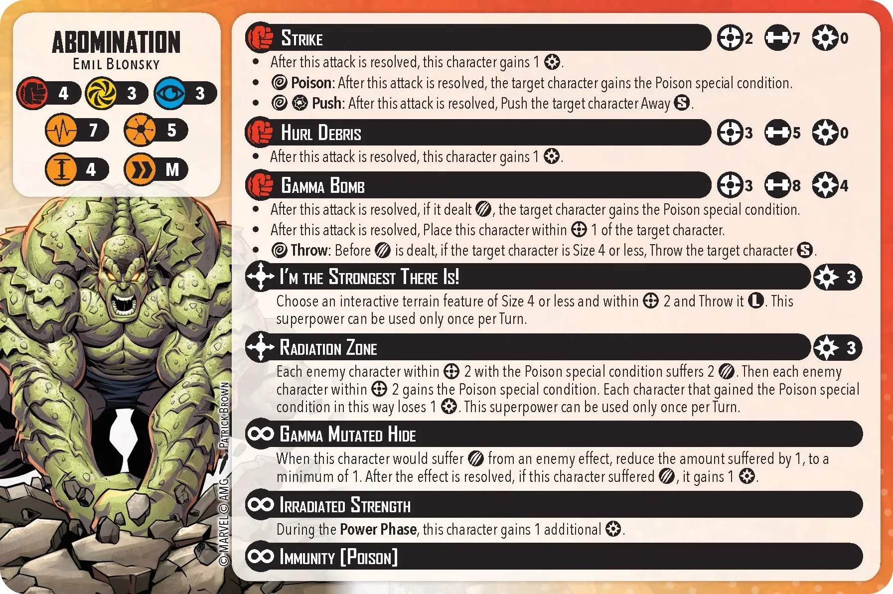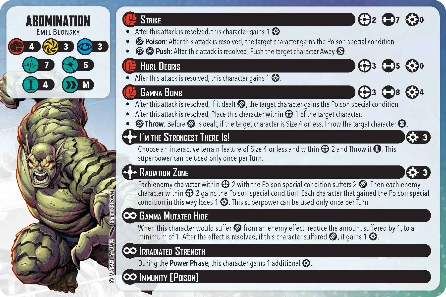 Abomination is explosive. A medium movement means he’ll get around the field very quickly. Immunity to poison and a damage reduction by 1 means he can take a hit very easily. Pair this up with his Strike ability and Radiation Zone, and he’s able to poison other characters on the field yet stay immune…this can be deadly. So that he’s not overpowered, he does only gain 1 power from his strikes and Hurl Debris attack, which also feels underpowered. Moving fast and poisoning the competition is the strategy you should take with him. Personally, I’m going to focus on creating poison conditions and utilizing Radiation Zone (afflicts damage and poison conditions as an AOE) and then using Gamma Bomb (pulls characters in closer). For fun, he can throw a terrain feature that has a size of 4, so go ahead and hurl a garbage truck at Iron Man.