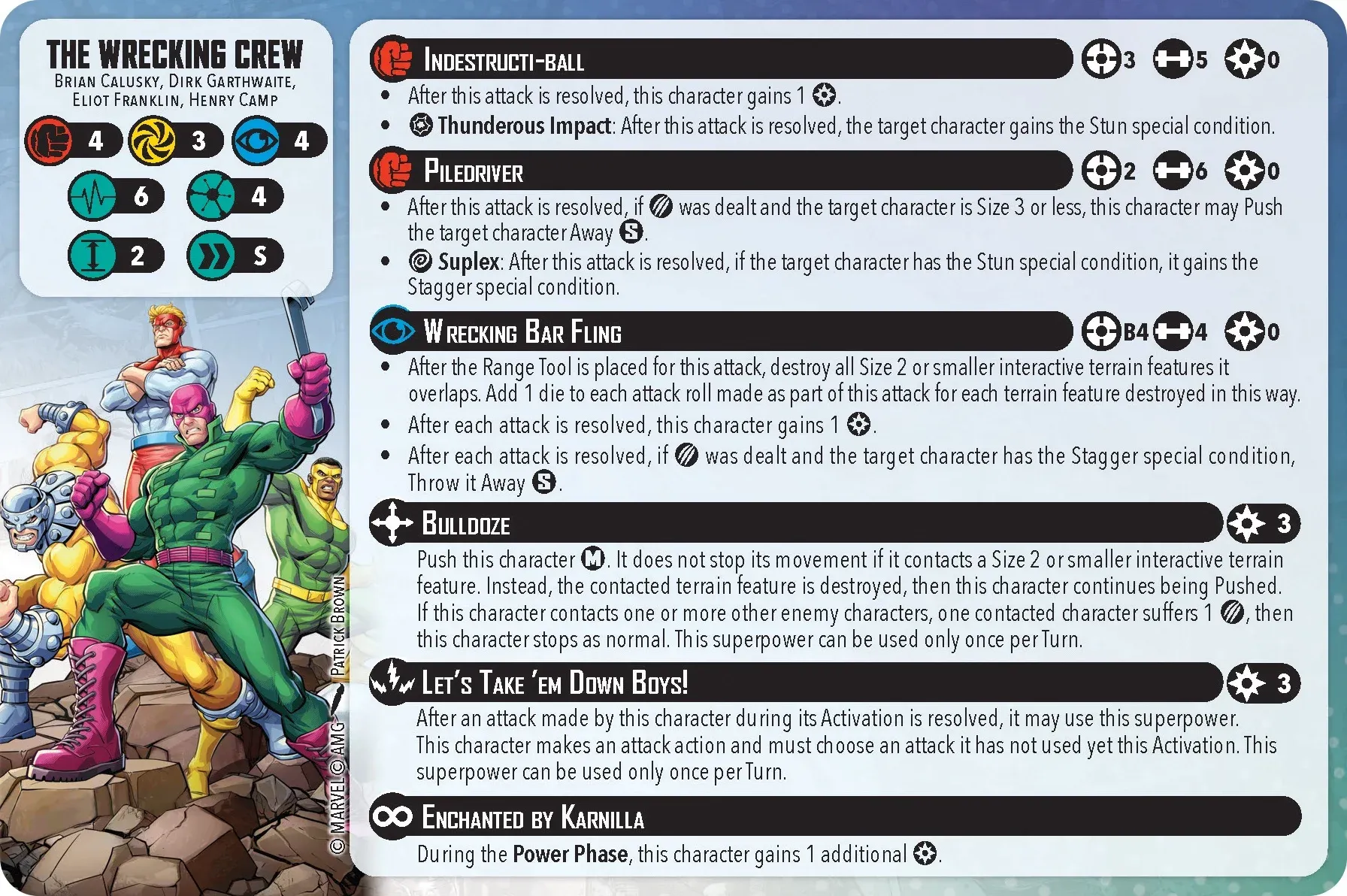 The Wrecking Crew brings some different flavor by being 4 characters together, so naturally, their attacks make sense by integrating thematic elements of each character, whom on their own, probably wouldn’t sell as well. One thing to note is that despite their base, they count as a size 2, so they can utilize size 2 terrain (like a taxi). Looking at the card, combos are important. Indestructiball & Piledriver benefit from each other by setting up Stuns and Staggers. Then, if you’re lucky or a smart planner, you can use “Let’s Take em Down Boys”, which will allows for the Wrecking Bar fling, which will be a beam attack of 4, ensuring you can hit multiple targets and multiple terrain pieces, just wrecking up damage (see what I did there?). Bulldoze rounds out the card by allowing the Crew to get pushed Medium instead of Small. This allows for them to destroy terrain, hurt opponents, and power up for the next round.