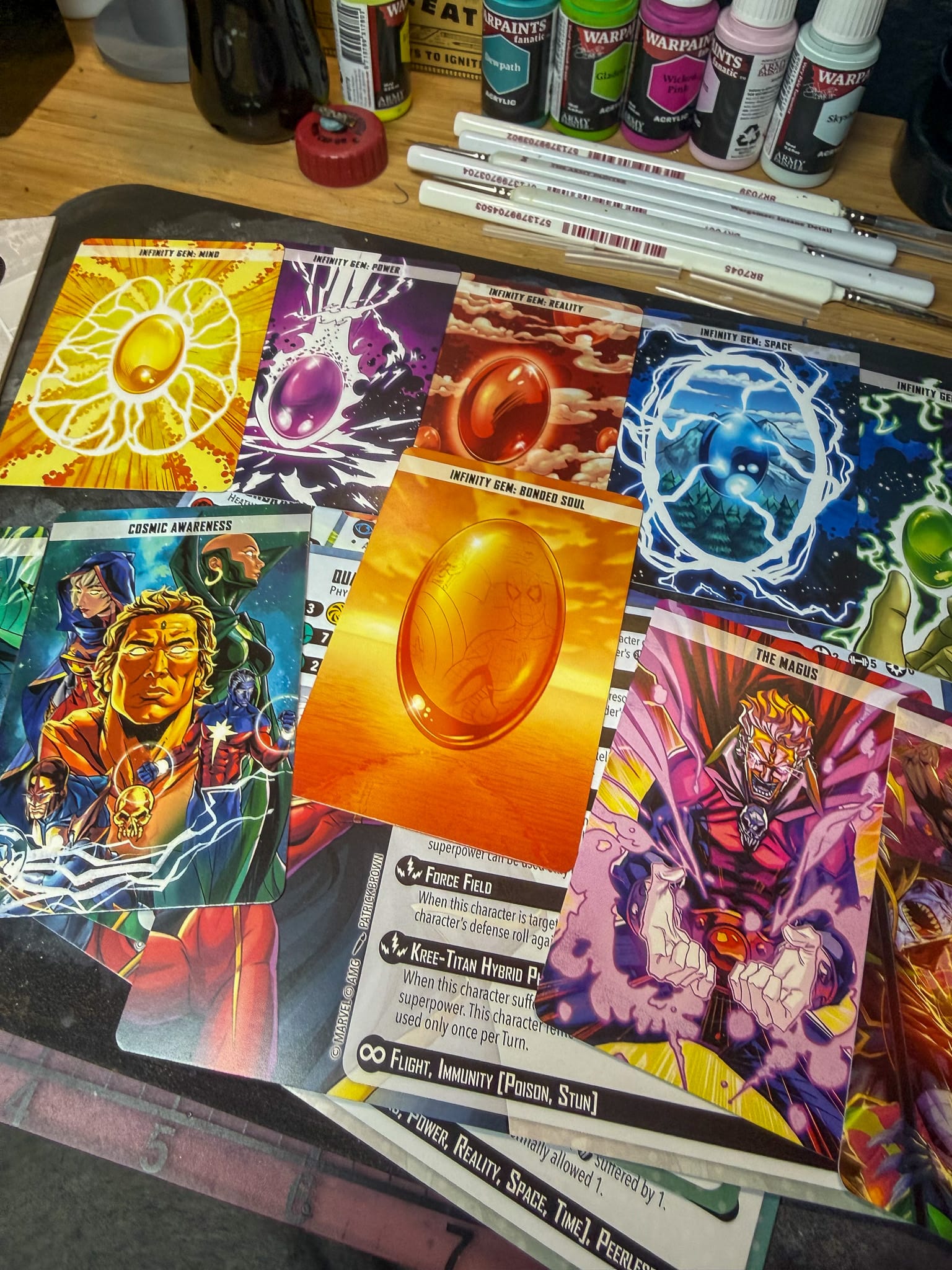 Threat levels vary. Warlock is a 7, Quasar is a 4, and Moondragon is a 3. All three models can be affiliated with the Guardians of the Galaxy (who have an upcoming Affiliation Box) and Warlock can bear any Infinity Gem, though the one you'll use is Bonded Soul.