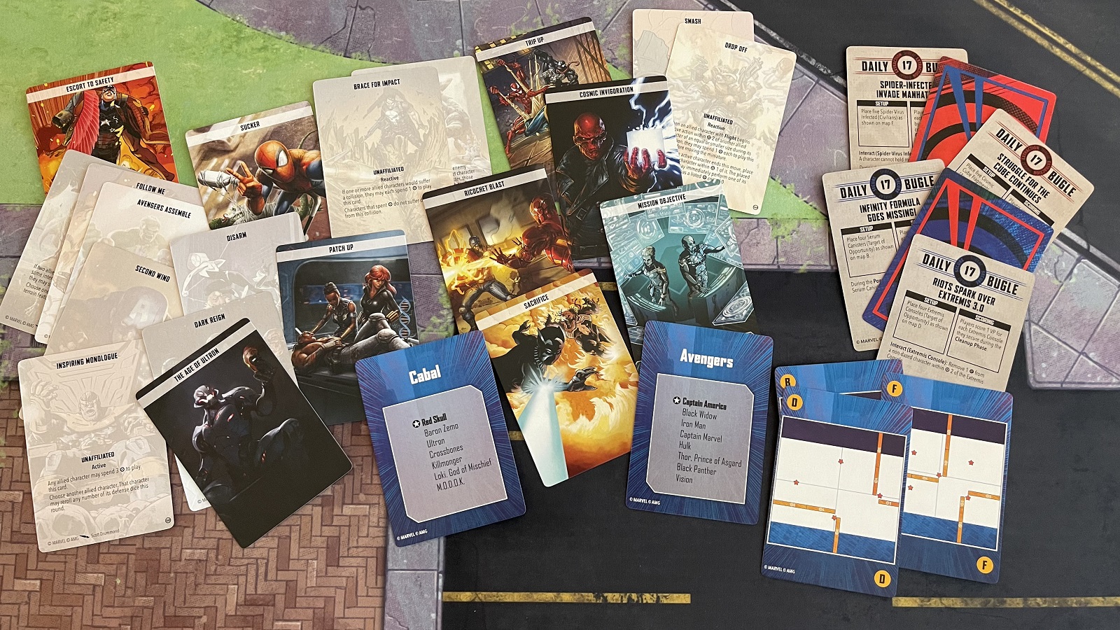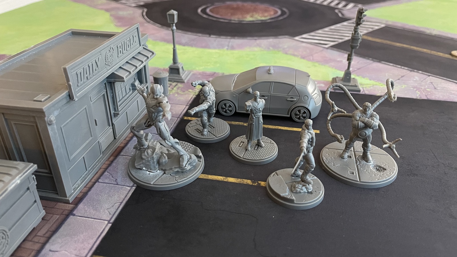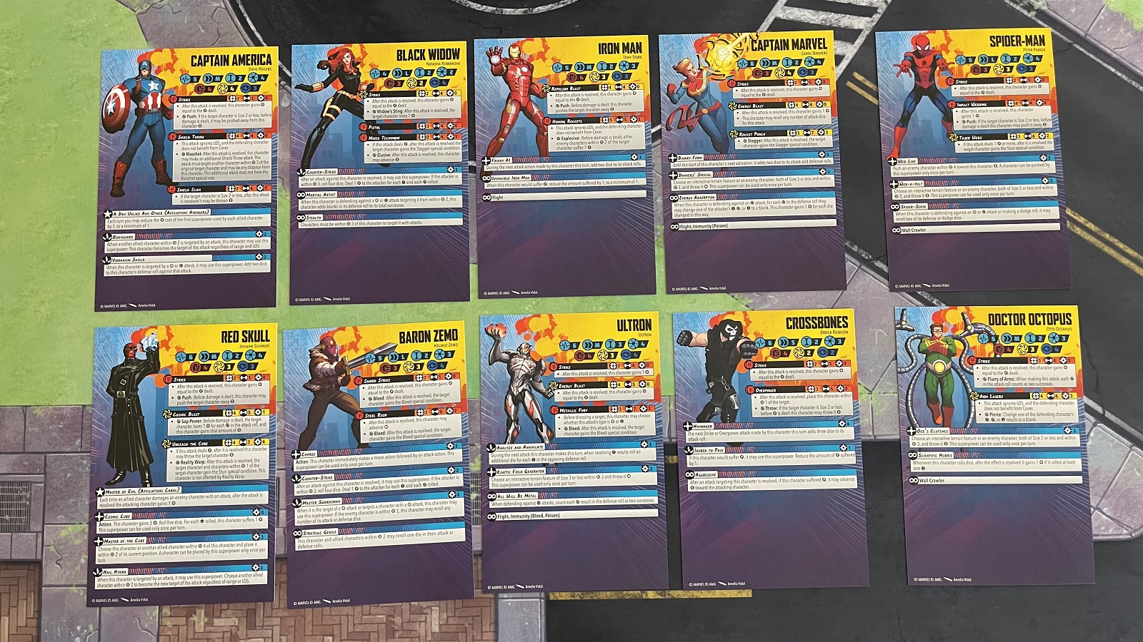 The Avengers are duking it out with some notorious supervillains in New York City. The action is down on the street, in between the buildings and cars. The most famous heroes and villains are here in the thick of it: Captain America, Iron Man, Captain Marvel, Spider-Man, Black Widow, Red Skull, Doctor Octopus, Crossbones, Baron Zemo, and Ultron. Doctor Octopus throws a taxicab at Black Widow while Captain America reflects Iron Man’s repulsor blast around a corner at Ultron. From a vantage point on top of a Daily Bugle news stand, Spider-Man uses his webs to drag Baron Zemo into the open where Captain Marvel can blast him without leaving the objective she is guarding. Trashcans, streetlights, and even buildings are destroyed as the battle tears through a city block. This is Marvel: Crisis Protocol, Atomic Mass’s tabletop hobby miniatures game in which teams of superheroes and supervillains battle it out, fighting for control of key points while attempting to recover people and objects from the battlefield.