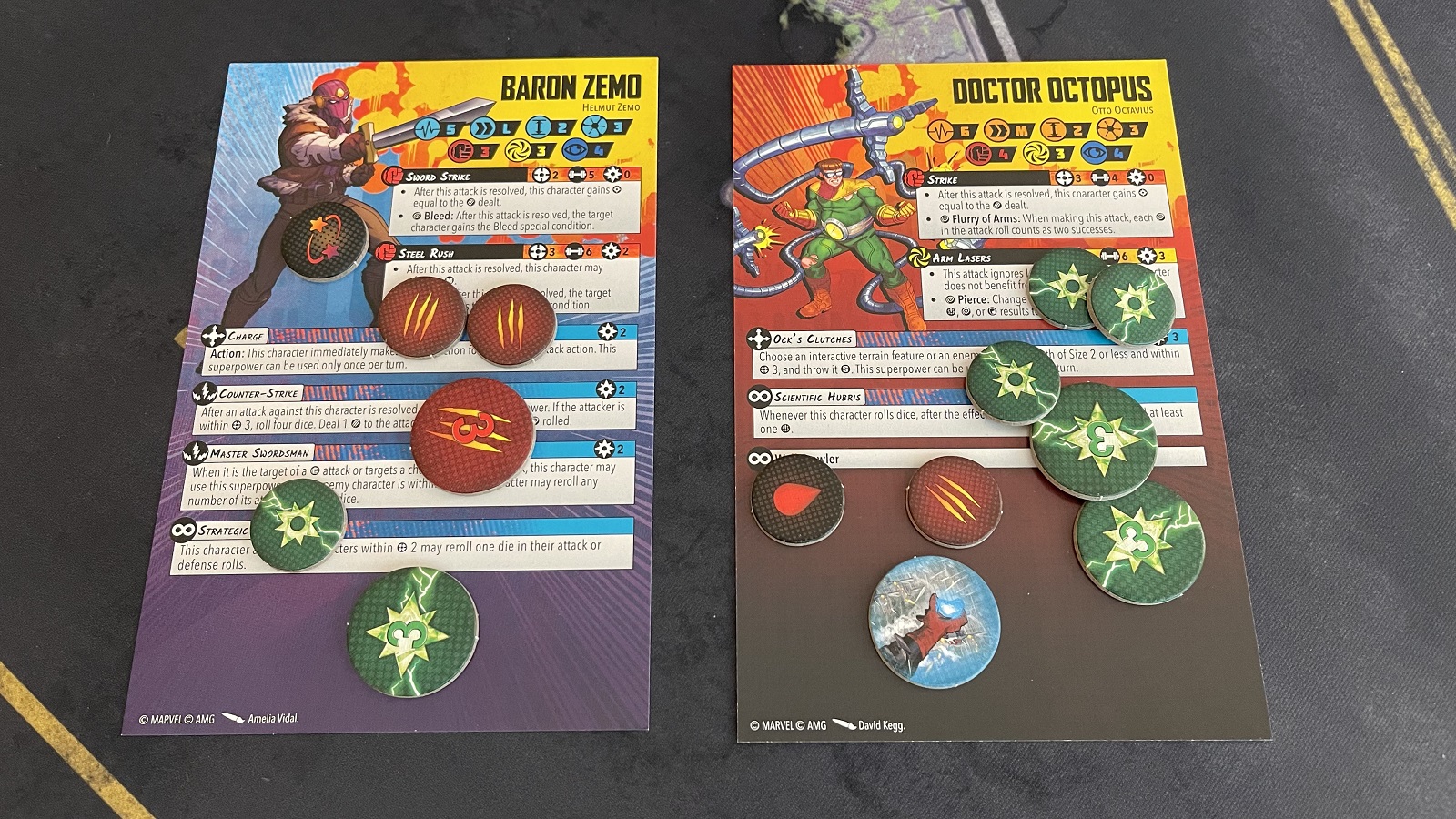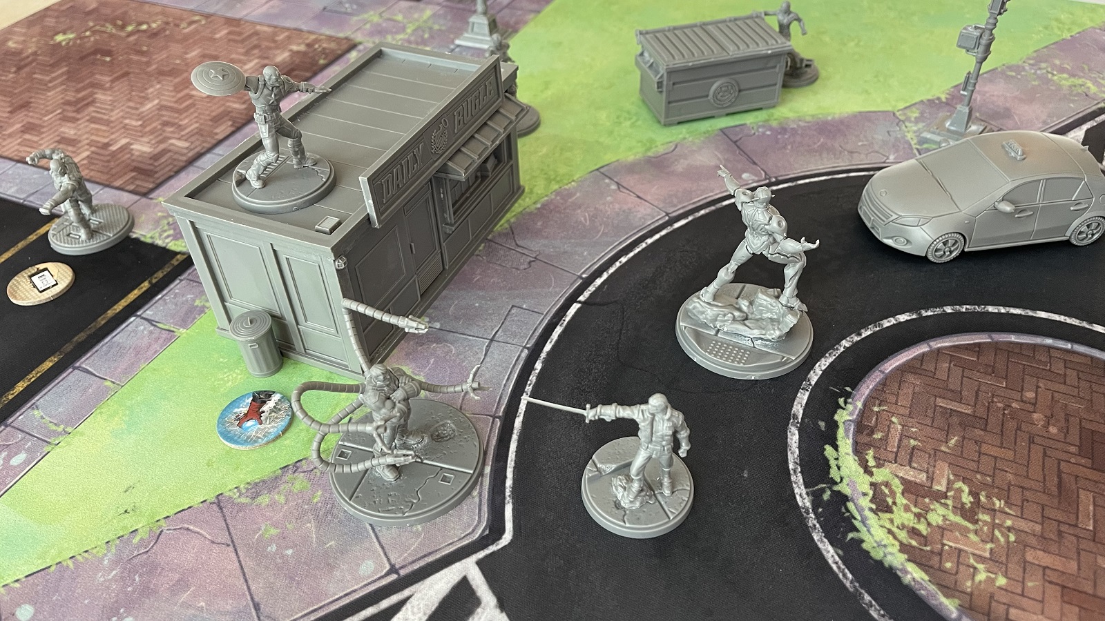 Movement is handled via a pivoting tool system, similar to other recent minis games. There are three plastic movement tools of different lengths (short, medium, and long) that pivot in the middle, ninety degrees in either direction. For a basic movement forward (an advance), players use the movement tool that matches their character’s Speed stat or a shorter one. They place it on the table with one end touching their mini’s base and bend the tool in whatever direction they want. Then they pick up their mini and place it anywhere they want touching the movement tool. Other types of movement include being pushed, climbing, throwing, or placing (to teleport, for instance). Terrain pieces that are the same size as or smaller than a character can be ignored during movement, otherwise they have to go around or climb over the obstacle. To climb onto a larger object, any character uses the shortest movement template and uses it to put themselves on top of a building, so you have to get close enough to initiate the climb. Ignoring terrain that is the same size or smaller than the character makes movement easy and thematic. This allows a size two superhero to easily vault over the hood of a car and rush past a trash can. But if they’ll have to climb to the top of a size three building or go around it. Two abilities— Flight and Wall Crawling — make characters act as if they are size five when moving, meaning they can ignore all terrain. There is no other apparent difference between Flight and Wall Crawling, which is irksome. It works well for the movement rules, but without any ability to stick Spider-Man on the side of a piece of terrain or have Captain Marvel float in the air, the effects are identical. I wonder if there isn’t something else that could have been done to make Spider-Man’s movement different from Captain Marvel’s. Additionally, movement can feel a bit oversimplified, with everyone sliding over cars and rushing through dumpsters, a good percentage of the terrain feels more like flavor than obstacles.