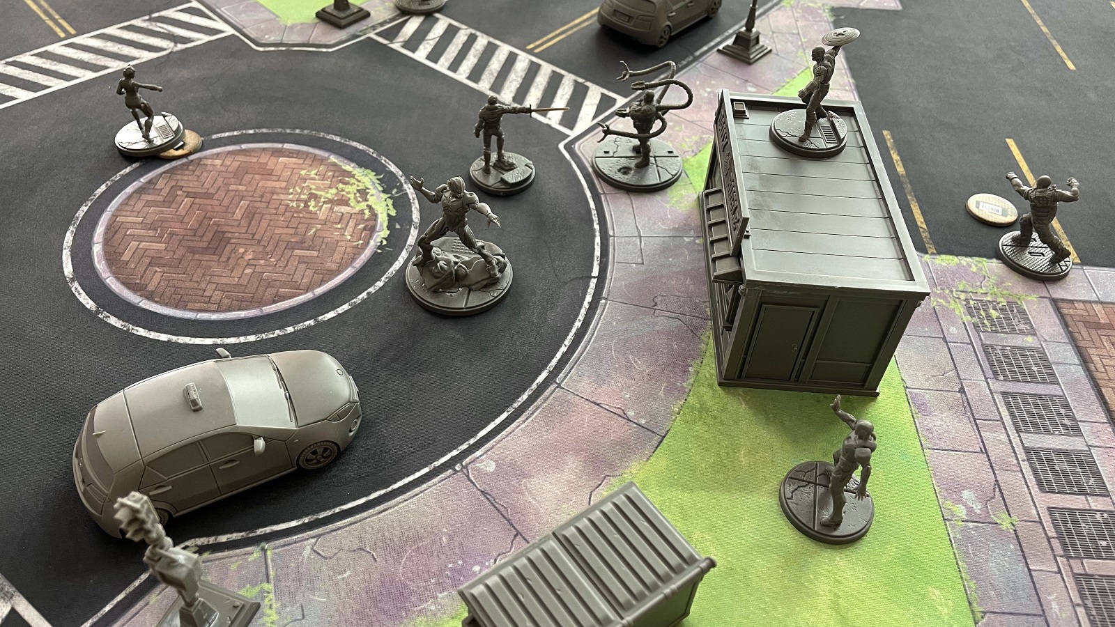 Everything that goes onto the battlefield, both characters and terrain pieces, has a size. Sizes in the game range from one to five. Human-sized character minis are size two, of the Core Set models only Ultron is larger at size three. Size one terrain includes trash cans, barrels, and mailboxes. Size two terrain is things like dumpsters and cars. Size three is kiosks, food trucks, and the like. Size four includes newsstands and large trucks. And finally, size five is larger buildings. The Core Set comes with sizes one, two, and three terrain pieces. Most terrain is interactive, meaning it can be smashed into and destroyed or thrown around by the characters. When moving, terrain pieces that are the same size as a character or smaller are basically ignored.