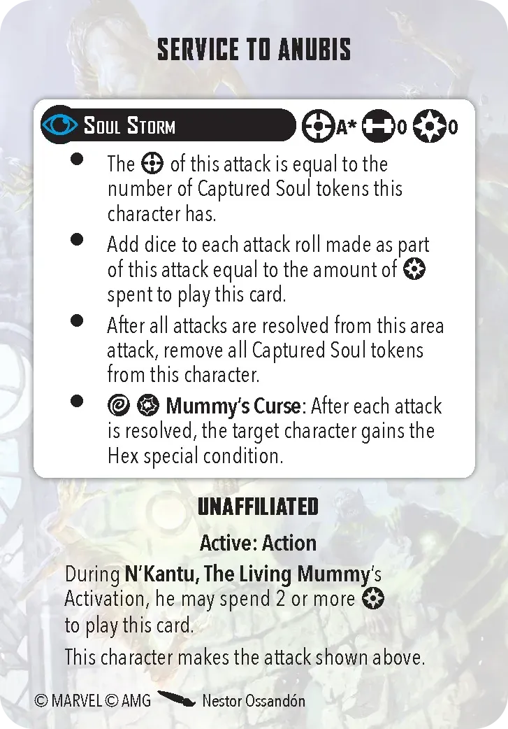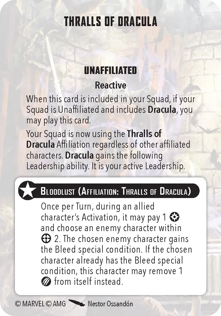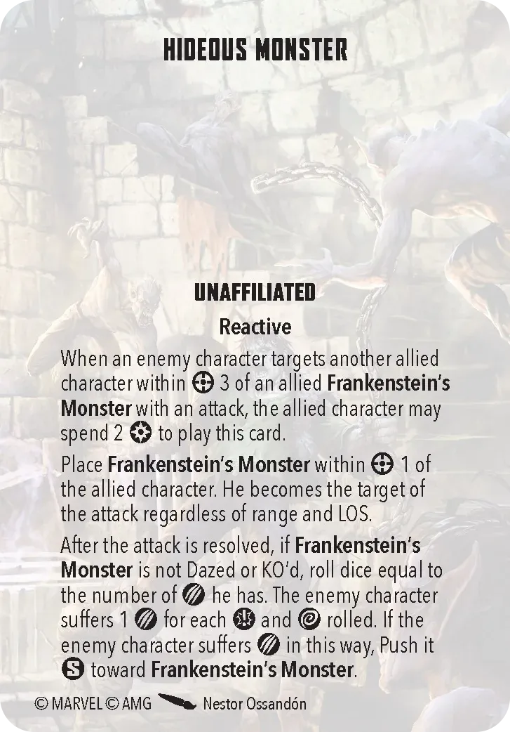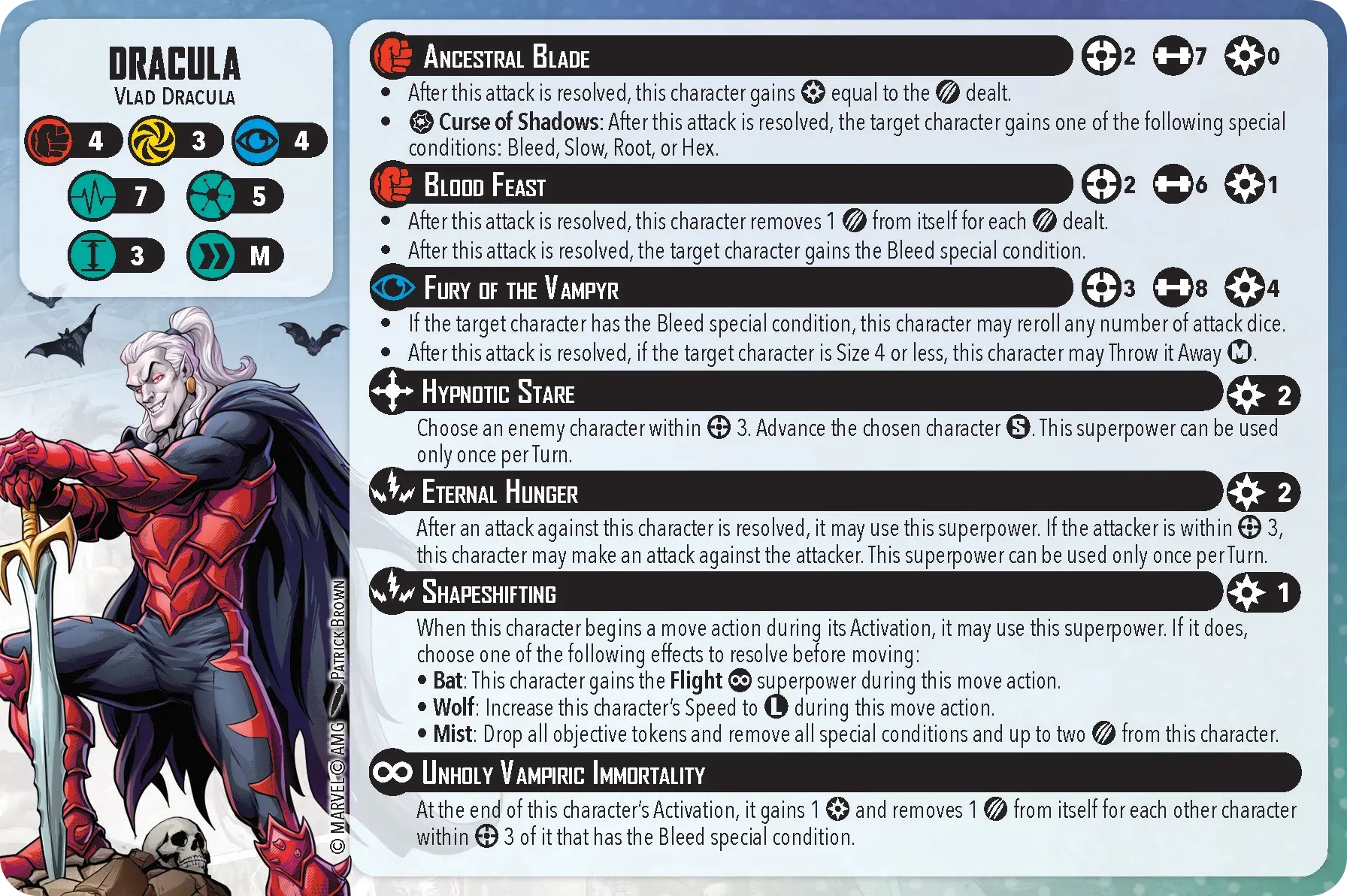 Now, let’s get to the gameplay. You’re dealing with a pretty tough team. First off, the entire team can reduce damage which makes it very hard for your opponent to try to win via KOs. Dracula can take this a step further with Blood Feast, which allows for healing after the attack, and putting a bleed counter on the target. Secondly, they can hit hard. Dracula has Ancestral Blade, which allows him to roll 7 dice. Frank and the Wolf can hit 6 die, and The Mummy is a 4/2/4 (power/energy/mystic) for only 3 threat, which is cheap when building your force. Oh, and because it’s a Mummy, it’s immune to bleeding (no blood), hexes (it’s mystical), and poison (it’s a mummy?).