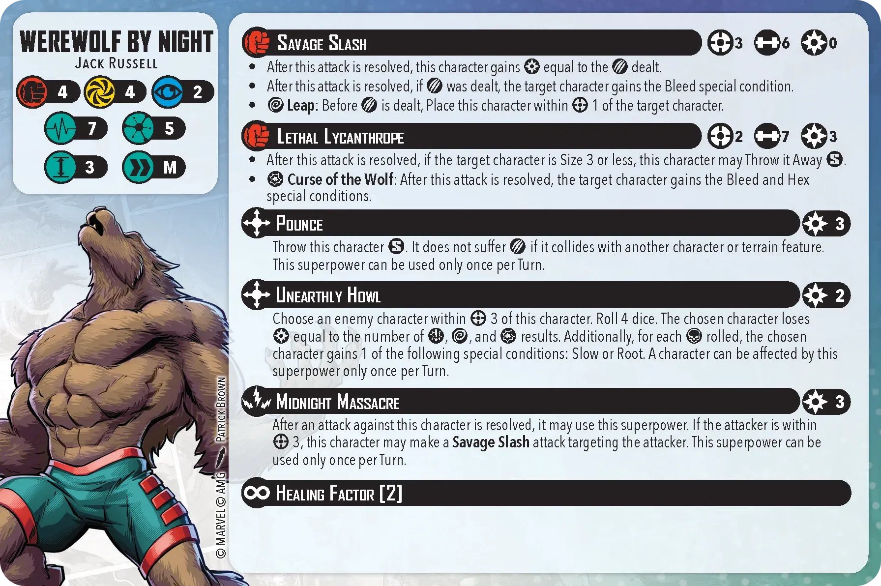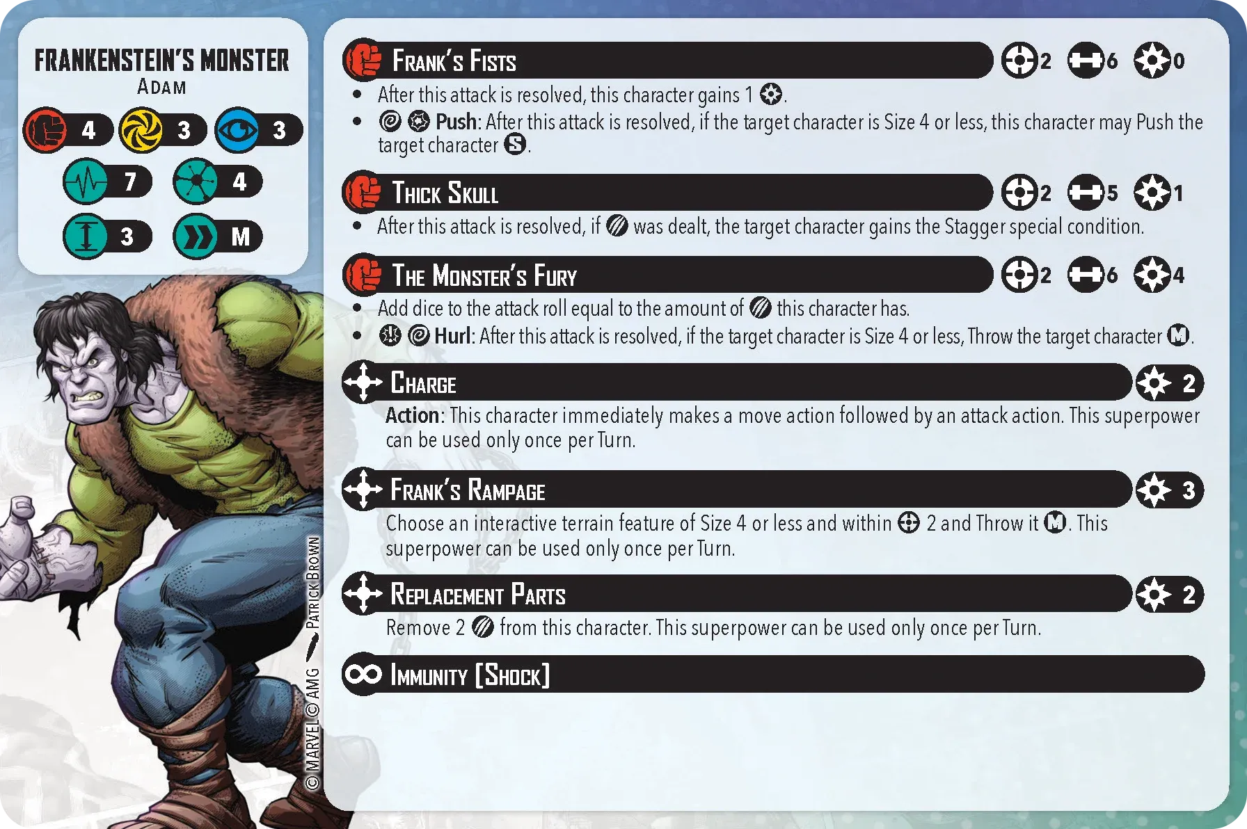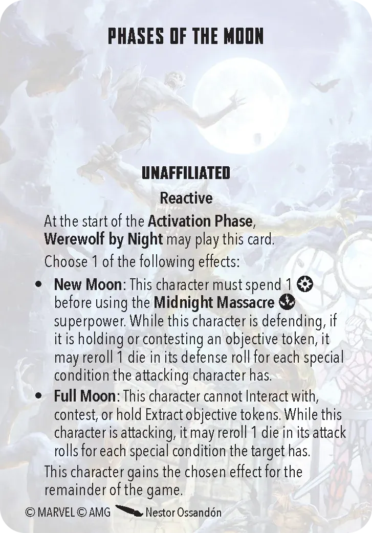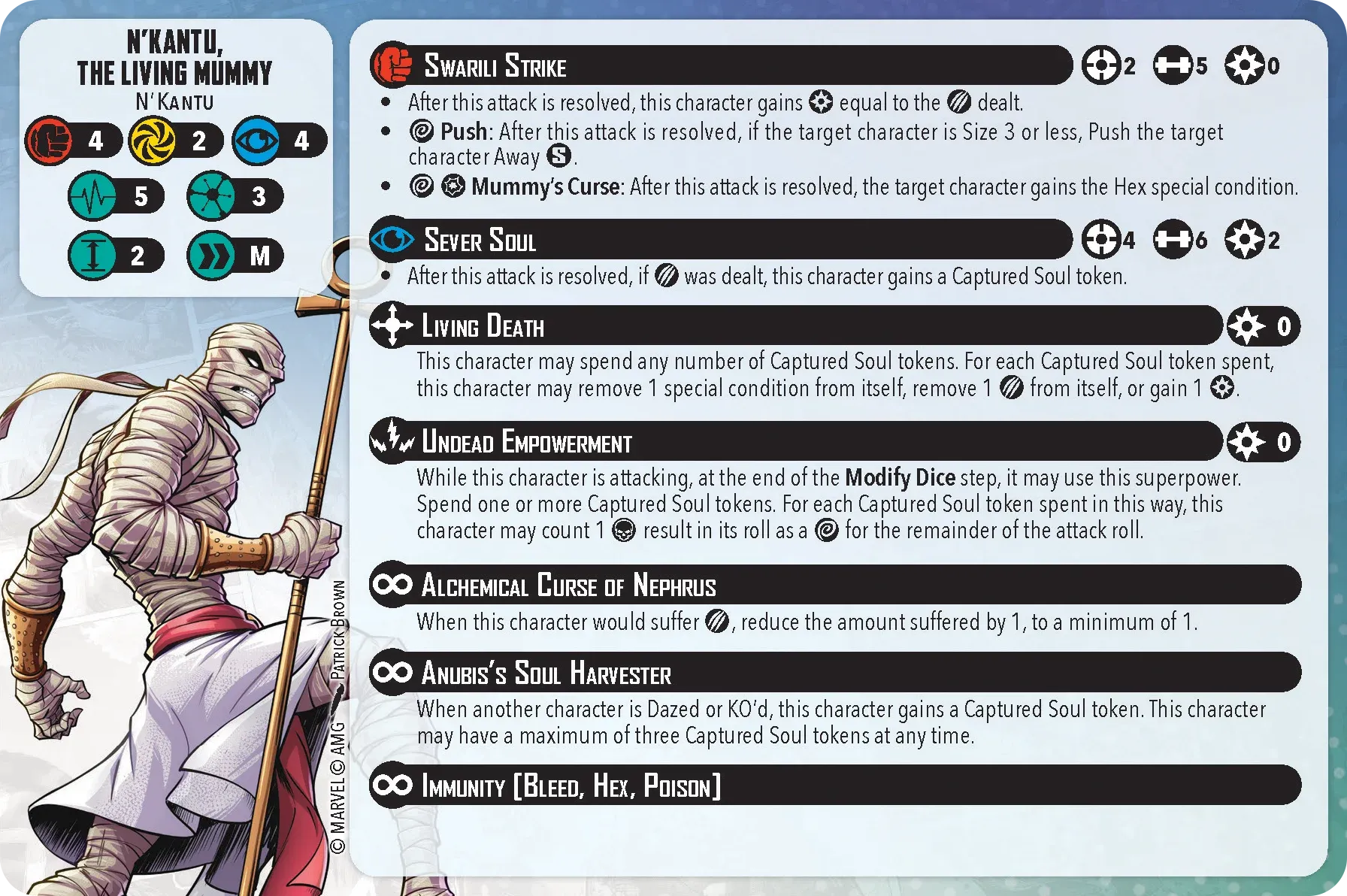 Now, let’s get to the gameplay. You’re dealing with a pretty tough team. First off, the entire team can reduce damage which makes it very hard for your opponent to try to win via KOs. Dracula can take this a step further with Blood Feast, which allows for healing after the attack, and putting a bleed counter on the target. Secondly, they can hit hard. Dracula has Ancestral Blade, which allows him to roll 7 dice. Frank and the Wolf can hit 6 die, and The Mummy is a 4/2/4 (power/energy/mystic) for only 3 threat, which is cheap when building your force. Oh, and because it’s a Mummy, it’s immune to bleeding (no blood), hexes (it’s mystical), and poison (it’s a mummy?).