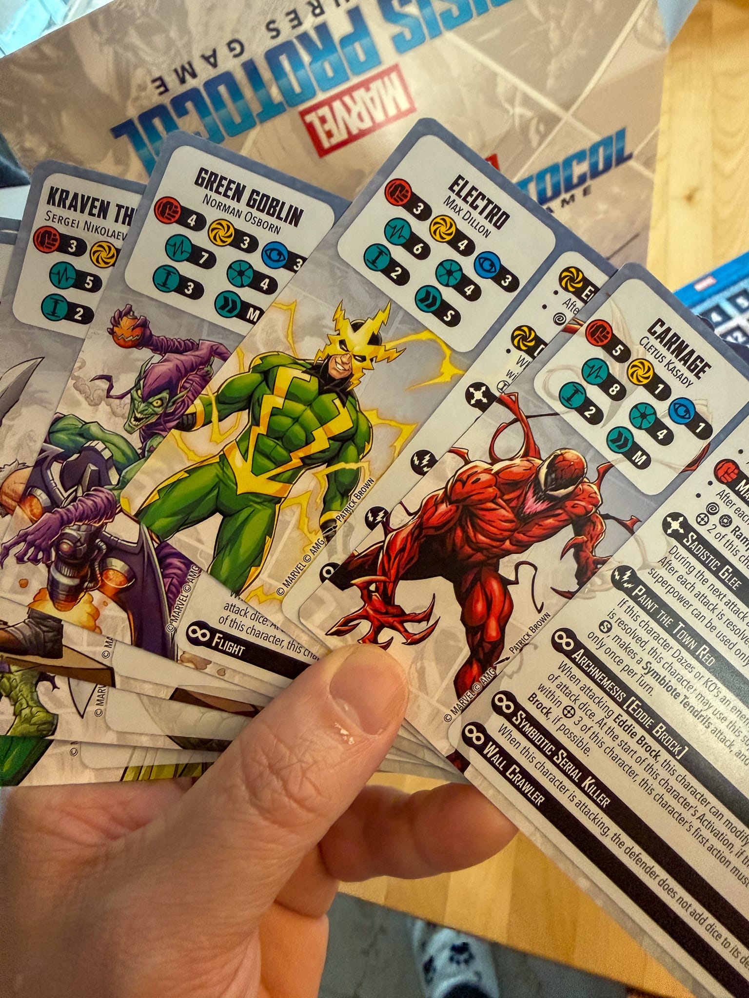Like the other box, I love having the updated cards. With the newest Core set, AMG switched to horizontal cards, which work better on my table and I assume other folk's tables. And about the cards, this set includes some pretty great affiliation cards and character specific cards which will make any Spider-Foe fan proud. In fact, there is one card that seems absolutely terrifying, which allows Kraven the Hunter to take your opponent's Peter Parker card and add Spider-Man to your squad. While I haven't played with the Spider-Foes yet, this seems wildly fun and powerful to pull off.