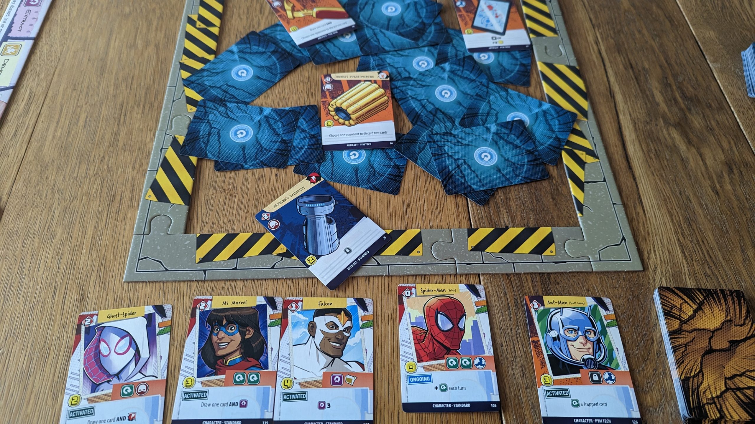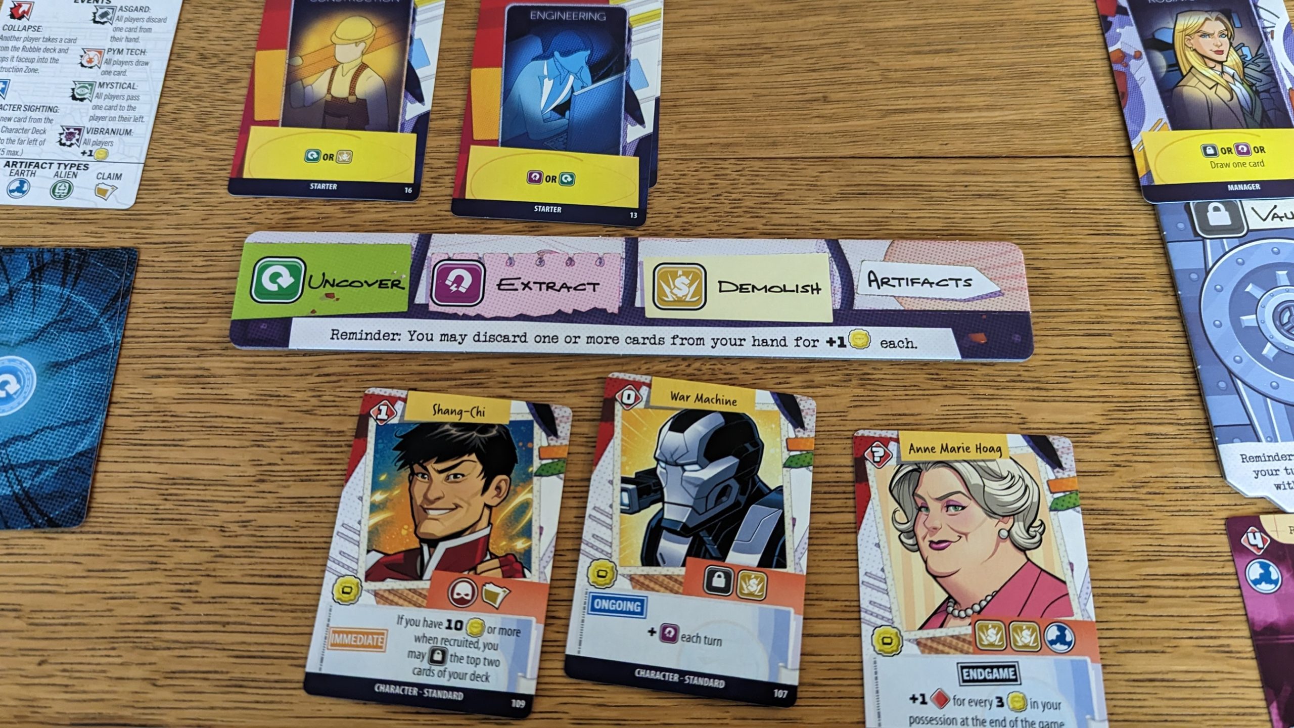 The implication there is that there’s a noticeable amount of time that Damage Control doesn’t run smoothly, which means it’s time for me to talk about the theme decks. Damage Control comes with four theme decks that contain market and character cards – you’re supposed to pick two and shuffle their cards into the market and character decks before every game. Particularly perceptive readers have already picked up on the issue here, where any addition to set up and tear down time to a light quick game has really got an uphill battle to justify its existence, since nobody wants to spend five minutes setting up and sorting decks on either side of a twenty minute game. The separate decks are another case of big hits and misses: pym ratchets the snappy pace up to breakneck speeds with its powerful effects and event that lets everyone draw a card. Outstanding, 10/10. Vibranium incentivizes the greed of playing artifacts instead of vaulting them – vibranium artifacts have additional triggers if you’ve played multiple on your turn, and its event doles out the influence you need to do so. Mystic is perfectly fine, adding a set collection element to scoring its vaulted artifacts and a mildly chaotic pass a card to your neighbor event – serviceable, but brought down because using it means excluding one of the better themes. Asgard is a total flop that really made me question the purpose of themes other than the obvious expansion implications, as it’s overloaded by feel bad take that effects and an event that forces everyone to discard a card, slowing the game down to a standstill as everyone’s forced to do almost nothing for a round while simultaneously not advancing the endgame conditions. Honestly, my copy is going to be permanently set up with pym and vibranium, but I can’t ignore that the way this game is packaged, people are going to wind up playing with the Asgard disaster and adding set up and tear down time changing it up every play. I’d like to see the inevitable expansions have overview cards for the theme decks like in Unfair, as then people could opt in to experiences like Asgard with forewarning. I also would have appreciated a reference chart in the rulebook with an approximate number of rounds for player count and themes, as it would really help players make better informed decisions between vaulting and playing artifacts.