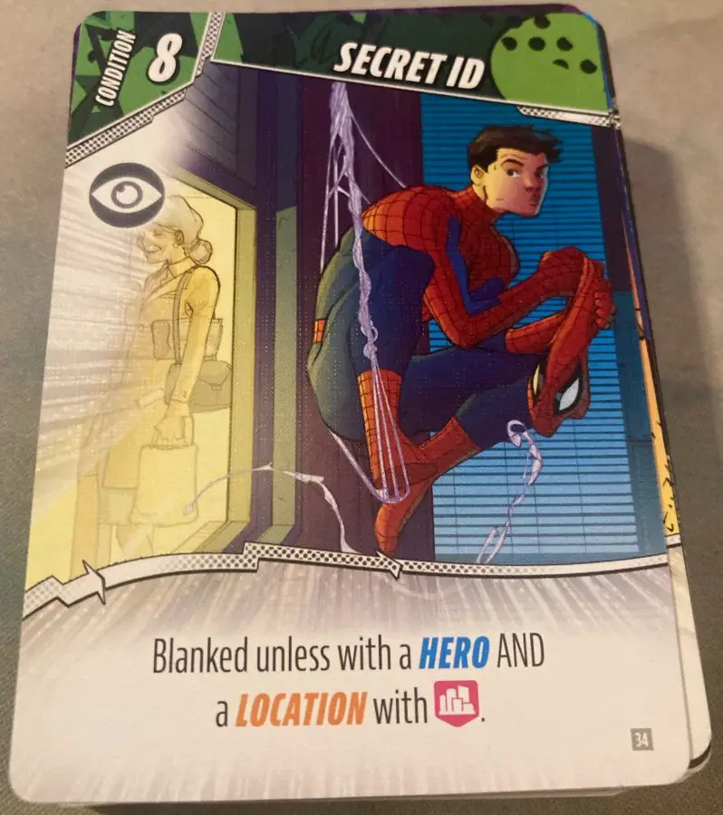 At the start of the game you are dealt 6 Remix cards and 1 Villain card. The Remix deck includes Hero, Ally, Condition, Equipment, Location, and Maneuver cards while the Villain deck includes only Villain cards. Each card has a tag (ex. Tech, Boss, Range, etc) that will be used to trigger your cards such as Conditions, Equipment, etc. Some cards will even have the condition “Blanked unless ____” related to these tags. For example, the card Secret ID gives you 8 points, but has the condition “Blanked unless with a Hero AND a Location with an Urban tag.” What these conditions do is add another level of strategy for building your hand.