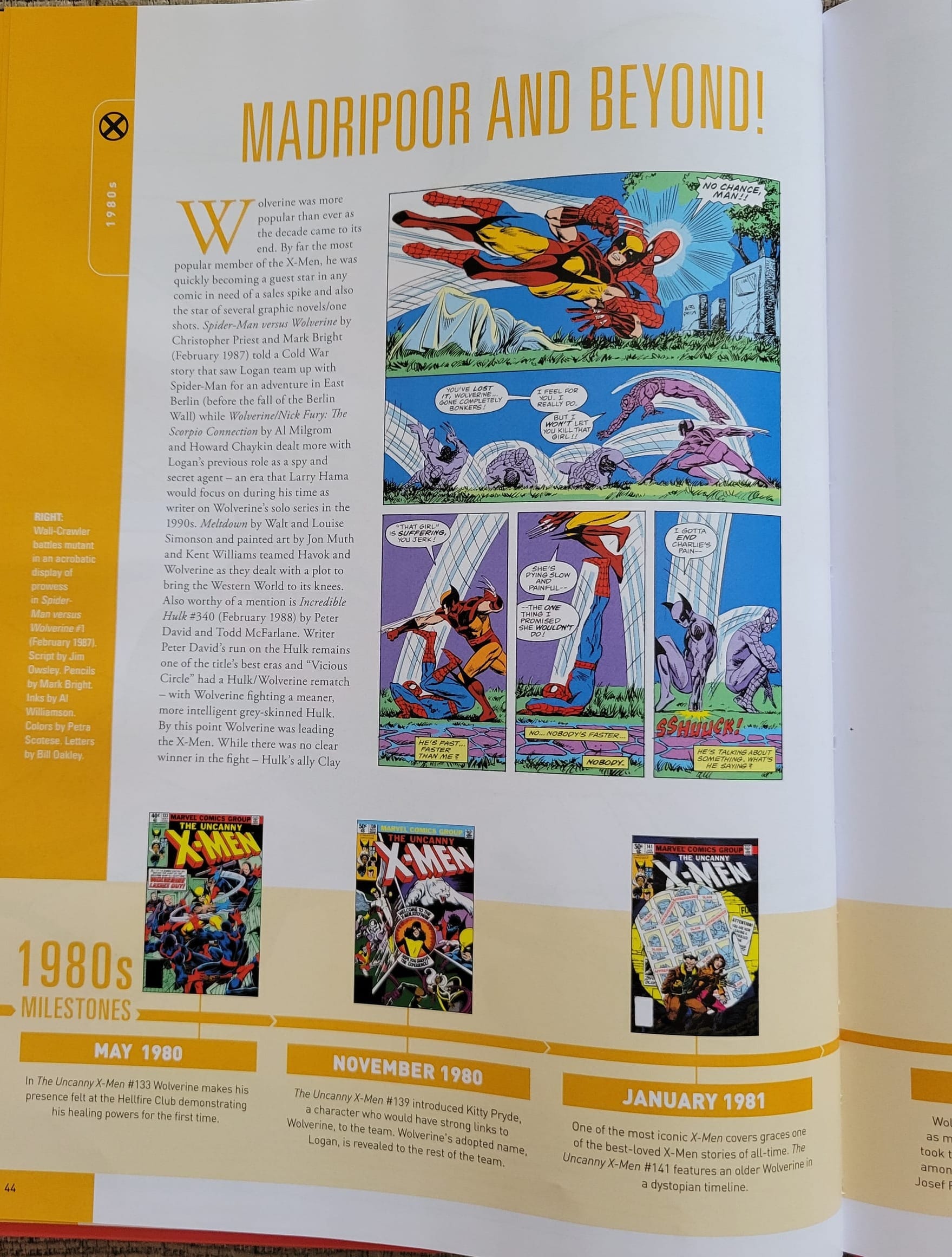 Complementing these detailed breakdowns are images taken from the various comics referenced, providing a visual journey to further show how Wolverine has evolved from his first appearance, while also showcasing how comics in general have evolved. Whether it’s changing art styles from different artists, updates in the way comic book art is done, or something as simple as a new costume, it makes the decades Wolverine has spent gracing the pages of Marvel comics felt more deeply. Adding to this are the selections of comic covers displayed chronologically across a timeline for each decade, many of which are sure to be recognizable by even the most casual of comic book fans.