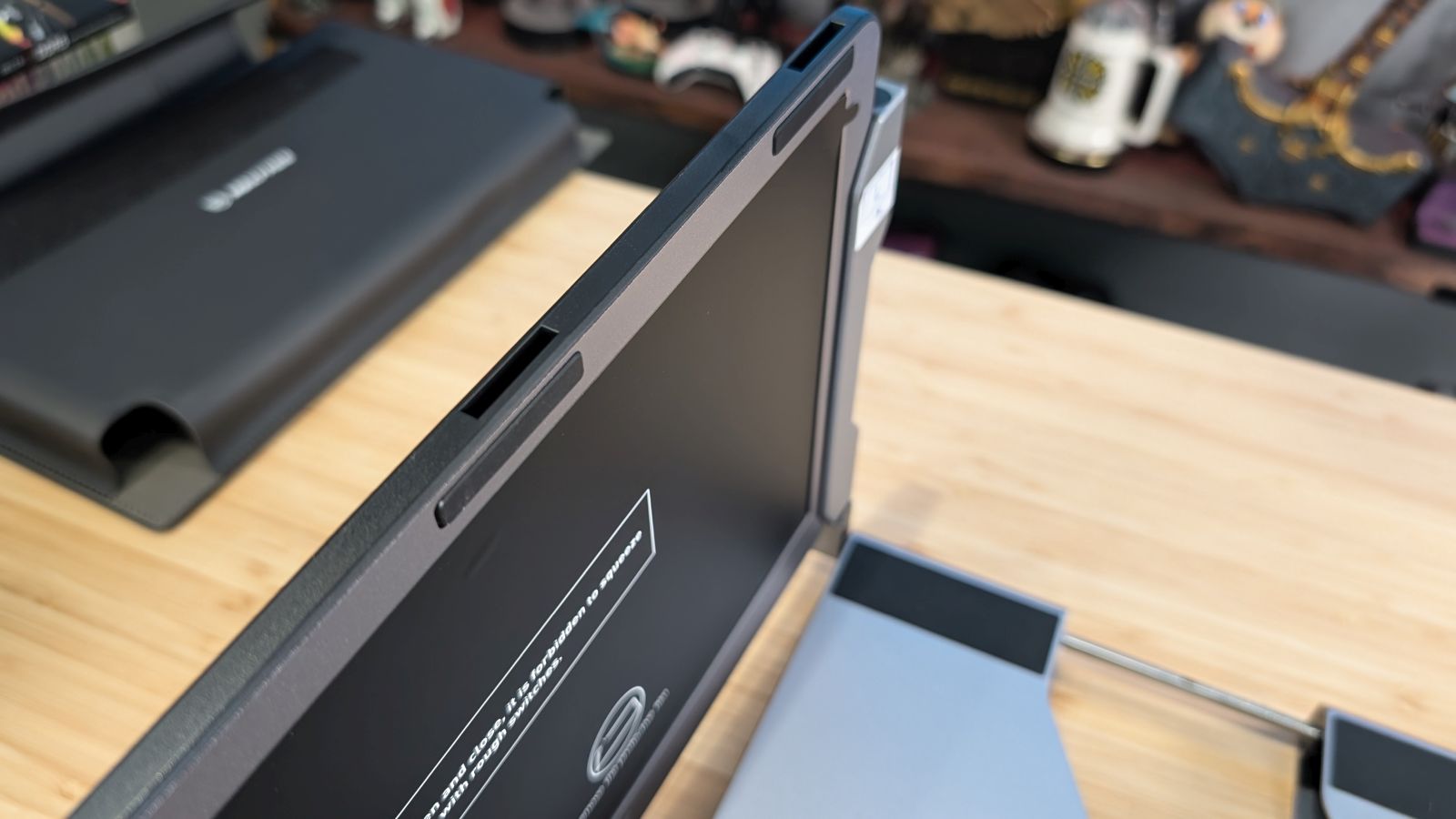 Looking at one edge of the monitor you’ll find two USB-C ports and a Mini-HDMI port. You’ll also find a small rocker switch that also acts as the power button. A pair of small holes on two edges hides the speakers. The opposite side from the buttons will have the rubberized contact surface, with a pair of small slits for mounting the monitor. Everything is very well hidden and subdued, minus the cabling that we’ll get to in a moment.