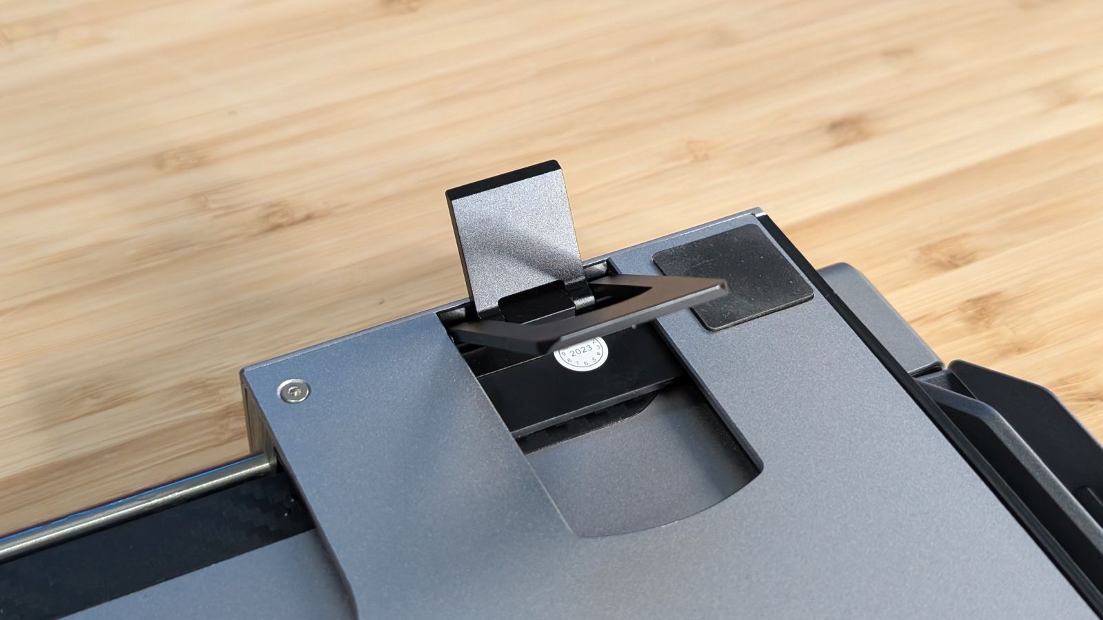 The main allure of the F2 is that the stand is actually that – a solid aluminum stand where your laptop will sit. No longer do the monitors hang off your primary display, instead connecting to two riser arms that are part of that case. Pressing on the edge of the two monitors, which are contained inside the body, frees them from their spring-release, ejecting them slightly from the device. This allows you to pull them free and set them aside.