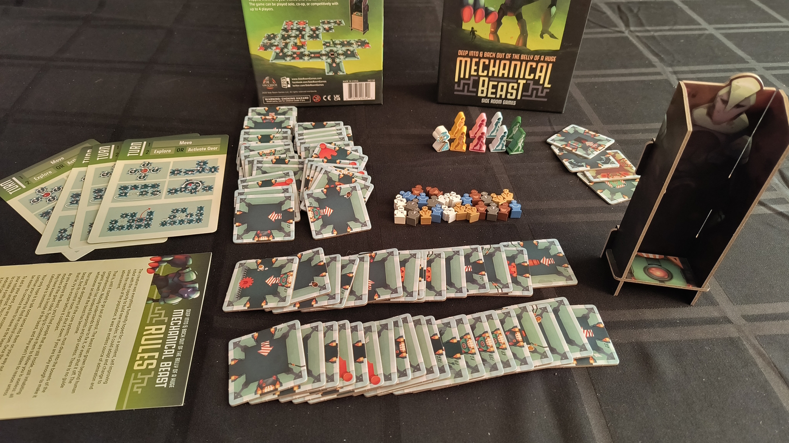 Deep Into & Back Out of the Belly of a Huge Mechanical Beast, or Mechanical Beast for short, is a maze building and manipulation game by Ben Morayta, published by Side Room Games. 1-4 engineers will head into the beast. They will start on an entrance tile, and explore the maze, one tile at a time, until they locate the control room of the mechanical monster. This will trigger the collapse, resulting in every move destroying the room they’ve left, as the engineers try to return back to the start, grabbing every civilian that was either working inside the Beast, or got scooped up during its unfettered growth.