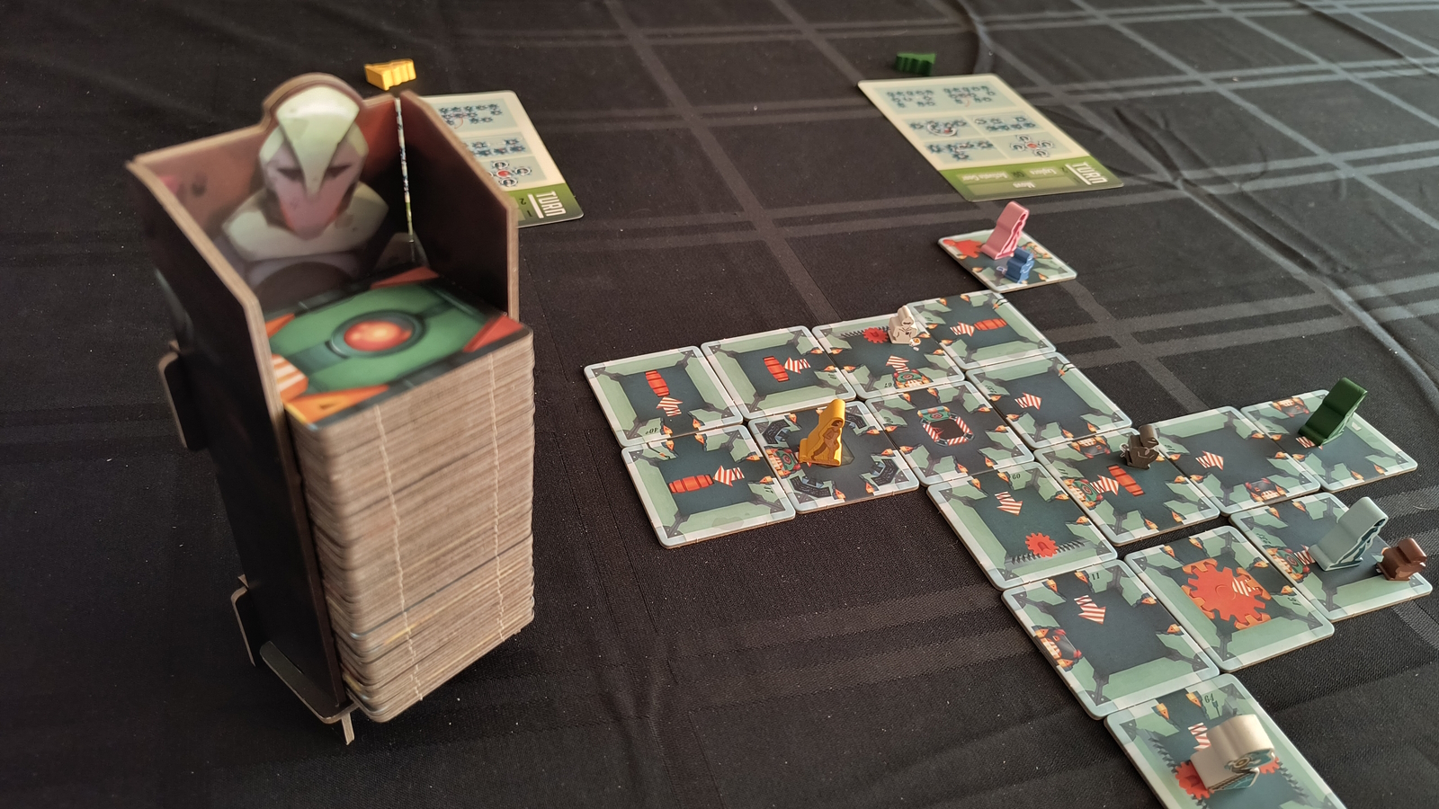 And that’s probably always going to be the problem with “tile maze games”. Manipulating tiles, sliding them next to each other, will always result in log jams. If you have to rotate 4 tiles clockwise, you have to pick each one up, rotate and move it, and put it back down. It’s a lot of extra work to move these things around each turn. Even if you’re not using gears to shift the maze, the collapse mechanic means an entire row shifts every turn.