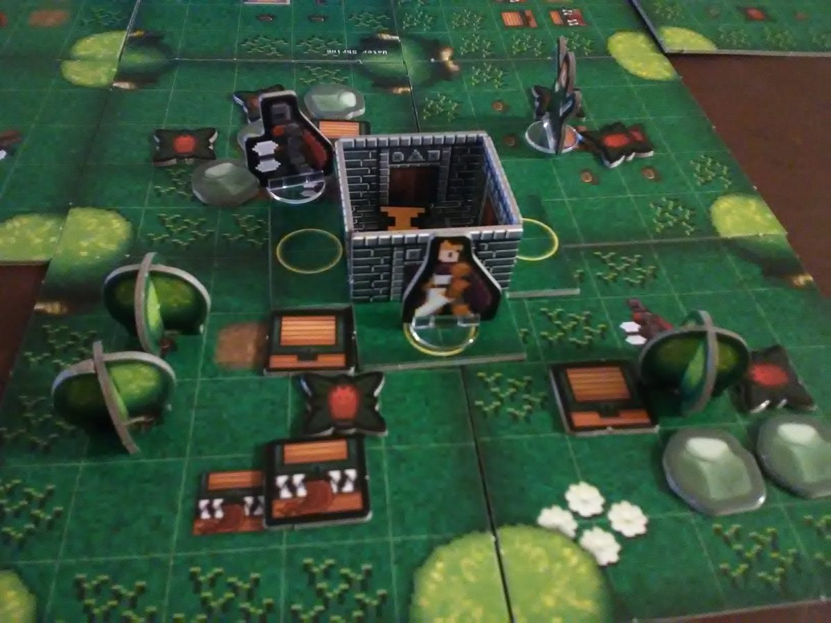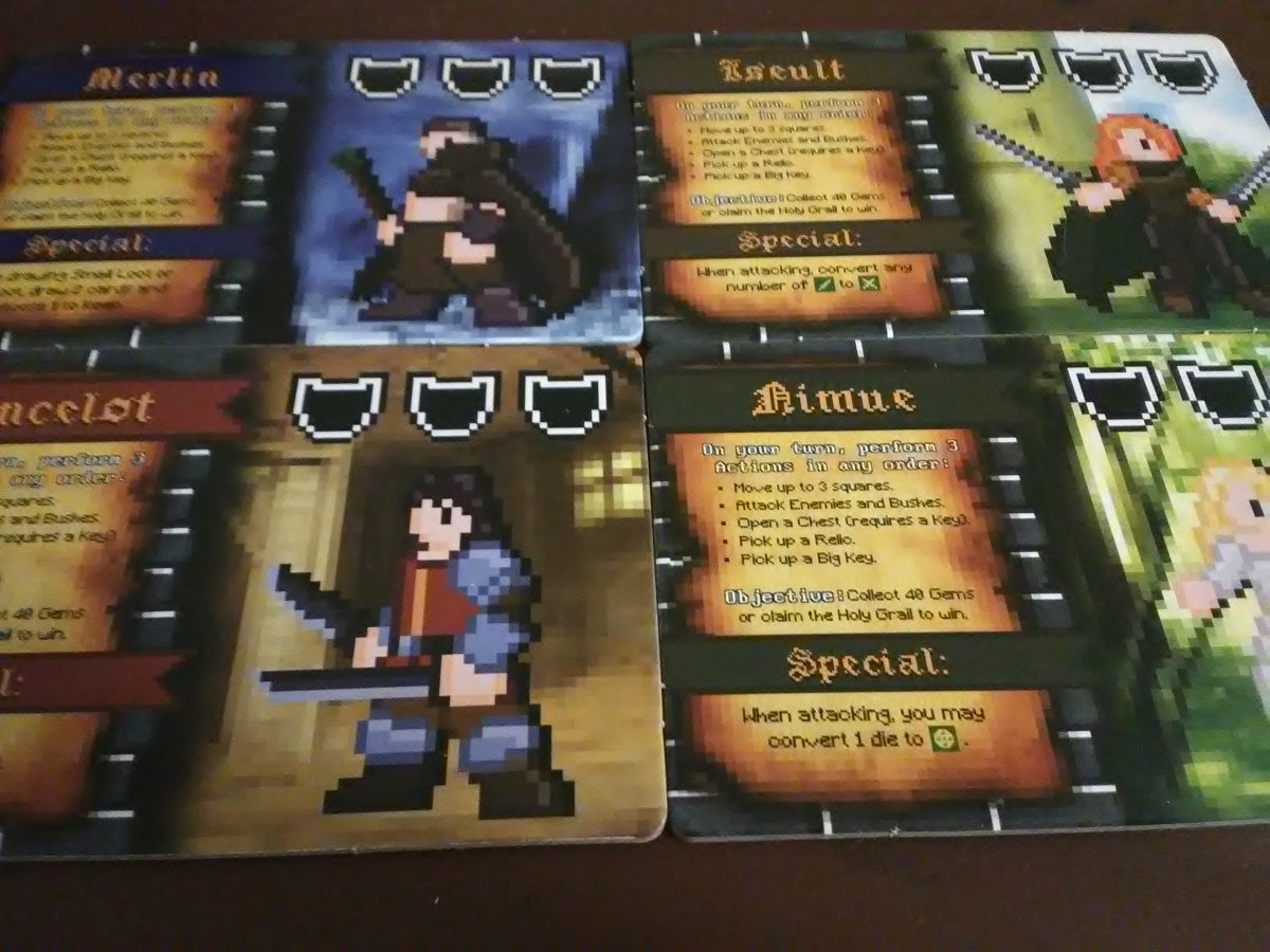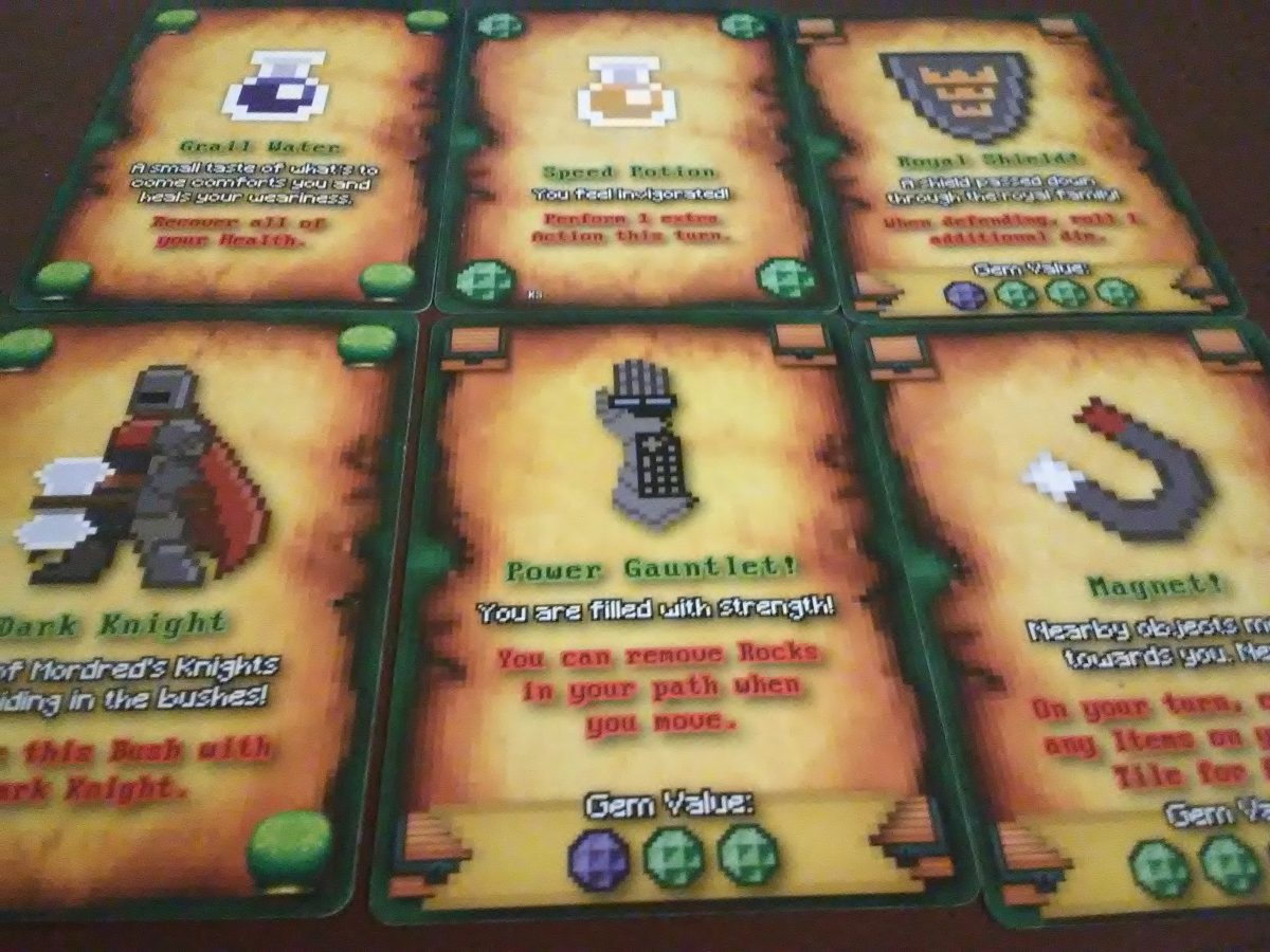 It’s hard not to smile as you first look through Super Camelot. All of the components, made up of simple cardboard standees and boards, help sell the pixel art style. The box cover comes across as more blurry than pixelated, but the castles, objects, and characters read across as appropriately blocky and colorful. Each pixel is used judiciously, to imply a lot with little effort, and from the top every object looks exactly as it would from an old CRT monitor with an NES hooked up to it. The trees are slotted together cardboard as well, just like the miniature castle at the center, containing the Holy Grail. Yes, there is a strange implication in that the characters know where the grail is at the start and are seeking for relics to unlock the way in, but these kind of logical gaps are appropriate to the bizarre logic of old NES games. Just like those games, each screen resets once you leave it, not including unlocked treasure chests.