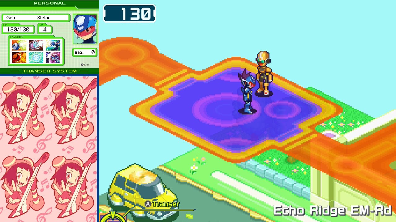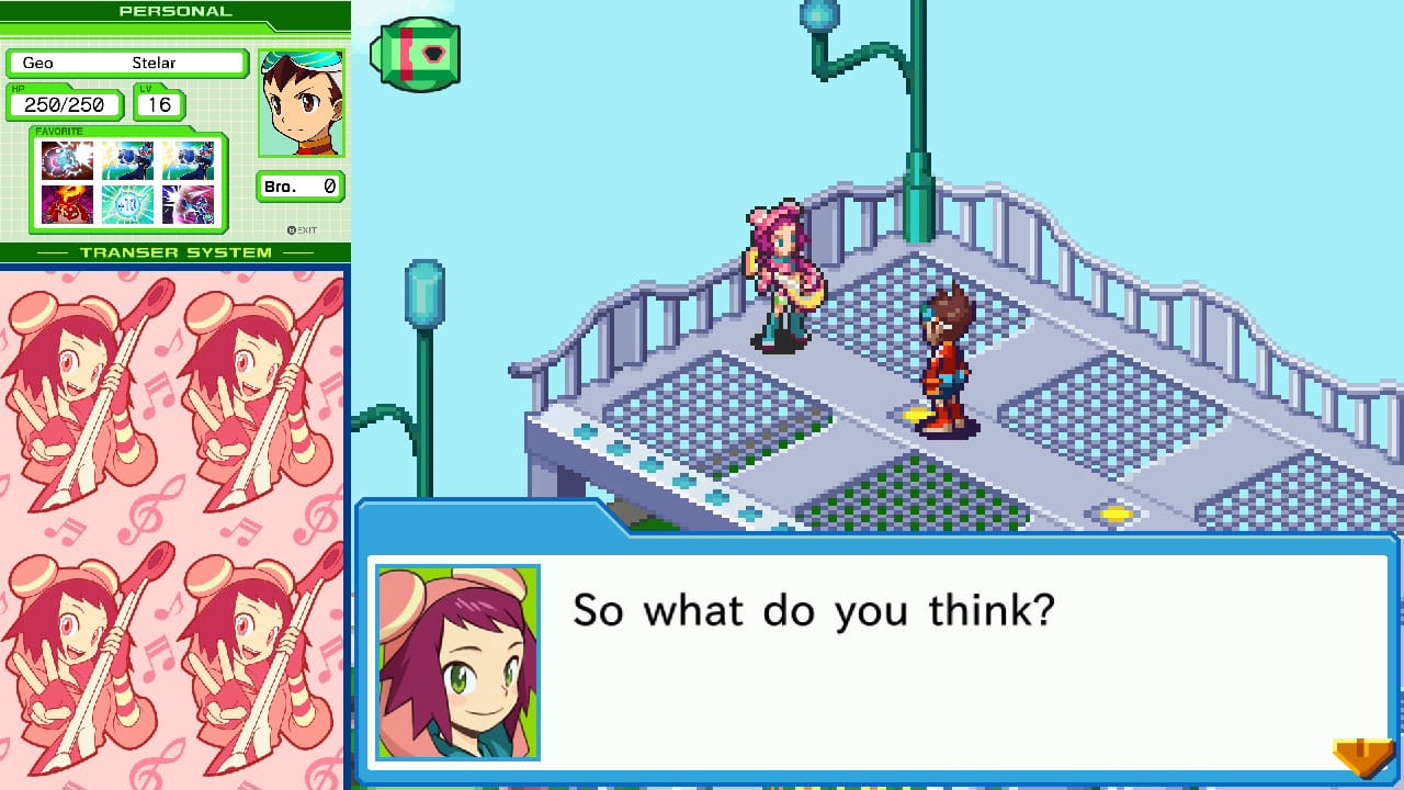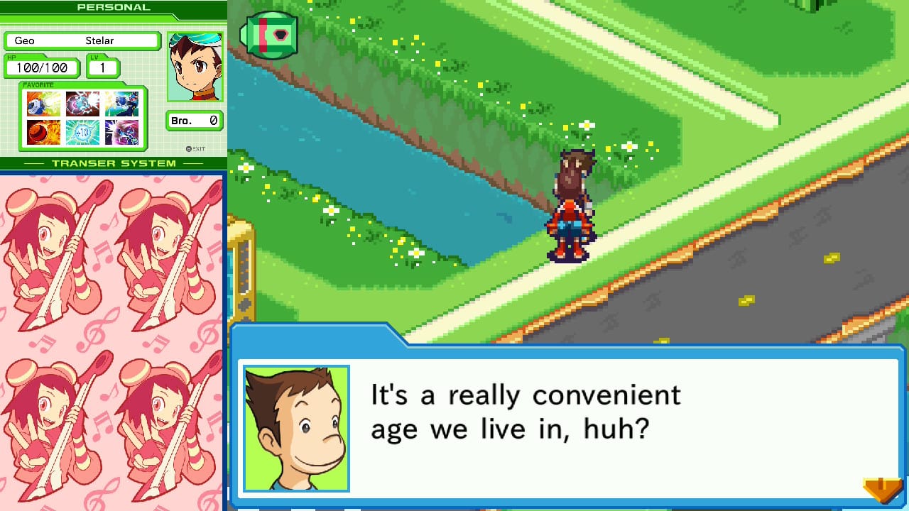 Star Force goes to great lengths to connect with you. In the original versions of the game, you could directly name the protagonist after yourself. While he's just Geo Stelar in the Legacy Collection, the games still make several other decisions to place you in his shoes directly. The Battle Network games cleanly separated the protagonist roles between Lan Hikari in the real world and Mega Man in the virtual. Star Force makes Geo the protagonist in both worlds, allowing him to directly transform into Mega Man when he goes online. You're always Geo, or in other words, the player now spends the whole game in Geo's shoes.