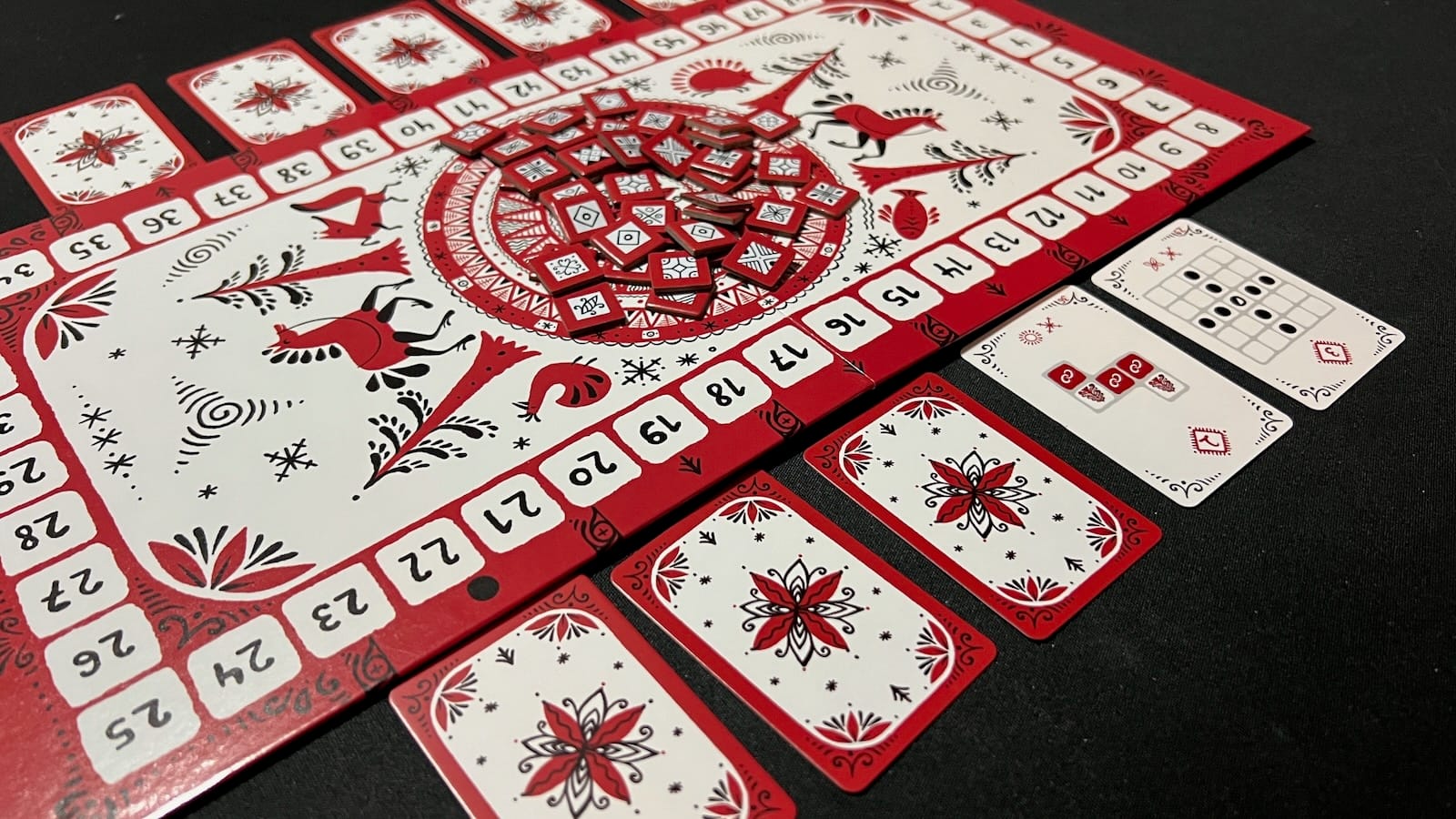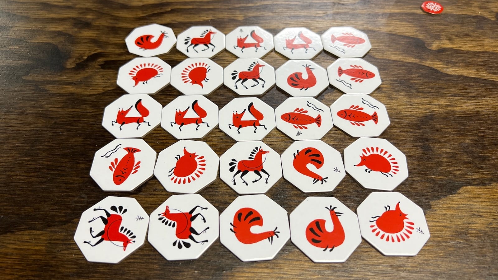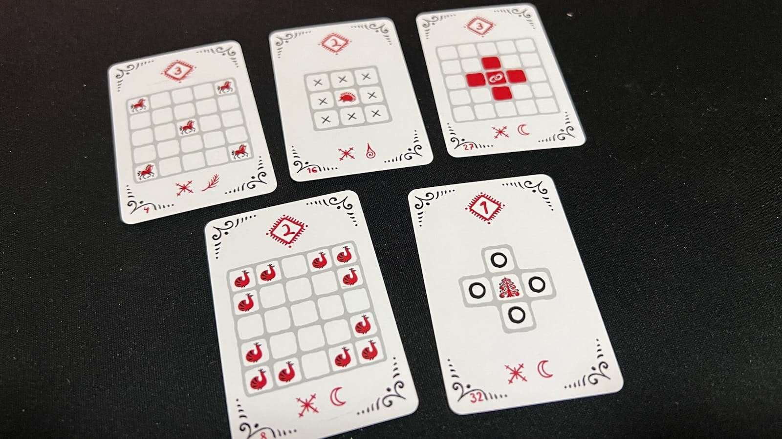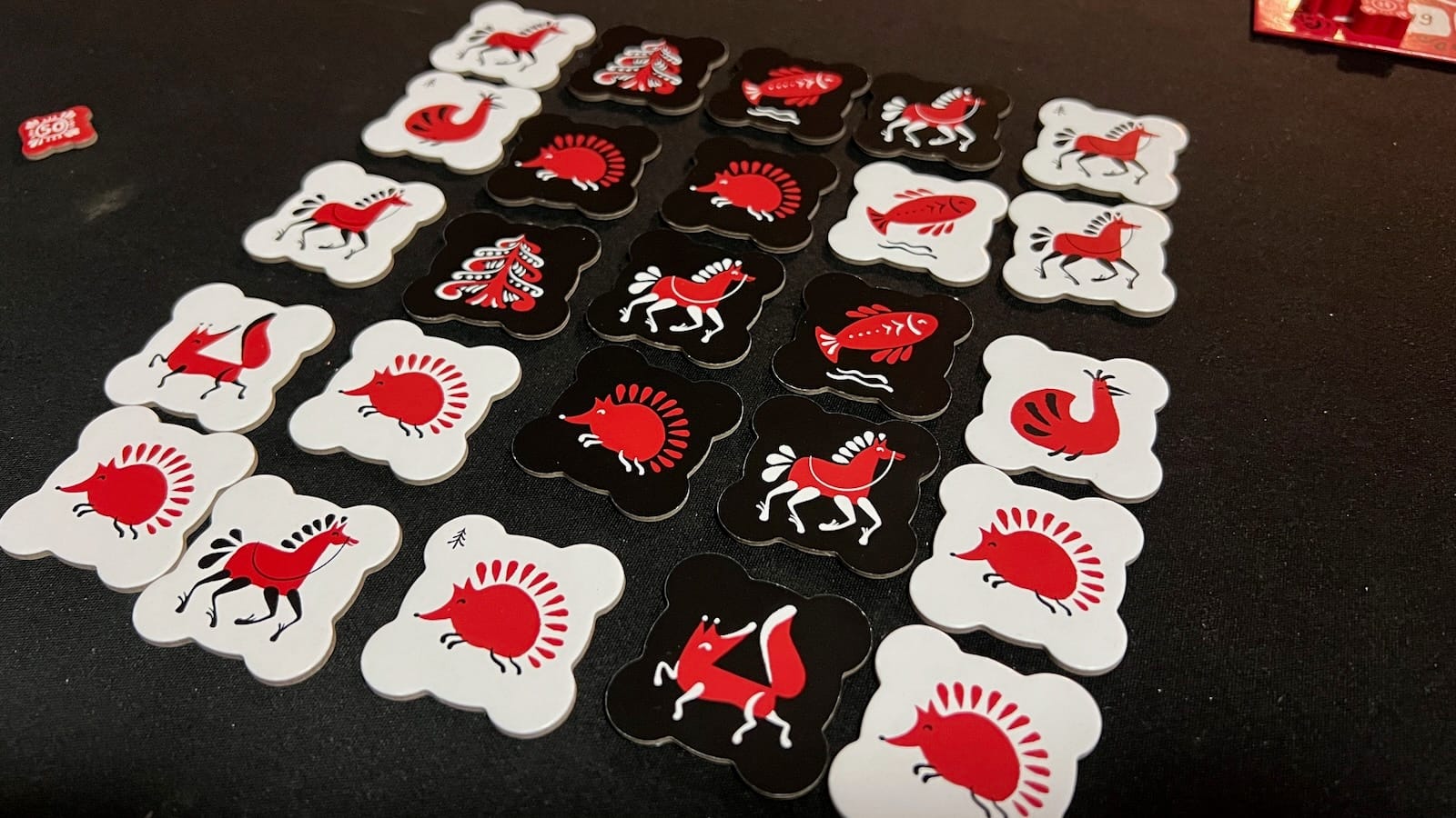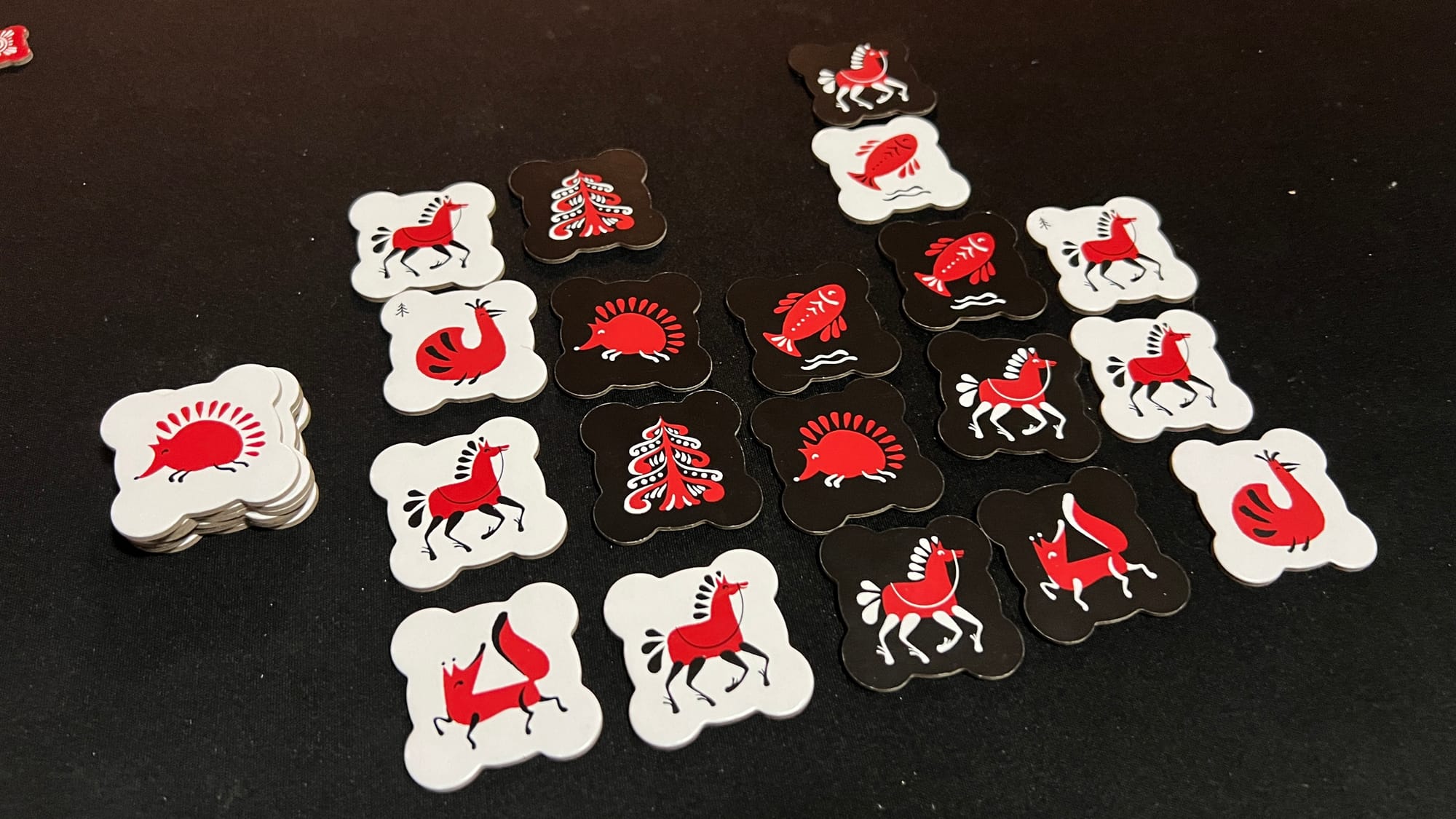 The production of Mezen is absolutely beautiful. The artwork by Maria Stenkovich is inspired by the Mezen style of painting that reached the peak of its popularity in the 19th century. The art would feature different geometric patterns and shapes while depicting the animals that were an important part of peasant life. The rule book includes two full pages outlining the history of the artform and its impact on the people of northern Russia. The art is all done in three colors, red, black, and white, and truly gives a wintery feel to the whole gameplay experience. The rest of the rulebook is also fairly straightforward to follow, despite some typos that I will write off as a translation issue. One of the hallmarks of this game is the accessibility of the design for those who are colorblind. Each player’s tiles have a unique shape, and the contrast between the dark and light colors makes it easy to distinguish which side you are on. A great design choice is featured on the scoring cards and comes in the setup of the game. Each scoring card features multiple tiny symbols that players will choose one of at the start of set-up. All the cards with that symbol will be separated from the deck and shuffled together. 10 cards will be chosen at random to use in the game, with the others being discarded. The randomness of what cards are placed where and what cards are used each game make each game unique.