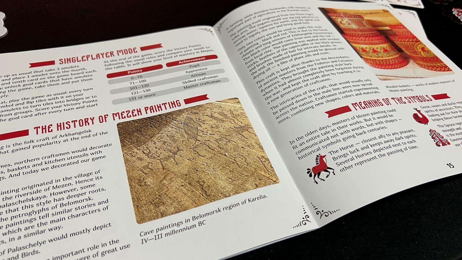 Mezen is a pattern-building game for 1-5 players from publisher Hobby World, US distributor Arcane Wonders, and designer Nikita Sorokin. The game is themed around an art style that grew out of the people living along the Mezen River in northwestern Russia. In Mezen, each player manipulates their painting, represented by a 5x5 grid of tiles, featuring various designs to score points from various scoring conditions across 10 rounds. The player with the most points at the end of the game wins!