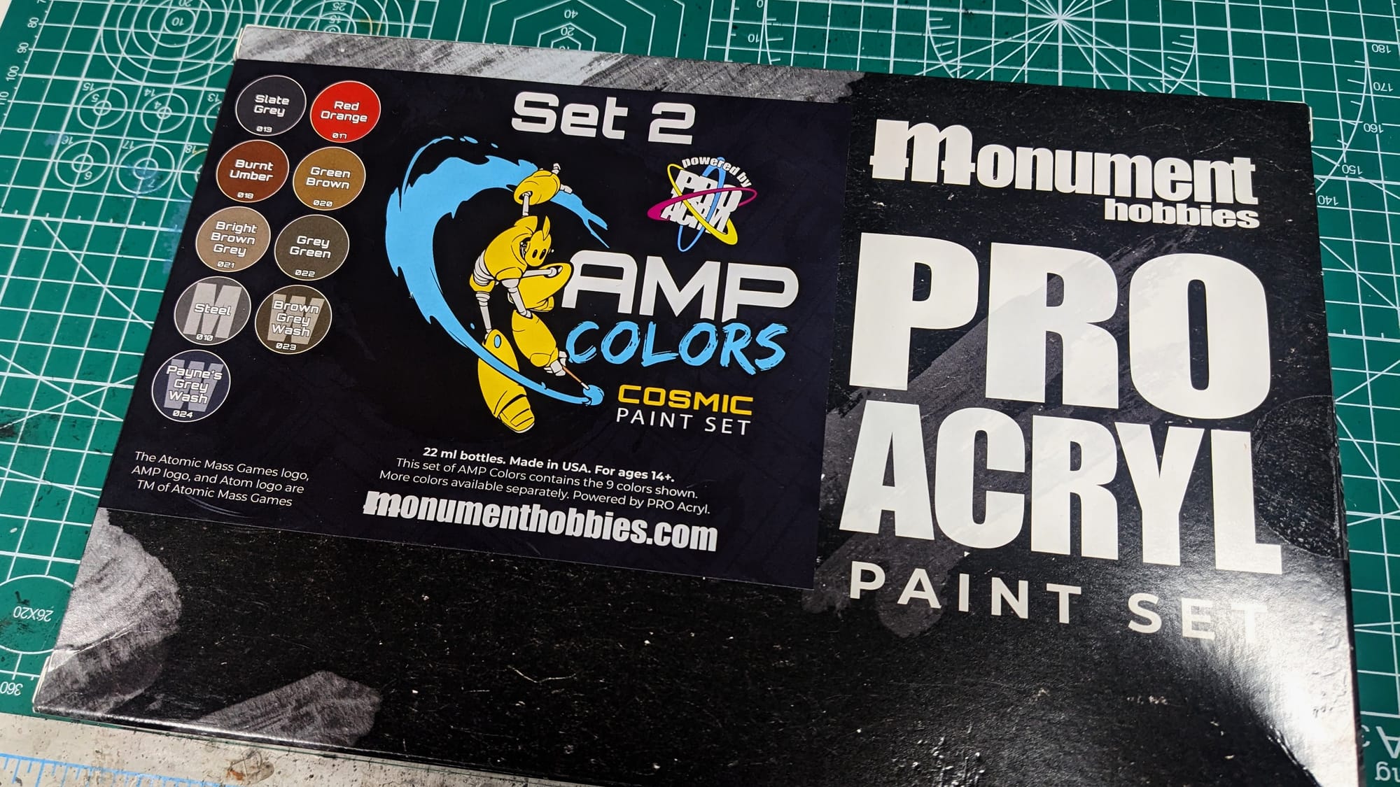 Cosmic Paint Set #2 includes the following colors: Slate Grey, Red Orange, Burnt Umber, Green Brown, Bright Brown Grey, Grey Green, Steel Metallic, Brown Grey Wash, and Payne’s Grey Wash.