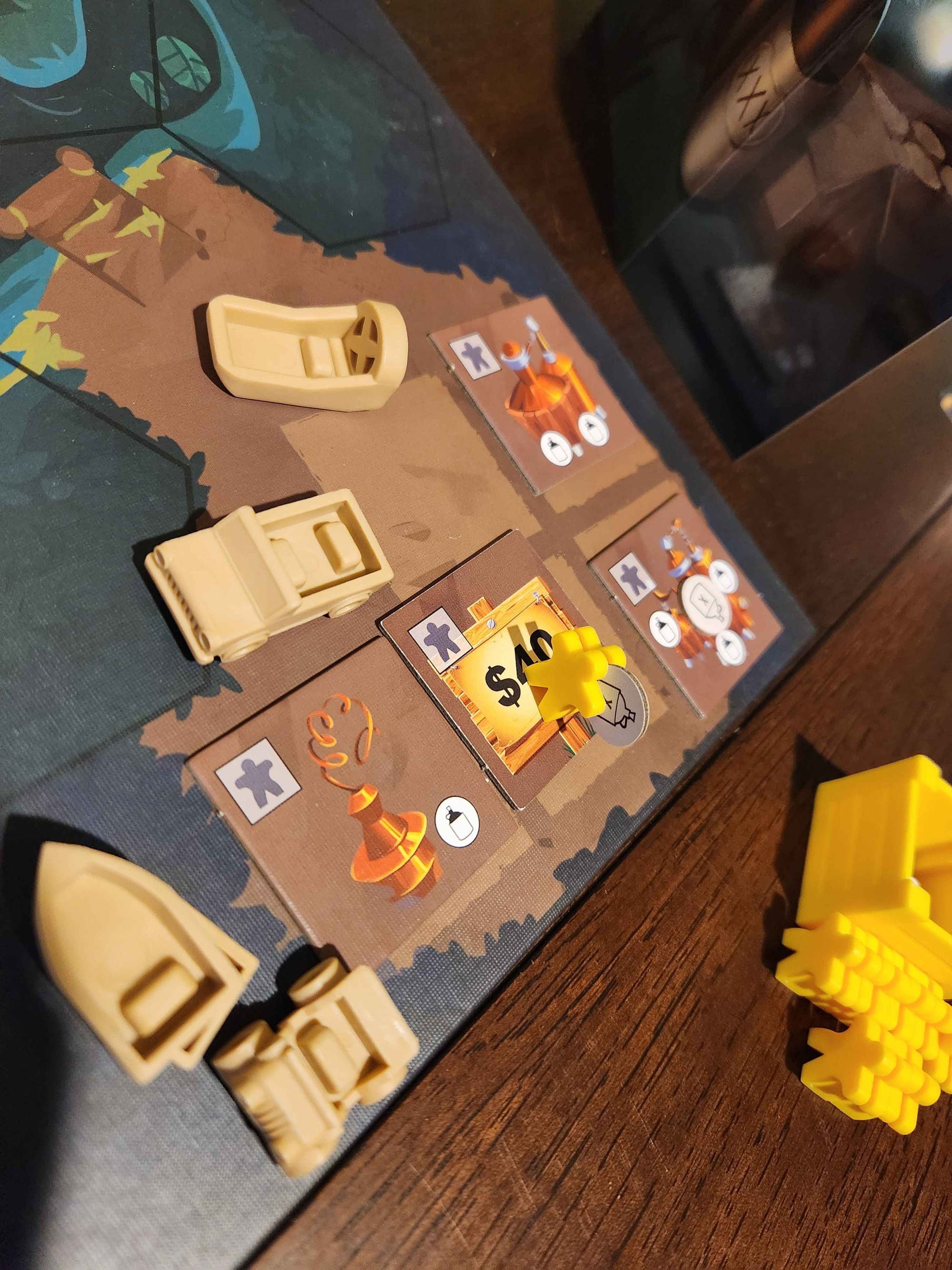 The rules update makes the movement phase much clearer and interesting enough to talk about. There’s more clarity around what the special spaces are - Pappy’s tavern and your camp area. The bridge to Pappy’s island isn’t actually a complete barrier to rowboats, which adds a lot of options for their use. Additionally, despite the art, the two hexes on Pappy’s island that look to be entirely land are specified as land and water. This small change means there are more spaces where a vehicle (mostly rowboats) can get a Shiner near enough to Pappy’s tavern that they can hop out and deliver moonshine without a round sitting in the path of police or gators. The extra routing options are extremely useful and helpful where the biggest rules clarification comes into play: Shiner movement. The movement of Shiners is now explicitly laid out and rearranging is now defined! Rearranging is the clearest winner of the rules update. Whereas before it wasn’t clear if rearranging to leave or enter vehicles cost the Shiner their movement, it is now defined to NOT cost movement. This means that if you have a chain of vehicles with good placement, you can get from camp to tavern in one round.