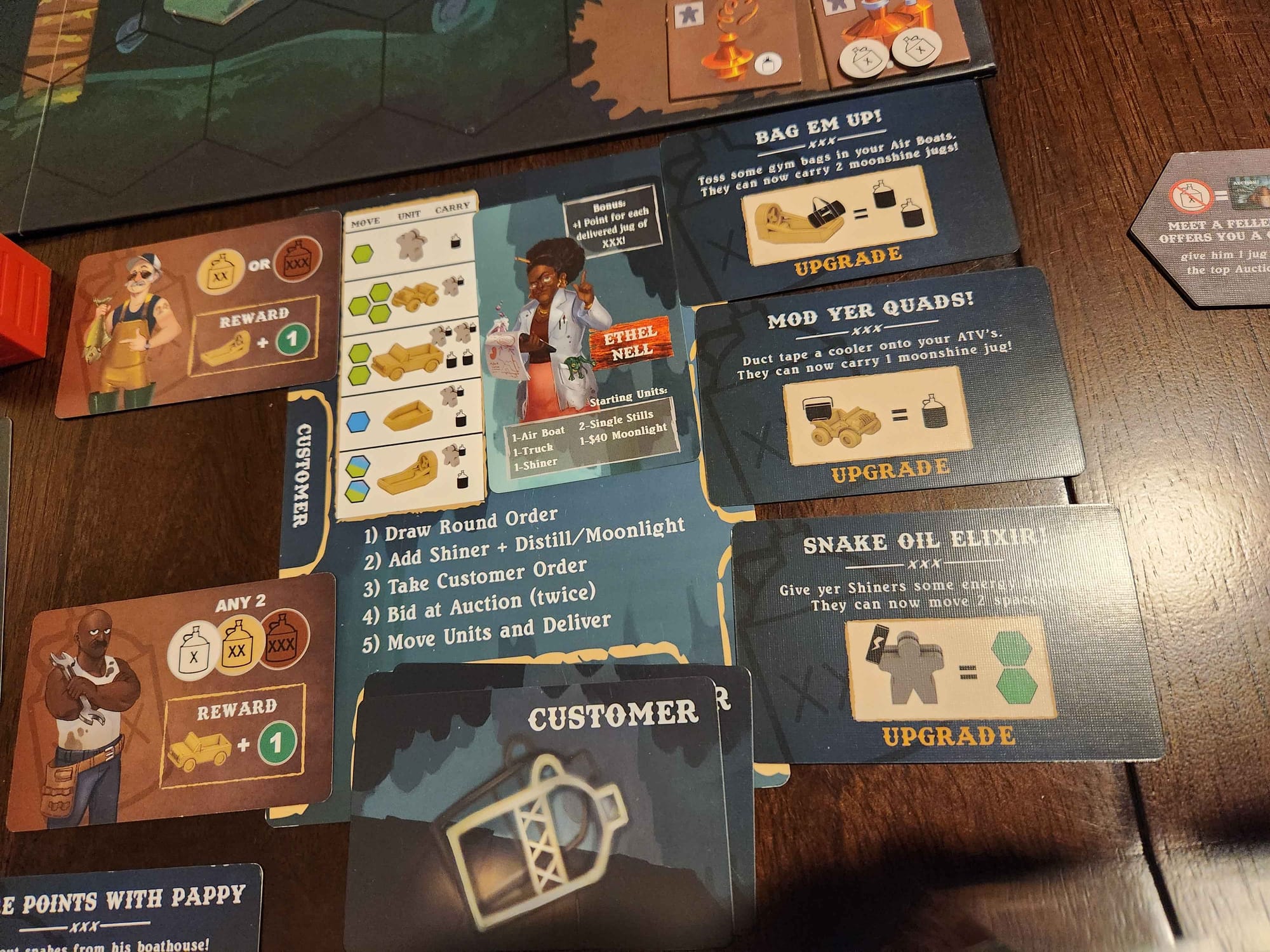 Before you can make any moonshine, you need to outfit your camp. Every character starts with a slightly varied camp with different starting vehicles, things to do at camp (running stills or moonlighting for cash), and zero, one, or two Shiners (workers). Every round, you’ll get an extra Shiner to join your camp as your cousins hear that you need help. After that, there will be a two-round auction to outfit your camp, upgrade your movement, or grab extra points.