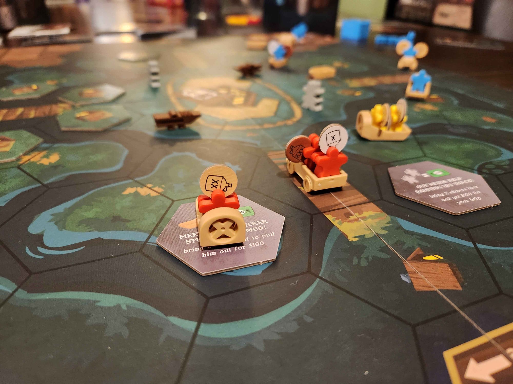 So let's say you’ve gotten through a round or two. At this point, you’ve leveled up your camp, gotten a few more Shiners in your crew, and maybe even started your way towards Pappy’s tavern. There are swamp tiles that you might be thinking about looking at. Some lock you in place until you achieve them, others are optional but have a cost that gives you some small advantage. Each is going to require you to fulfill an objective to collect the tile and the points it represents. Some require you to lose items like the airboat that got you to the hex or some cash. They can be quite dangerous in the early game if you suddenly can’t leave a spot and need to send a Shiner to rescue the trapped cousin. But, in every game I played, swamp tiles were the deciding factor in who won, so you should pick them up when you can tolerate the risk. Here’s a part where the rules update did a lot of work. The extra definitions made it more clear when you have to bring pieces to the spot, e.g., Shiners helping someone paint their shack, versus losing pieces, e.g., sacrificing moonshine for a shiny new truck.