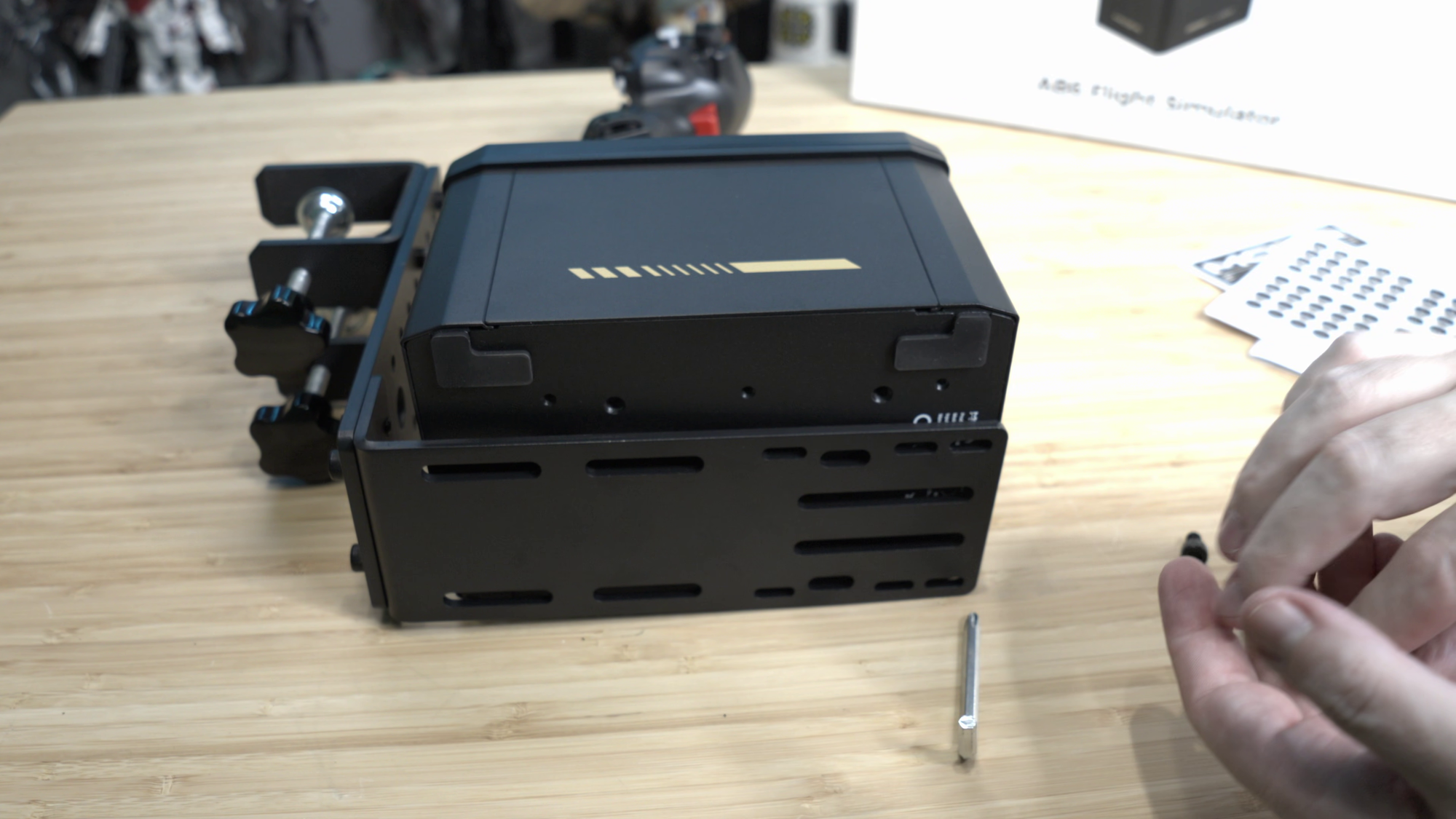 Also inside the box is a metal mounting system. This clamp-based system to mount everything arrives disassembled for shipping, but they’re all metal and incredibly sturdy. It consists of two clamps that connect to two longer cheese plates via four included hex bolts that thread into the plate. From there, you attach a second plate to create an L shape that you can then clamp to the underside of a desk. The fact that this included, whereas I had to buy a mount kit for literally every other similar system I’ve owned, is a welcome surprise. On the bottom of the base are a whopping 10 screw holes, as well as four anti-slip pads if you don’t intend to lock it down onto something. I wish I could say this mounts cleanly onto my YAW3VR, but that plate is a horrible mess of holes that align with absolutely nothing. Not the fault of the MOZA – the underslung clamp system works perfectly.
