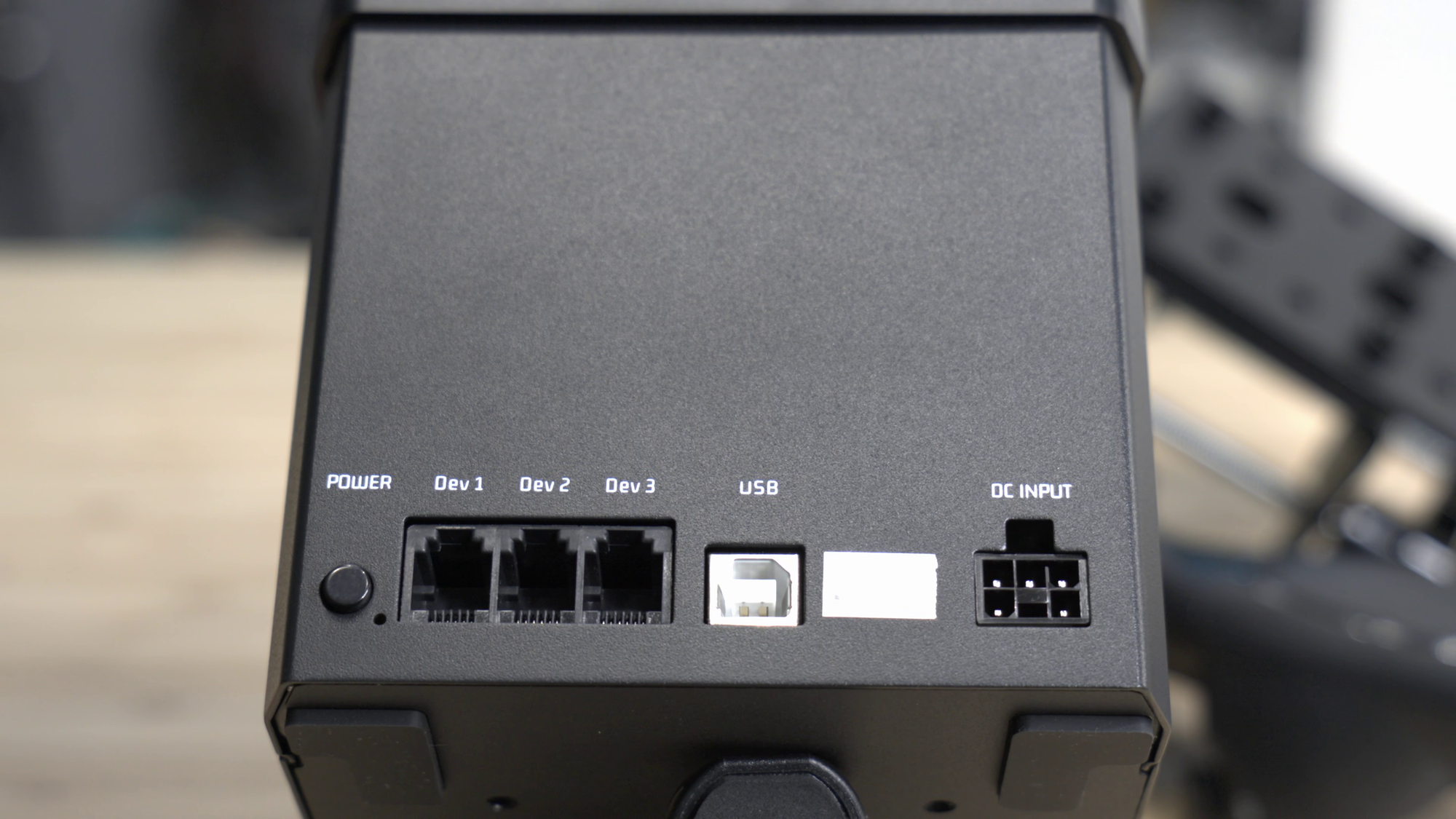 In the rear of the base, you’ll find the power connector (a DC input style you’d normally find inside of a PC power supply, not the usual cannon plug), a USB Type B connection port (it’s type A on the other side), and three RJ-11 ports for accessories. That means if you eventually invest in the MOZA MTP Throttle or MOZA MRP Pedals to further increase your overall immersion, they’ll connect cleanly to this base.