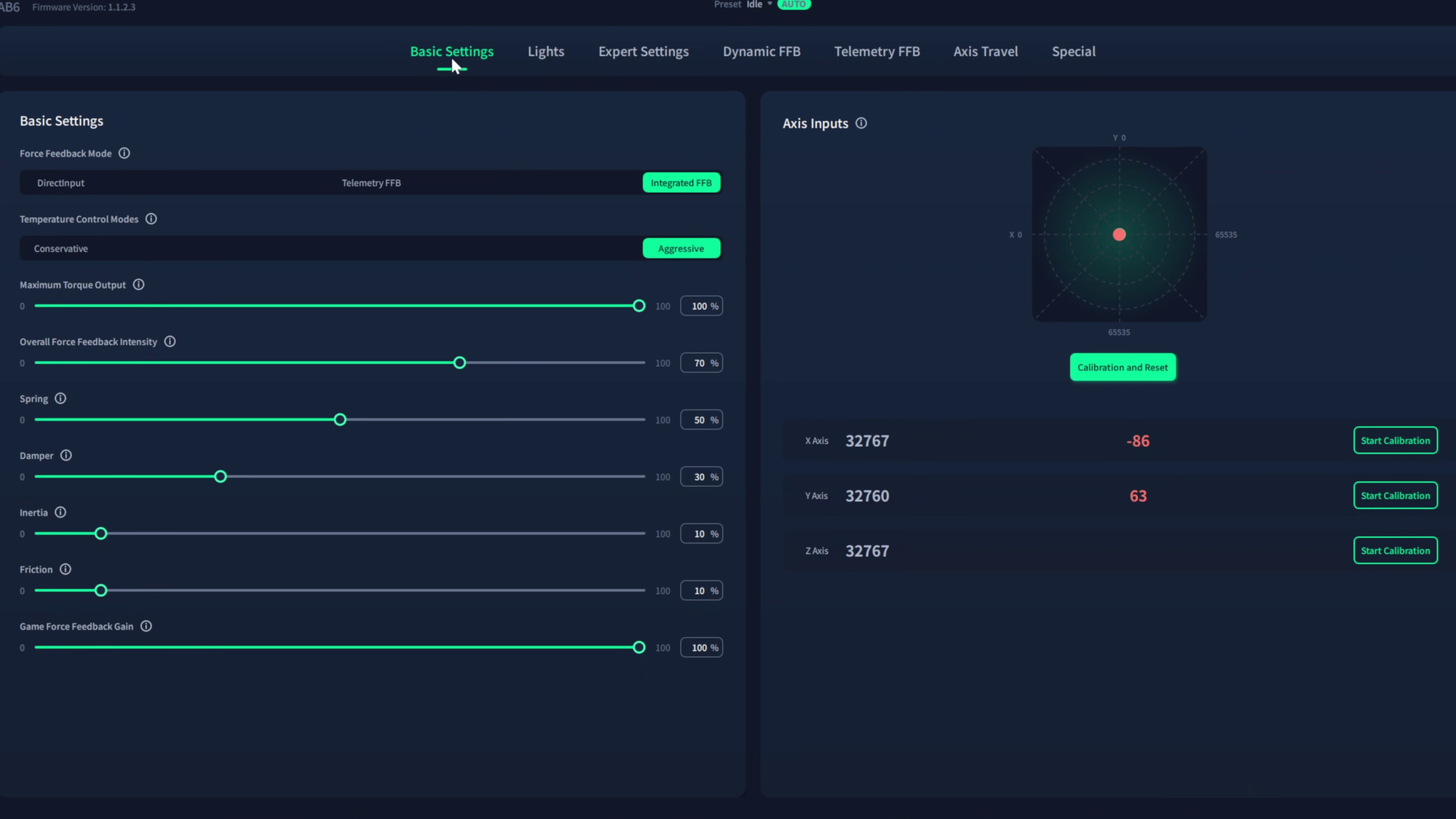 Heading into the software realm, there are a number of options to adjust in MOZA Cockpit, the software for the platform. You don't have to keep this software running during gameplay, as these tweaks are global, whereas the adjustments you make in a game just affect that specific title. There are quite a few adjustments you can make inside the MOZA Cockpit software. Across the top, there are Basic Settings, Lights, Expert Settings, Dynamic FFB, Telemetry FFB, Axis Travel, and Special. Inside each tab are options like Maximum Torque Output, Overall Force Feedback Intensity, Spring, Damper, Inertia, Friction, and Game Force Feedback Gain. Similarly, you can also look at the current X, Y, and Z inputs, where they are currently registering, and you can calibrate each axis individually from here. If you don't want to play with those yourself, you are also able to Auto Calibrate to center everything all over again. Let’s look at the rest of the tabs.