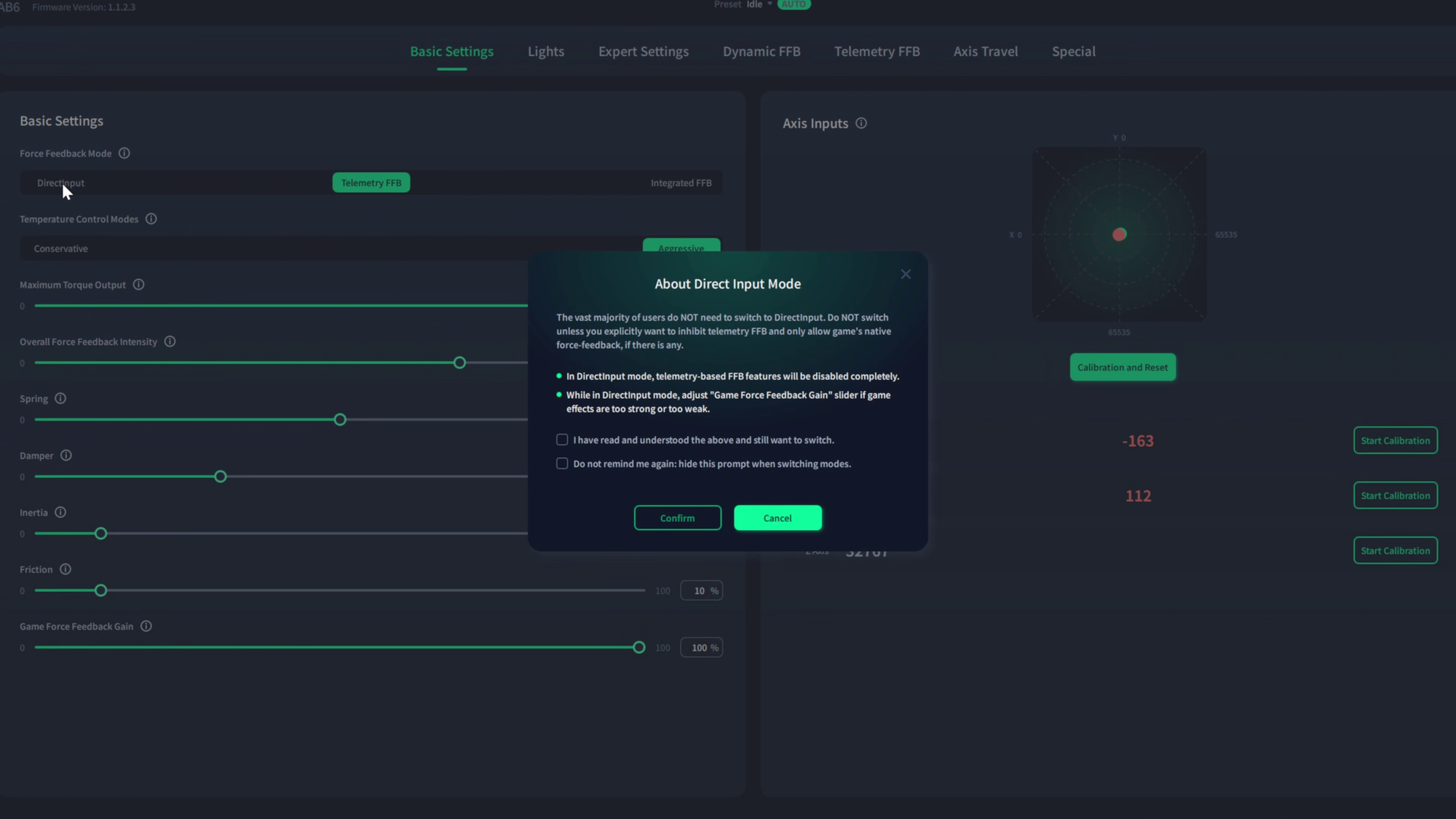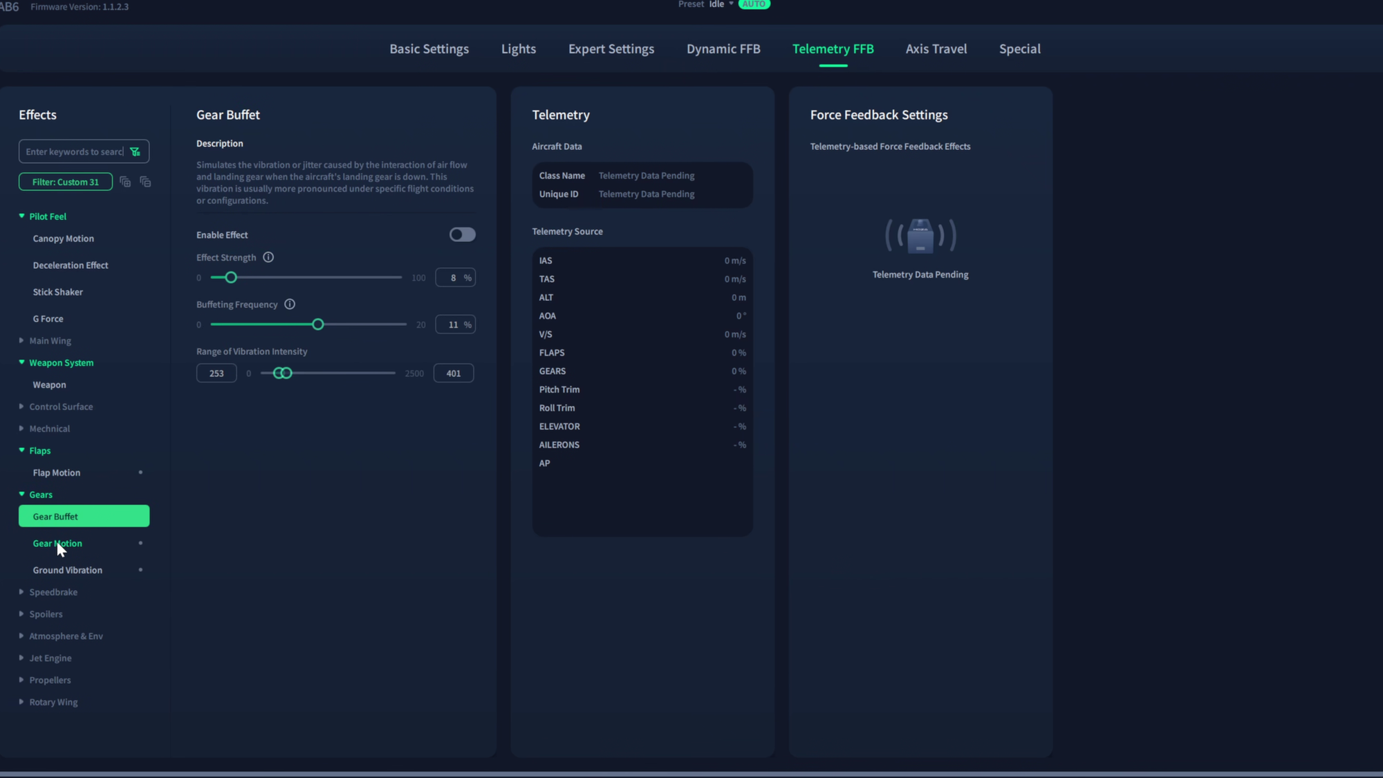 Circling back to that first tab, within it is an important slider. Not every game is coded for Force Feedback (Direct Input). This first setting uses that data coming from the game to directly map it to the stick, but if the game doesn't have that data, you can switch to Telemetry FFB. Telemetry is the data the game provides about the position and movement of your craft, and the stick will do its best to interpret that game data and provide some level of force feedback response. Integrated is the best of both worlds, trying to use both sets of data to provide the most realistic responses to game stimuli. It's the setting I use unless there's an incompatibility issue. Let’s talk about how that plays out in practice.
