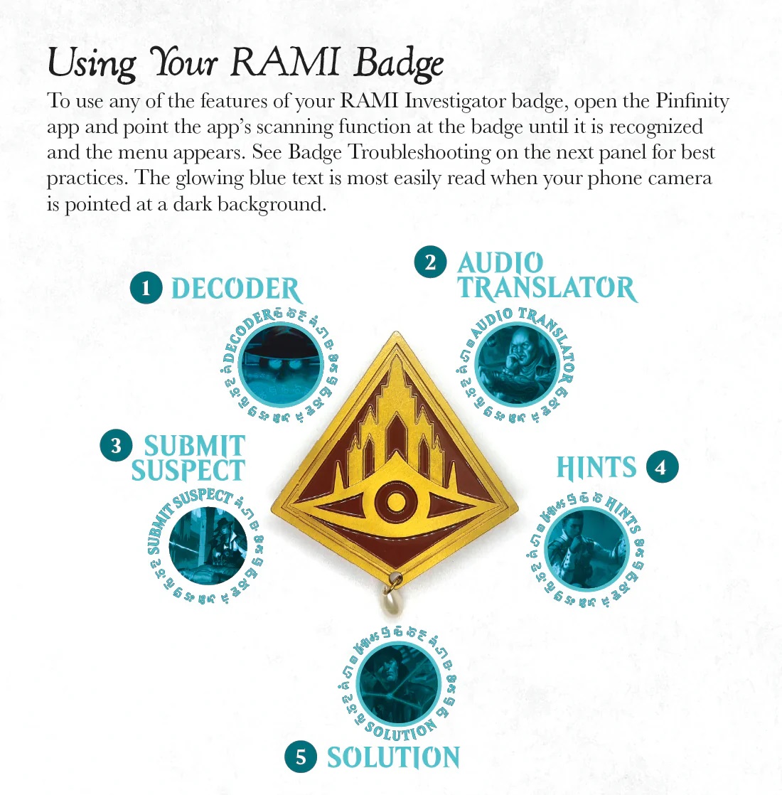 What doesn’t work particularly great is the app used to advance the game. I have seen other games use cards or envelopes, but this game relies on the augmented reality Pinfinity app. If you’re unfamiliar with Pinfinity they make collectable pins that can be scanned by the app for additional features. Here, the RAMI badge is used by the Pinfinity app to bring up the menu, provide information, and the questions for the case. I had a lot of trouble getting the Pinfinity app to scan the RAMI badge until I put the badge on a blank sheet of printer paper. After that, the app worked great and I had no problems from that point on. As neat as the augmented reality functions are, they are gimmicky. As a whole, the Pinfinity app didn’t add much to the game other than some technical problems. This is a nice concept, but it needs to either be improved or removed entirely.