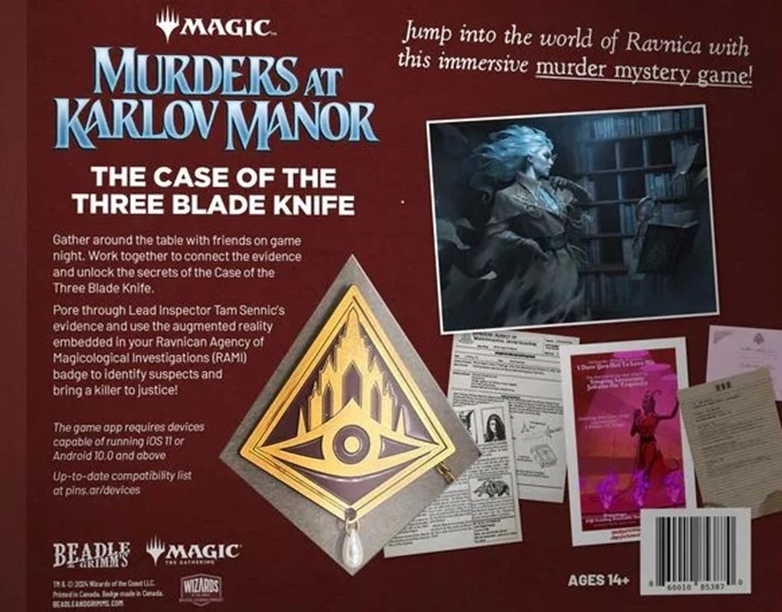 From the fine purveyors of nerdy products, Beadle and Grimm, comes Murders at Karlov Manor: The Case of the Three Blade Knife. What is The Case of the Three Bladed Knife? It’s a murder mystery in a box game that was released alongside the Magic: The Gathering set Murders at Karlov Manor. Murders at Karlov Manor is a set all about solving a series of murders, and this game challenges you to solve a different group of murders currently vexing the detectives of RAMI. (See the very long review tagline) So, this is a unique crossover product for those who love murder mystery games and Magic: The Gathering. I don’t understand why Beadle and Grimm make the products they do, but every time they release something it is interesting and unique. When I saw they were releasing The Case of the Three Bladed Knife, I knew I wanted to check it out. Good or bad, at least Beadle and Grimm are doing something different.