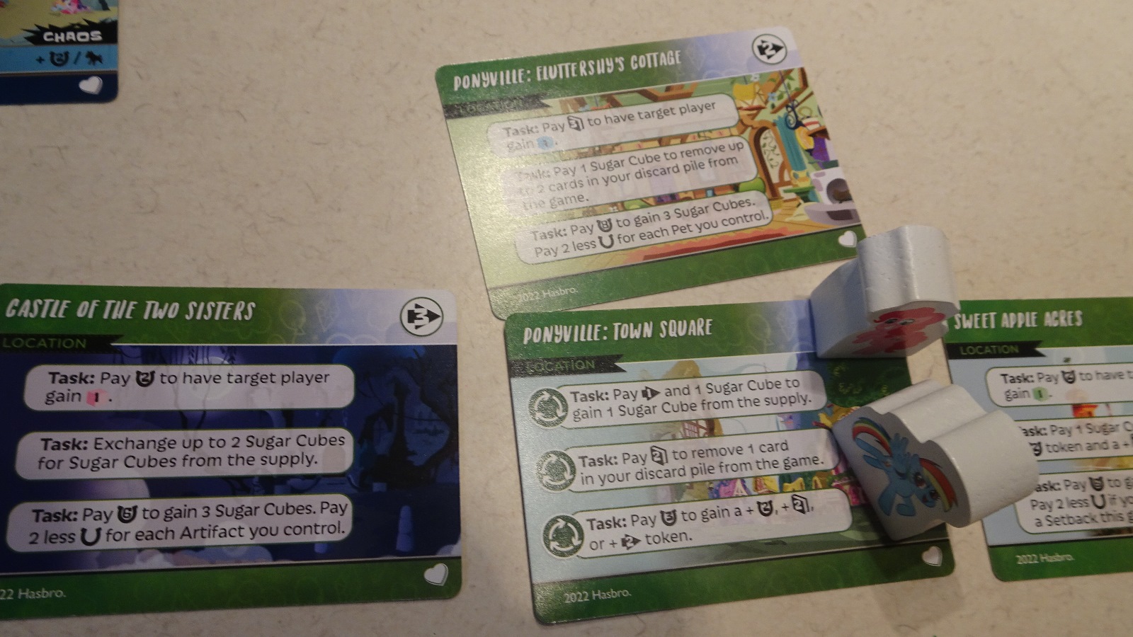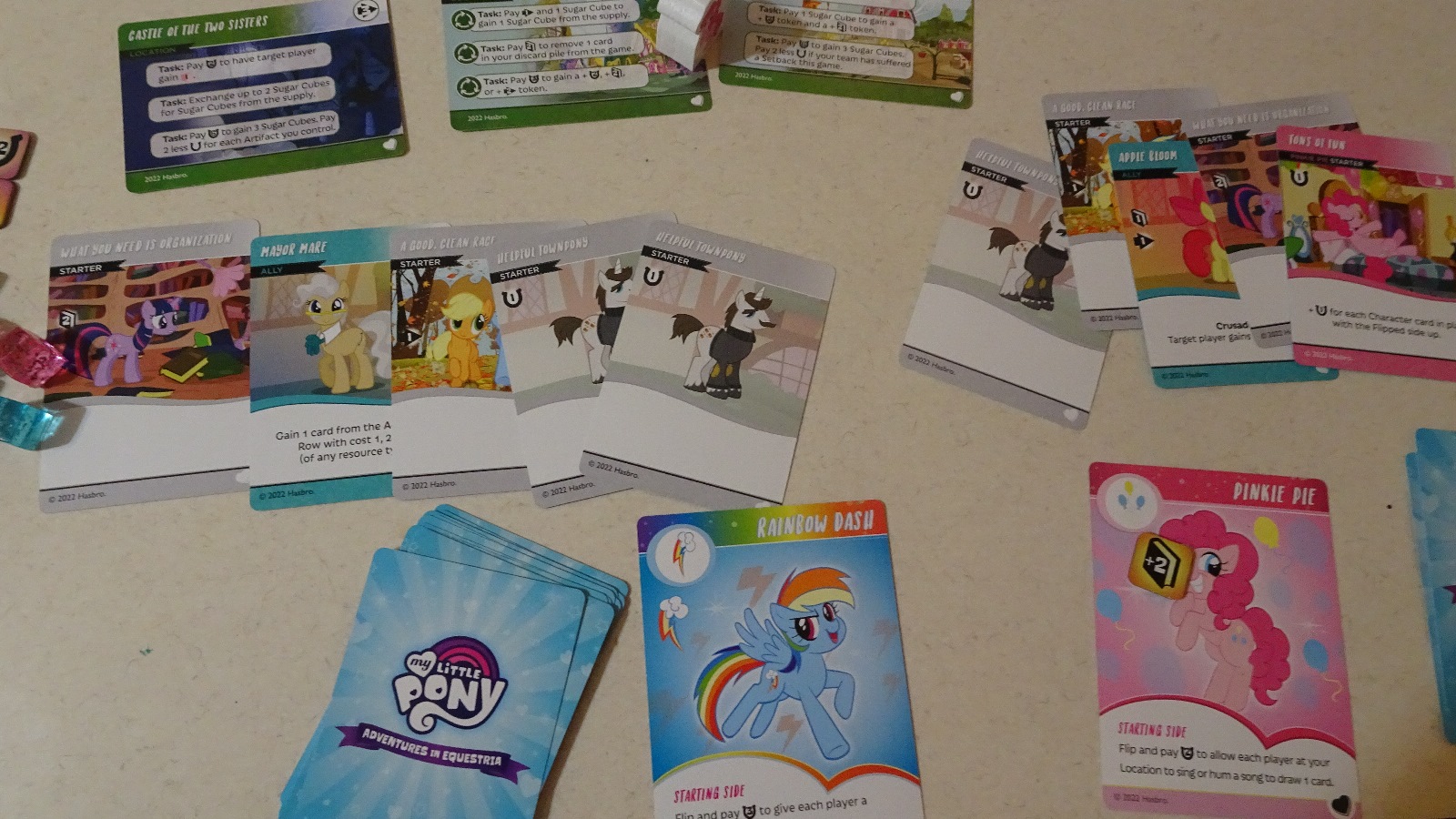 Problems arise two fold – one, the game is just pretty hard, along with a lot to keep track of. Experienced, adult gamers will be able to start winning after a few games, but given the MLP theme, kids are going to be absolutely blown away by the challenge, if they could handle the token management to begin with. Secondly, the game is a ‘deck builder’ as it claims on the box, the problem though is the new cards are typically fairly expensive, they aren’t that much better, but the biggest is there simply is not enough time. Of course by the end of the game players will still have around 5-10 new cards in their deck, but that flashy new card is going to see action about one time, and this is where it’s a little disappointing. There were several games where expensive 7,8,9 cost cards simply could not be bought, or when they could, it was too close to the end to be worth buying.