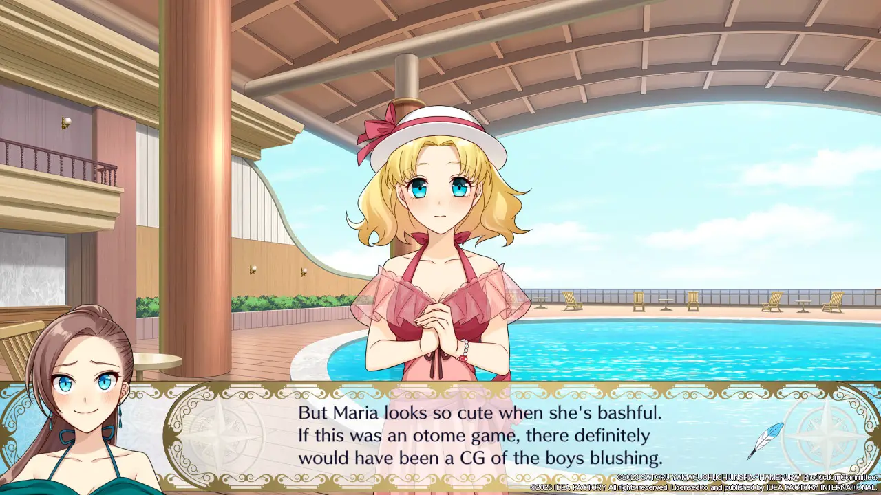 My Next Life as a Villainess: All Routes Lead to Doom! -Pirates of the Disturbance- is a dating sim/visual novel based on the anime based on the manga based on the light novel My Next Life as a Villainess: All Routes Lead to Doom!. The story follows Catarina Claes, a noble girl who, after falling and hitting her head, remembers her previous life as a high school girl. She and a friend would obsess over an Otome game (story based games that are generally targeted towards women) called Fortune Lover. In Fortune Lover, the player takes on the role of Maria Campbell to woo the various boys, who each have an “I can fix him” energy about them. However, after truck-kun does its thing (long story, it’s a genre staple somehow), our heroine is reincarnated as the villain of Fortune Lover, Catarina, who dies or is exiled in just about every ending. Hence the lengthy title. Over the course of the story, Catarina changes the lives of each of the characters simply by being a nice person. Eventually, all of the characters, including the girls, fall in love with her. Catarina realizes none of this and is constantly trying to set her friends up with each other in order to avoid her doom. Hilarity ensues.