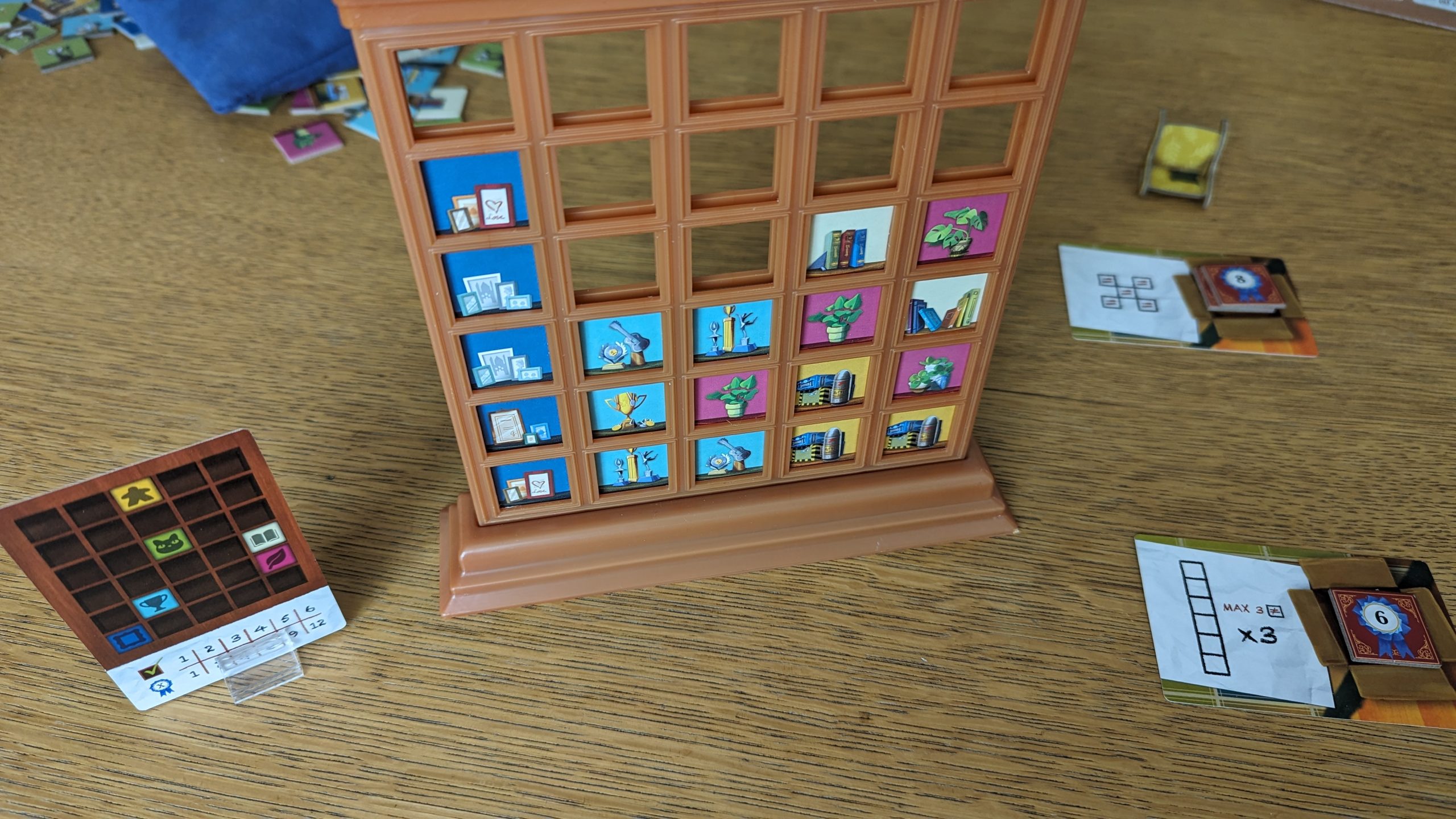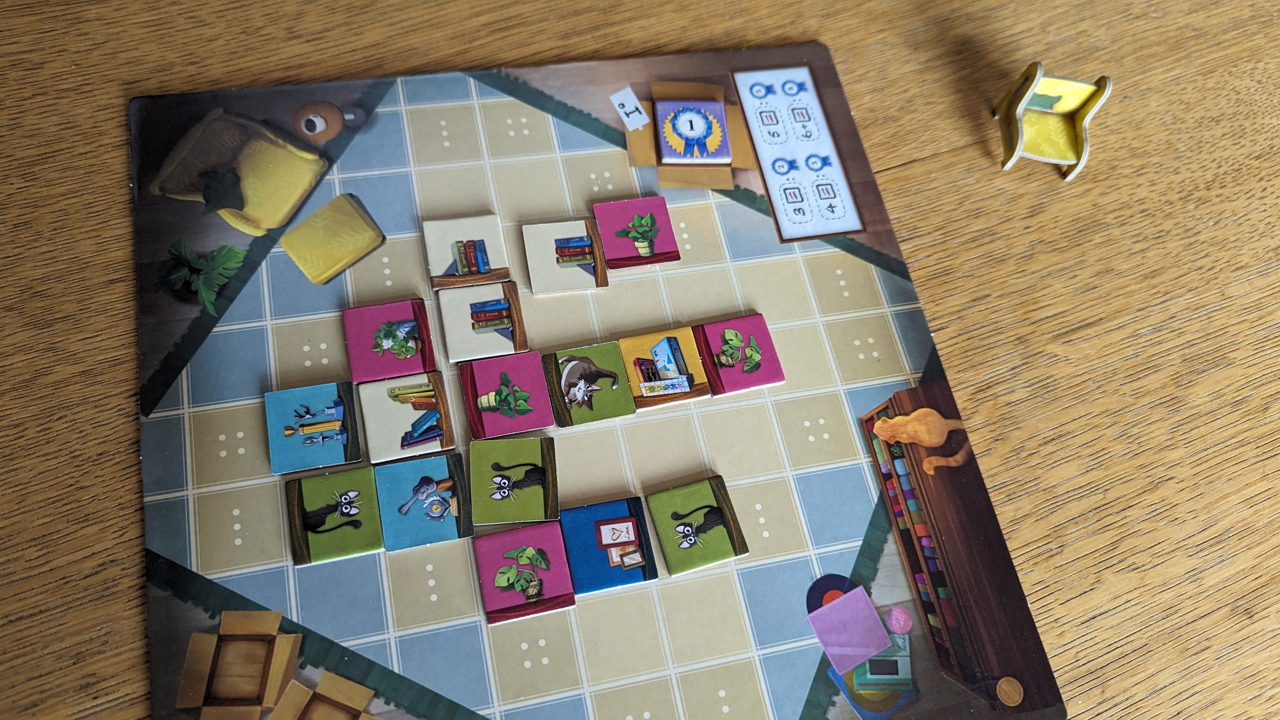 The core gameplay of My Shelfie is almost stultifyingly simple: on your turn, draft up to three tiles in a line that have at least one free side from the main board and then drop them into one column of your totally not a Kallax Connect 4-style tableau. Things get spicy because you’re racing the other players to complete the two public objectives first while also attempting to get all your private objective placements. While you’re at it, if you can get a couple 6 like-tile color groups together, you’re doing great. Only you won’t, because the two objectives are fundamentally incompatible, or that one gray tile you were really depending upon got snagged by another player just because it helped prop up the cat they needed a square higher, but that’s okay, because scoring in My Shelfie is nothing if not generous.