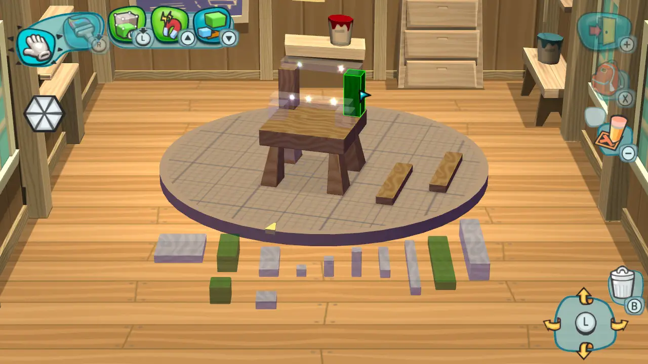 Once you have everything you need, it’s time to head to the workshop and get building. You make literally everything out of wooden blocks, which will highlight green if they’re part of the blueprint. The place you need to put the block also highlights green, so it’s very paint by numbers. Speaking of painting, that’s one of the uses of essences. You can also place them on what you already built as objects, but painting is a bit more fun. You’ll probably have to do a bit of both, as a client usually wants more essences in an object than there are blocks to paint.