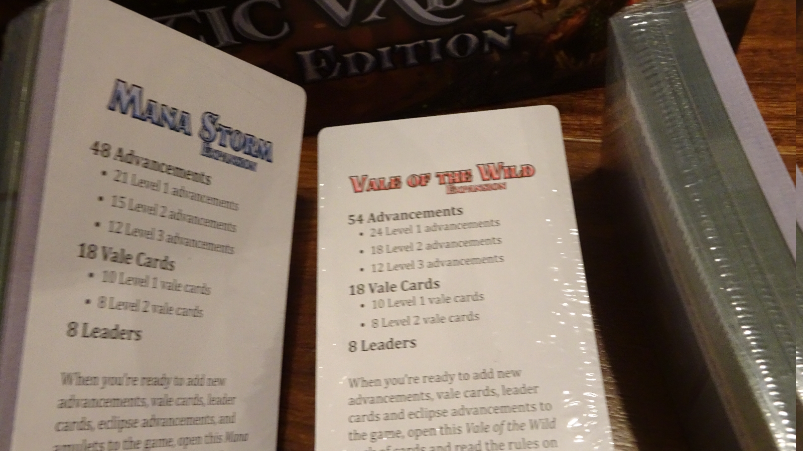 Mystic Vale: Essential Edition is a 2-4 player game where players slowly modify their deck by modifying their very cards through see-through inserts that ‘over write’ the card through their so-called “Card Crafting System”. This Essential Edition contains the base game as well as the first three expansions, as well as a storage box and a much needed play mat.